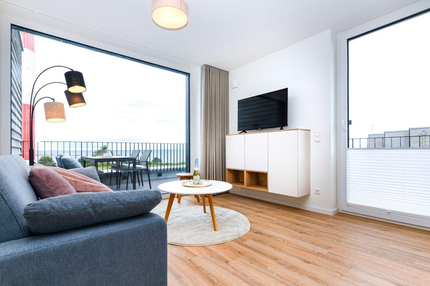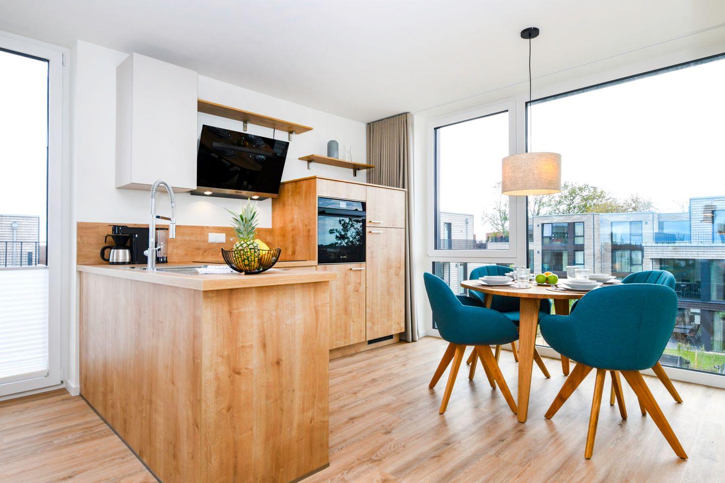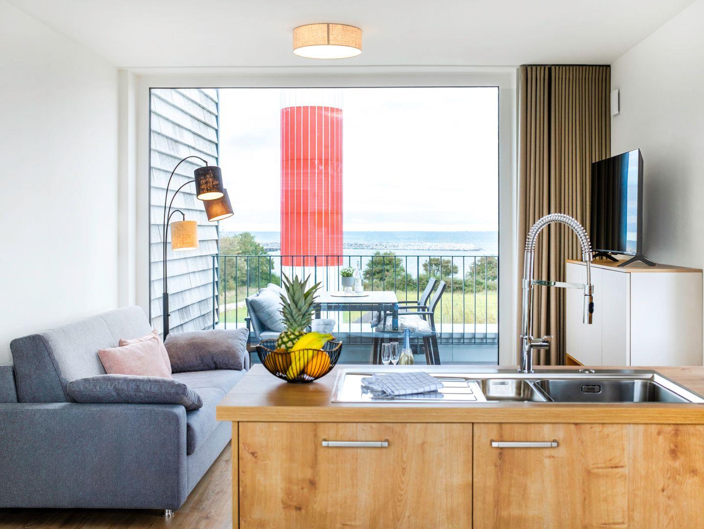 Der helle Wohnbereich verbindet zeitgemäßes Design mit hochwertiger Ausstattung. Bodentiefe Fenster schenken dir viel Licht und führen direkt auf die große Dachterrasse – dein Platz für Sonnenstunden und Meerblicke. In der offenen Küche findest du alles, was du brauchst: moderne Geräte mit Induktionsfeld, Backofen mit Heißluftfunktion, Geschirrspüler laden zu gemütlichen Kochabenden ein. Ob ein sonniges Frühstück oder ein schönes Abendessen mit Blick aufs Meer – hier genießt du echte Wohlfühlmomente.