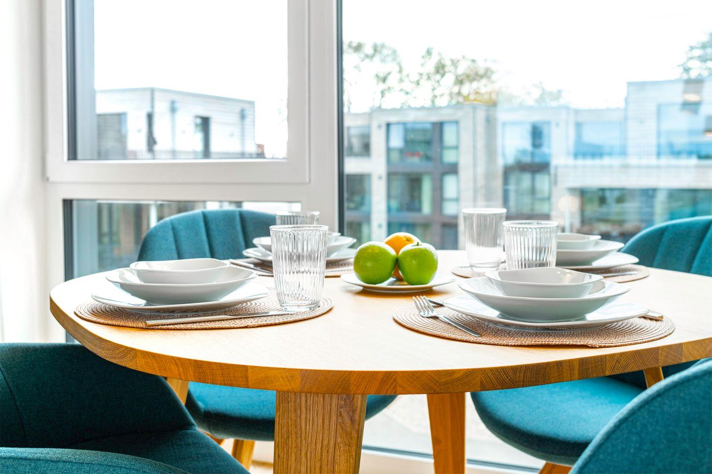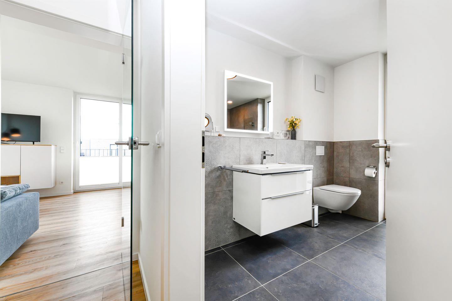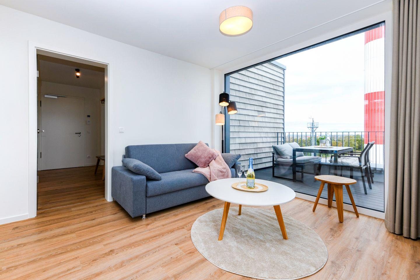 Der helle Wohnbereich verbindet zeitgemäßes Design mit hochwertiger Ausstattung. Bodentiefe Fenster schenken dir viel Licht und führen direkt auf die große Dachterrasse – dein Platz für Sonnenstunden und Meerblicke. In der offenen Küche findest du alles, was du brauchst: moderne Geräte mit Induktionsfeld, Backofen mit Heißluftfunktion, Geschirrspüler laden zu gemütlichen Kochabenden ein. Ob ein sonniges Frühstück oder ein schönes Abendessen mit Blick aufs Meer – hier genießt du echte Wohlfühlmomente.
