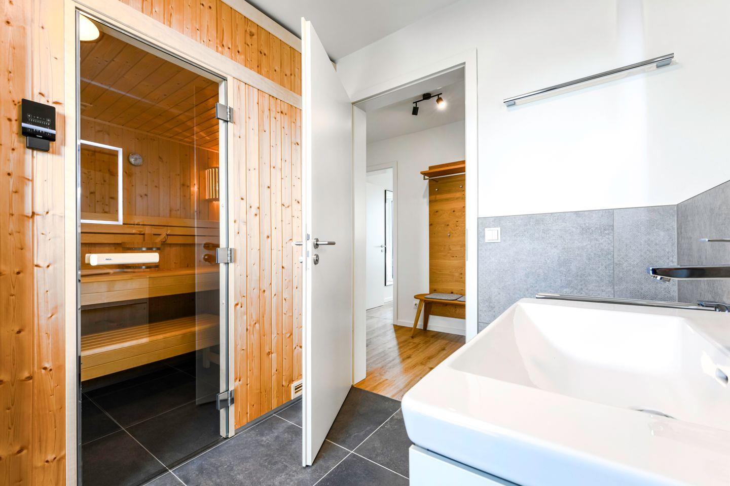 Dein privater Wellnessbereich erwartet dich: Eine moderne Sauna und eine großzügige, ebenerdige Dusche machen jeden Urlaubstag zum Erholungstag. Ob nach einem Strandspaziergang oder einer Fahrradtour – hier kannst du neue Energie tanken und dich rundum verwöhnen.