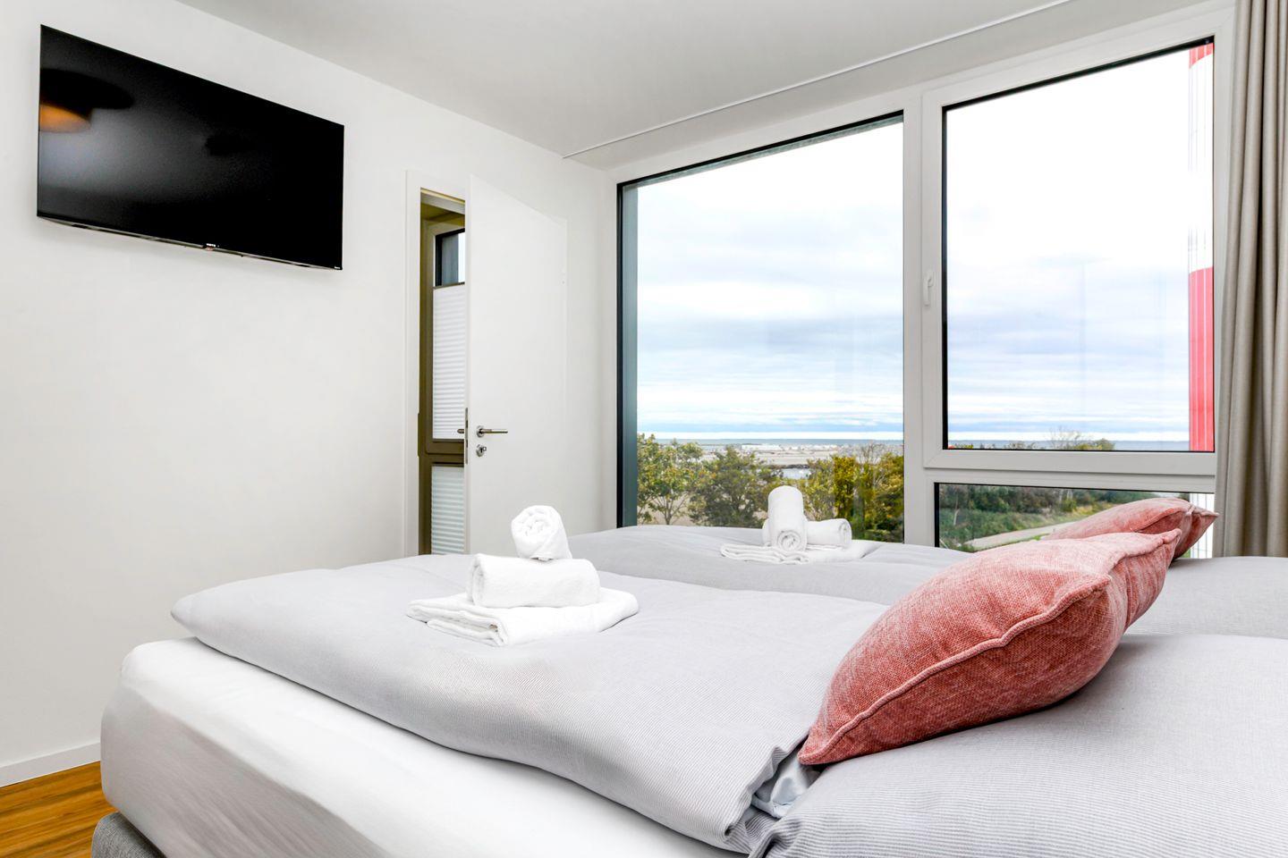 Im Schlafzimmer erwartet dich ein komfortables Boxspringbett mit bodentiefen Fenstern und Verdunkelungsmöglichkeiten – perfekt für erholsame Nächte. Harmonische Farben und die liebevolle Einrichtung sorgen für eine entspannte Atmosphäre. Zusätzlich bietet der Wohnbereich ein Schlafsofa (140 × 200 cm), das Platz für zwei Kinder oder einen Erwachsenen.