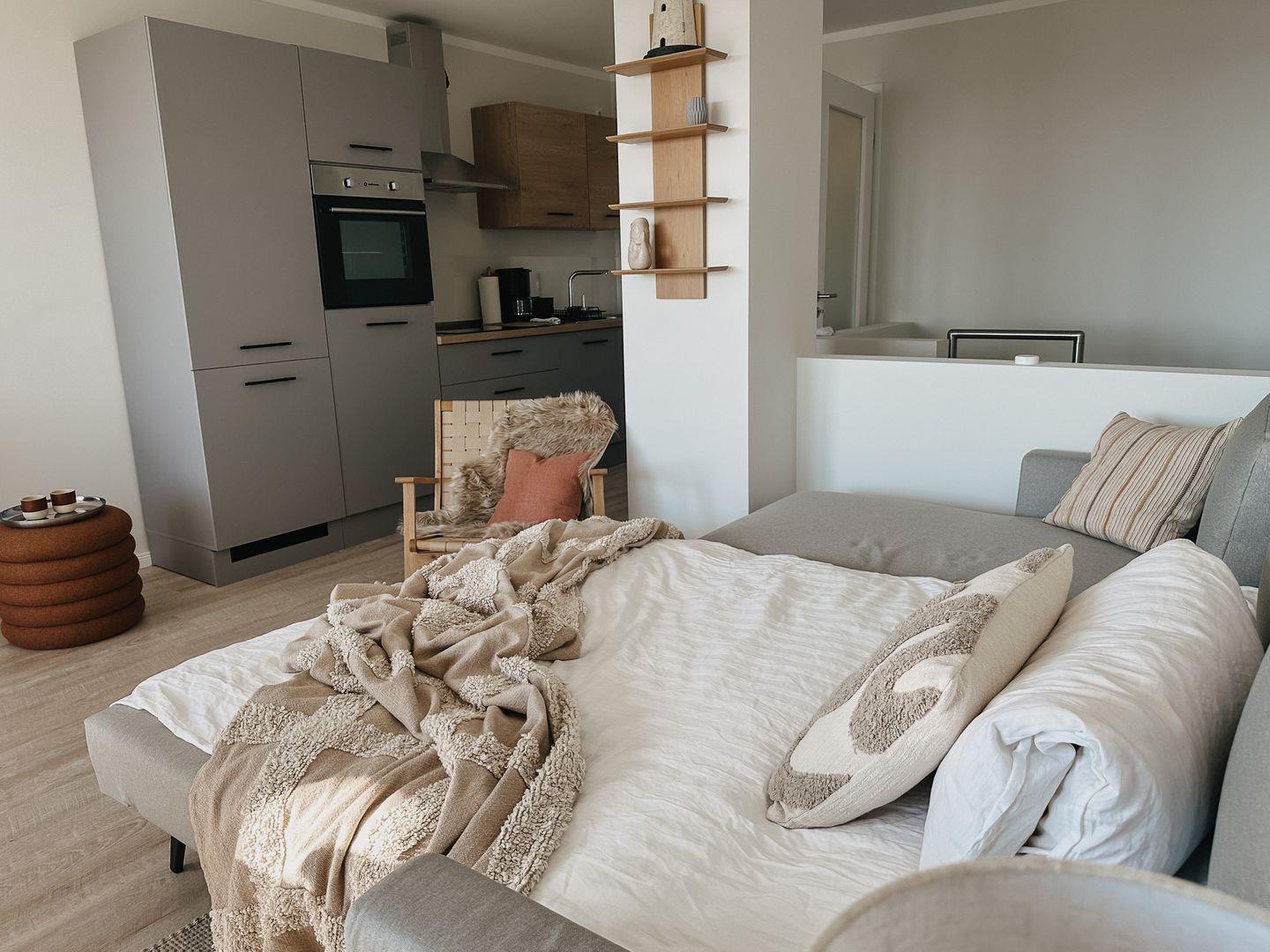 Das Herzstück der Wohnung ist das einladende Wohnzimmer. Hier können Sie auf der bequemen Ausziehcouch, die Platz für zwei Erwachsene bietet, entspannen und den Tag ausklingen lassen. Ein moderner 32-Zoll Smart TV und ein Radio stehen für Ihre Unterhaltung bereit. Der Laminatboden sorgt für eine harmonische Verbindung zwischen den Räumen.