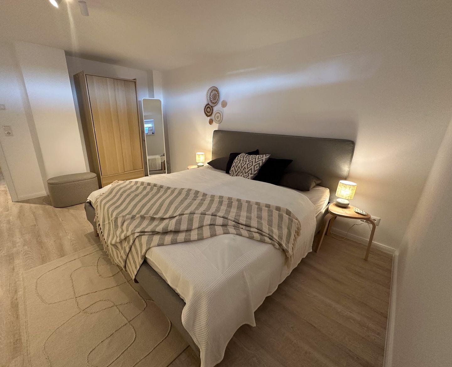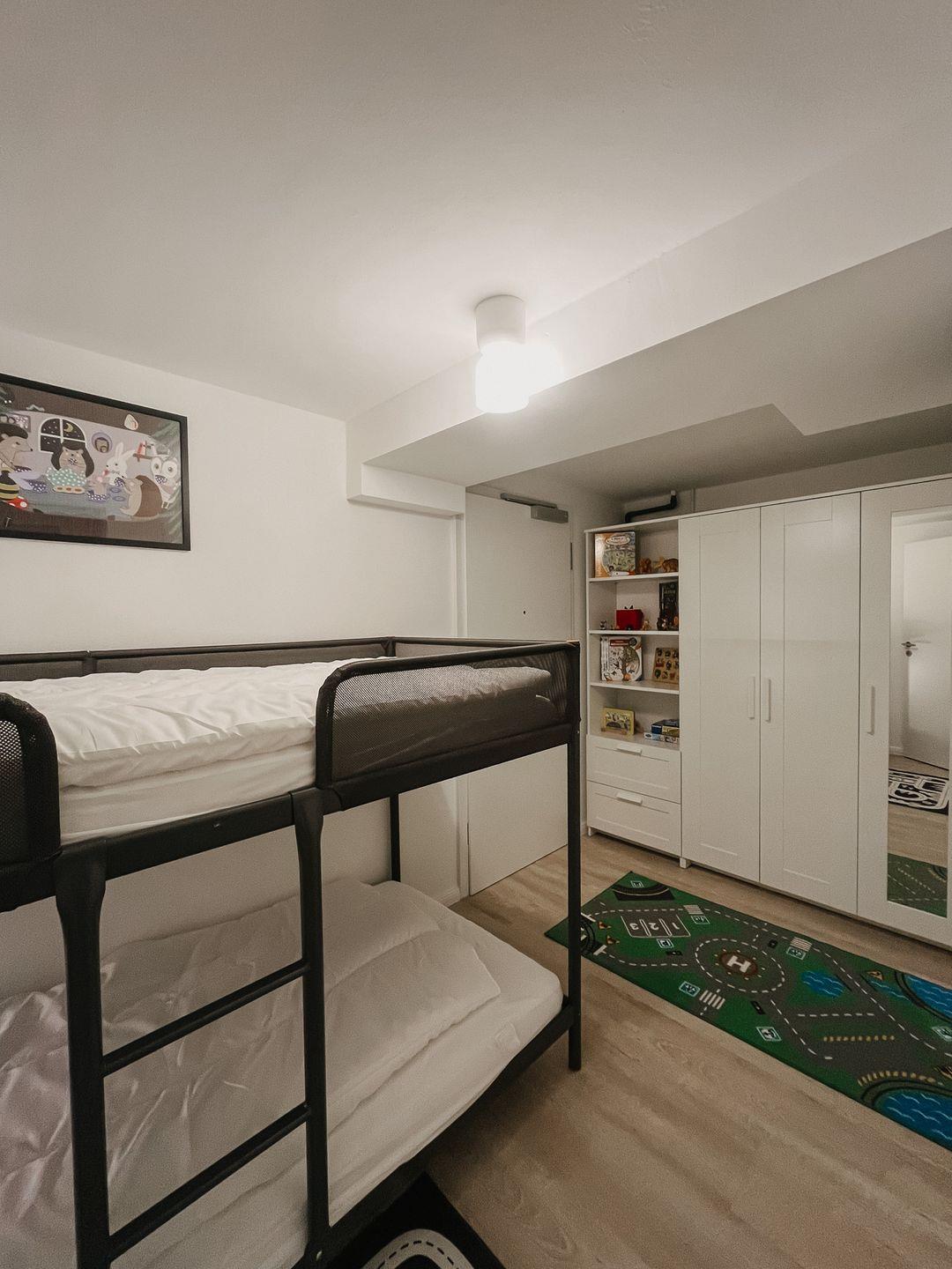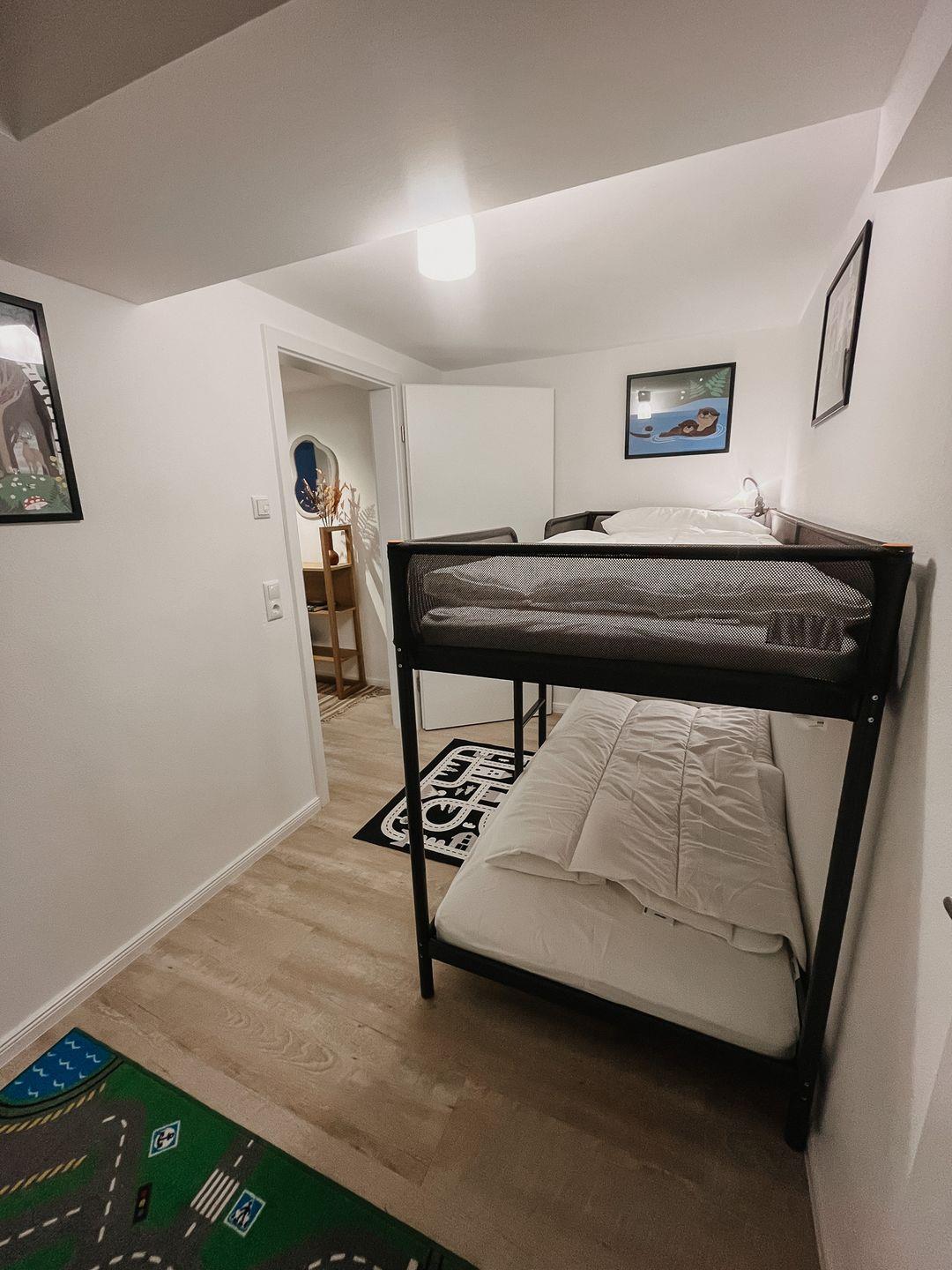 Im Schlafzimmer erwartet Sie ein großzügiges Doppelbett, ausgestattet mit hochwertigen Emma-Matratzen, die für erholsamen Schlaf sorgen. Der Laminatboden verleiht dem Raum eine warme Atmosphäre. Das Kinderzimmer ist ein wahres Paradies für unsere kleinen Gäste: Ein abenteuerliches Etagenbett lädt zum Kuscheln und Träumen ein, während eine Auswahl an Spielzeug für Unterhaltung sorgt.