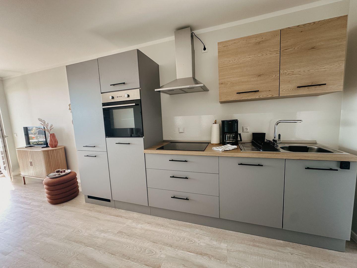 In der hochwertigen Küchenzeile werden Hobbyköche und Genießer gleichermaßen auf ihre Kosten kommen. Sie ist komplett ausgestattet mit einem Ceranfeld, Filterkaffeemaschine, Wasserkocher, geräumigem Kühlschrank mit Tiefkühlfach, Geschirrspüler und Toaster. Natürlich finden Sie hier auch alle notwendigen Kochutensilien und Geschirr, um Ihre Lieblingsgerichte zuzubereiten.