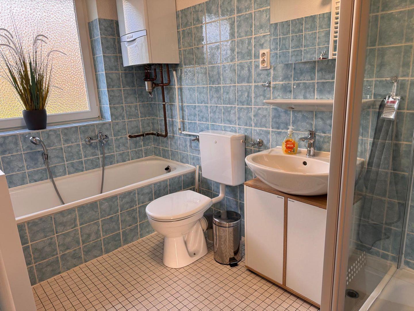 Das lichtdurchflutete Badezimmer ist funktional und verfügt über eine Dusche mit Wanne, Badewanne, Waschbecken, WC, Spiegel und Fenster. Für die Wäschepflege stehen Ihnen eine gemeinschaftlich genutzte Waschmaschine, Bügeleisen, Bügelbrett, Wäscheständer und Staubsauger zur Verfügung.