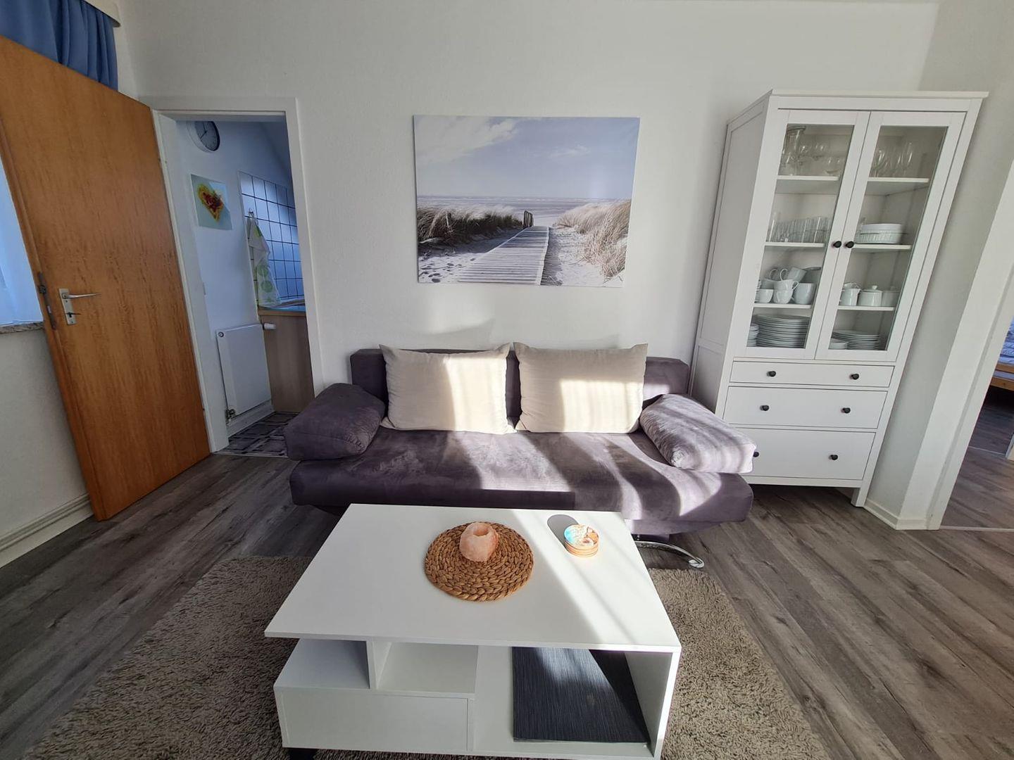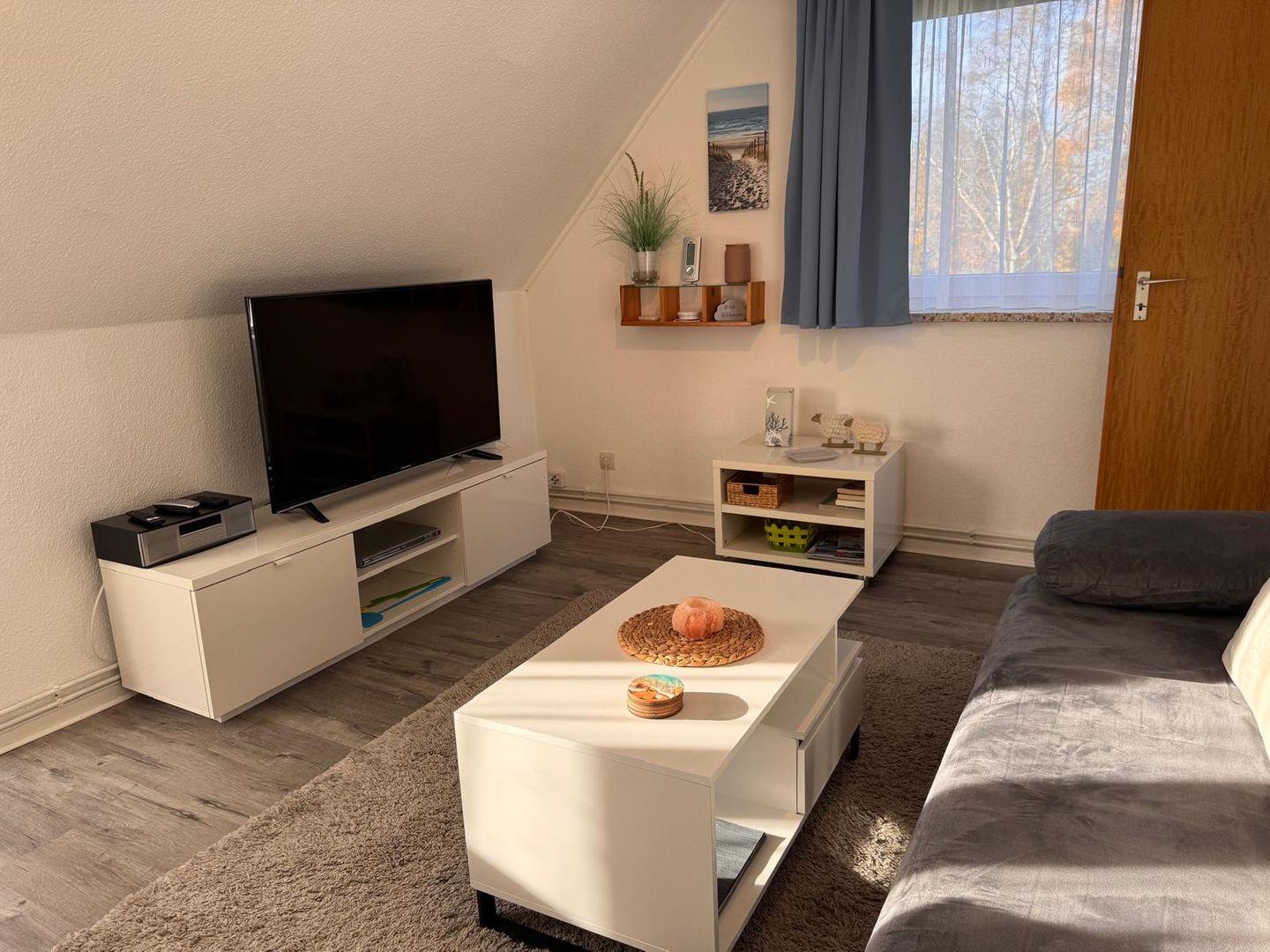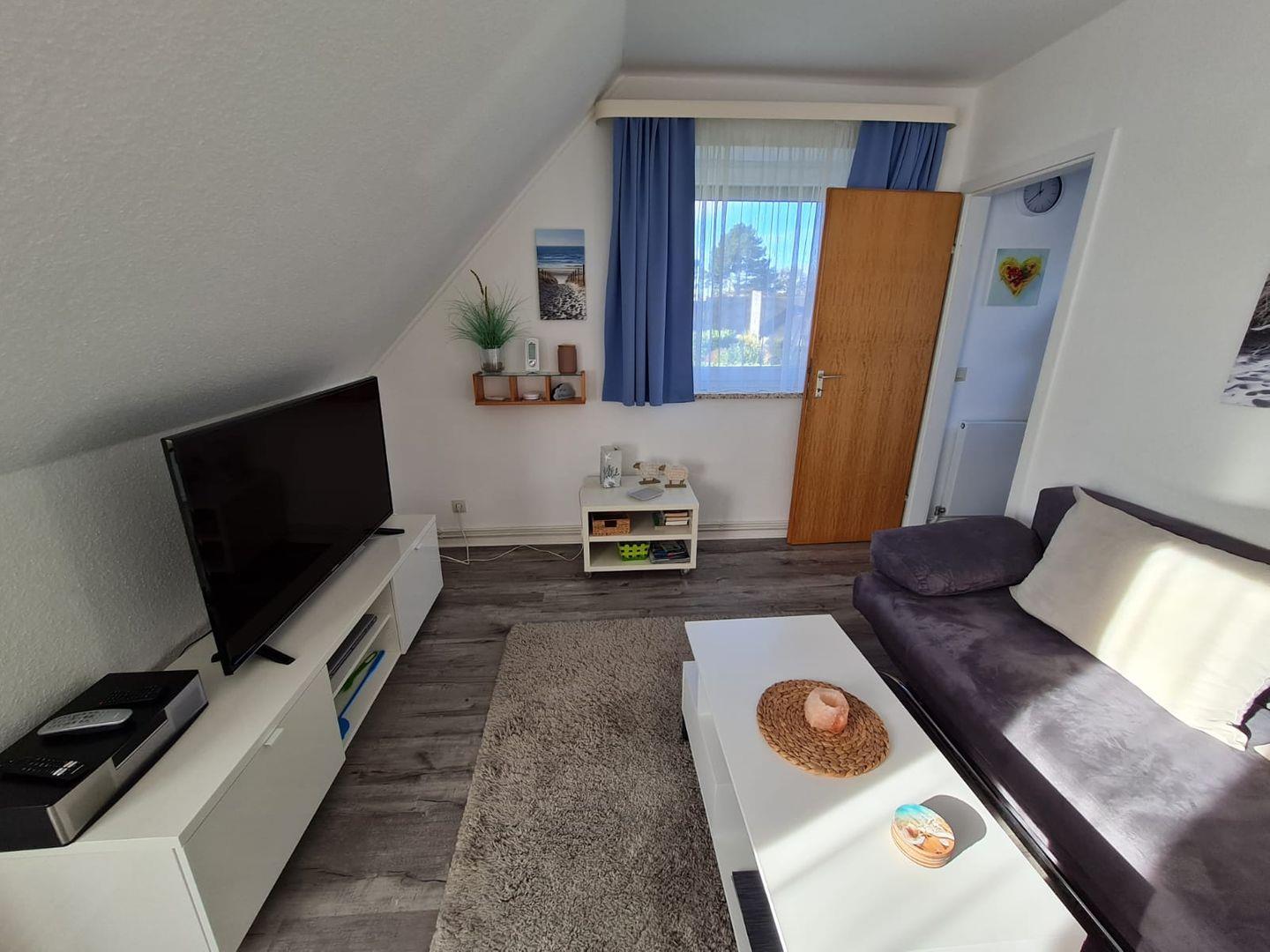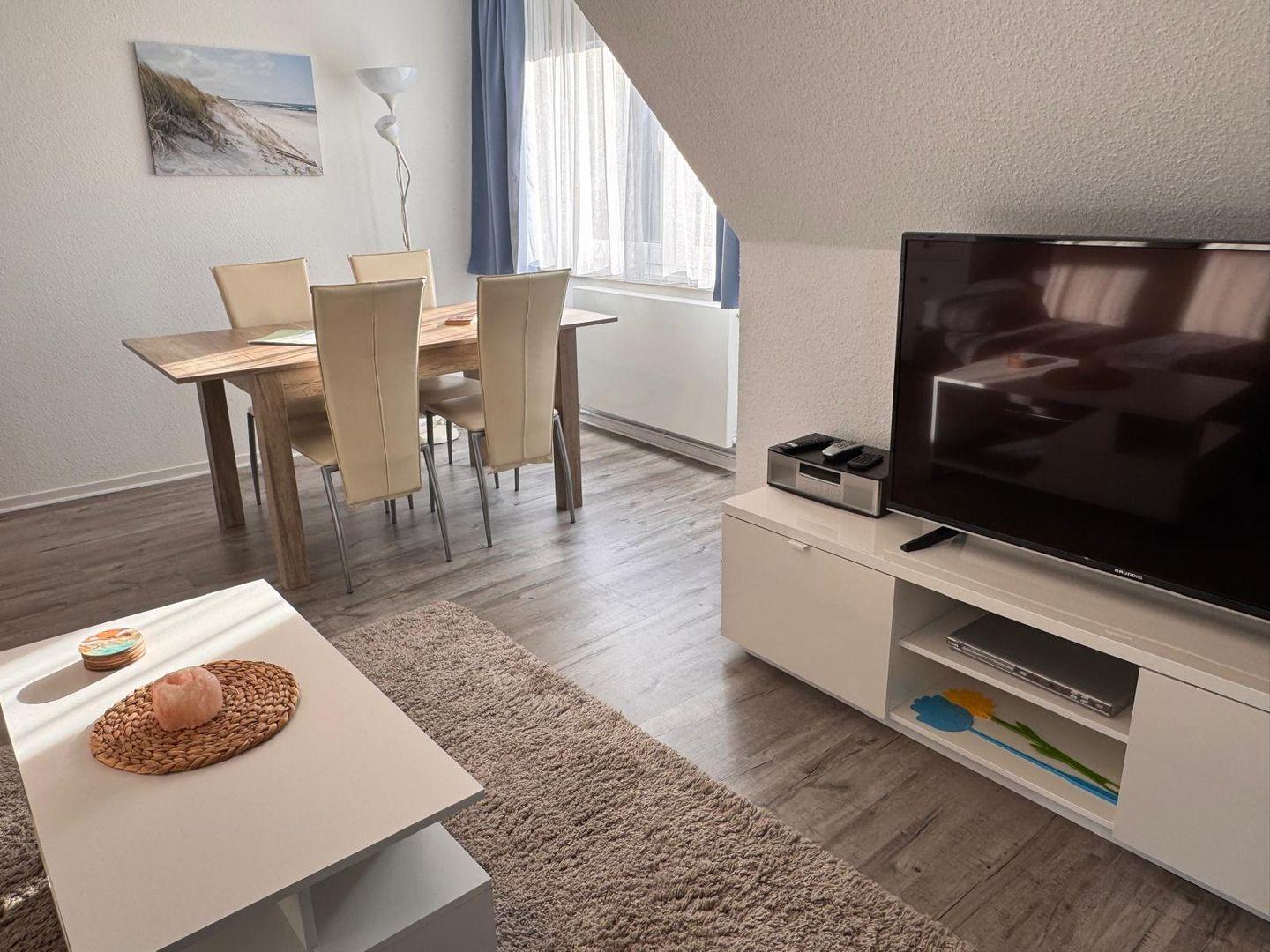 Die Wohnung verfügt über insgesamt drei Zimmer, darunter zwei separate Schlafzimmer mit Laminatboden, die sowohl Familien mit Kindern als auch Paare ansprechen. Im gemütlichen Wohnzimmer, das ebenfalls mit Laminatboden ausgestattet ist, finden Sie eine gemütliche Sofaecke und einen SAT-TV (50 Zoll) für entspannte Abende. Zusätzlich steht Ihnen ein Radio zur Verfügung. Der offene Essbereich mit Esstisch schafft gesellige Treffpunkte für gemeinsame Mahlzeiten. Eine Garderobe, eine Kommode, ein Ganzkörperspiegel sowie ein Sichtschutz an allen Fenstern bieten zusätzlichen Komfort und Privatsphäre.