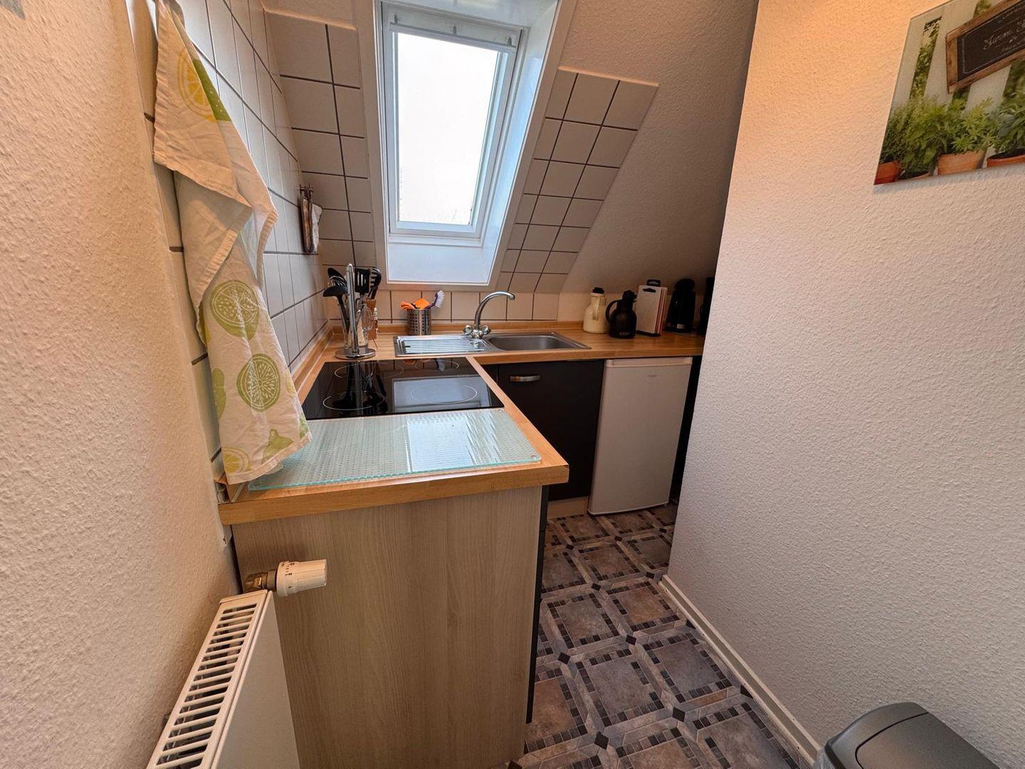 Die Küche ist vollständig ausgestattet und lässt keine Wünsche offen: Ein Ceranherd mit Elektro-Backofen, Kühlschrank mit integriertem Gefrierfach, Mikrowelle, Kaffeemaschine, Eierkocher, Toaster sowie eine Spülmaschine sind vorhanden und ermöglichen eine bequeme Selbstversorgung.
