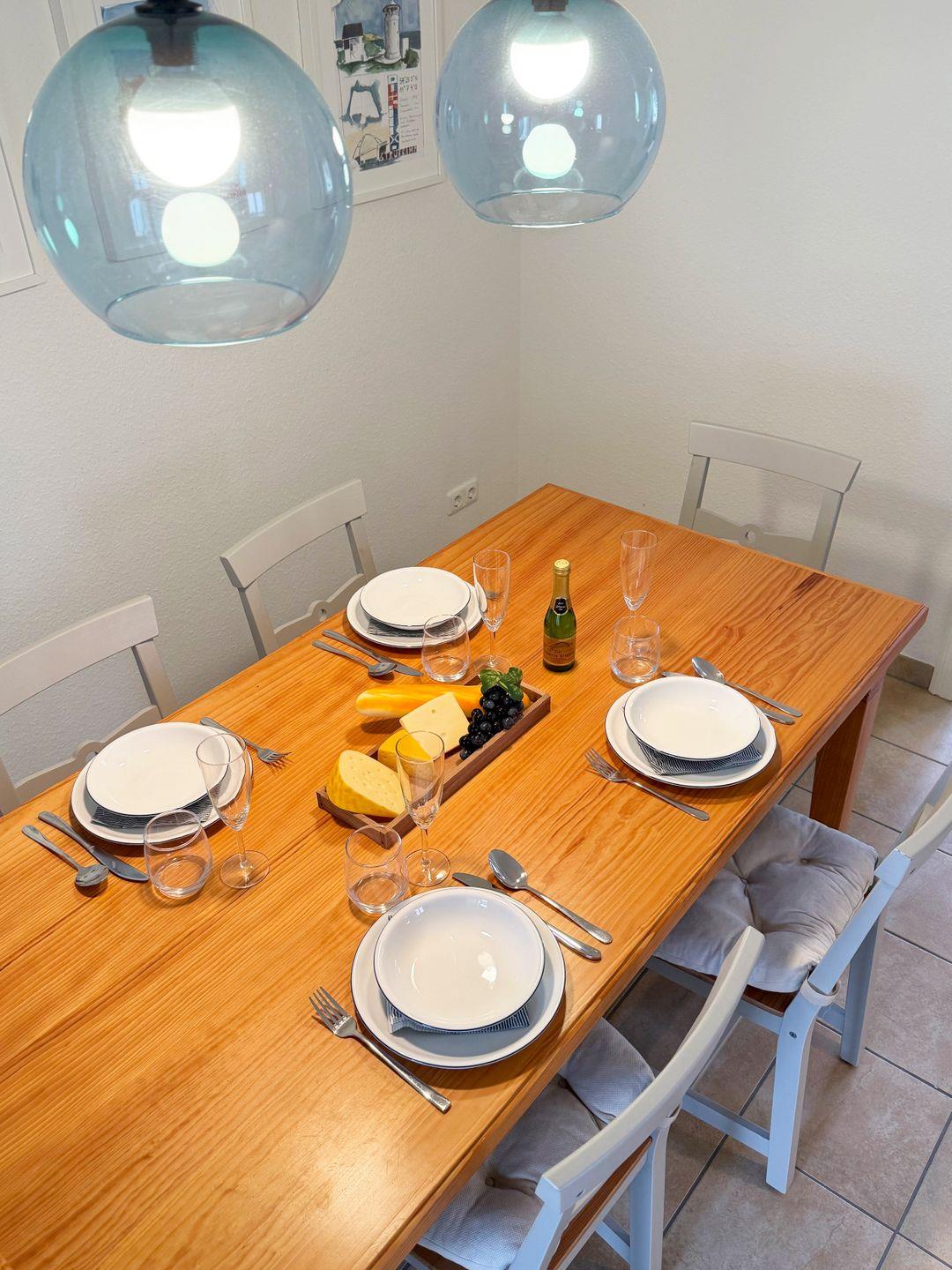 Im Innenbereich erwarten Sie ein Wohnzimmer, ein Esszimmer und eine geschlossene Küche. Die Küchenausstattung umfasst unter anderem Cerankochfeld, Backofen, Kühlschrank mit Gefrierfach, Mikrowelle, Kaffeemaschine, Espressomaschine, Wasserkocher, Toaster sowie Küchenutensilien, Geschirr und Besteck. Ein Esstisch ergänzt den Essbereich und schafft angenehme Bedingungen für gemeinsame Mahlzeiten. Zur weiteren Ausstattung gehören 2 Fernseher, WLAN, Internet, Radio, CD-Spieler und Bücher.