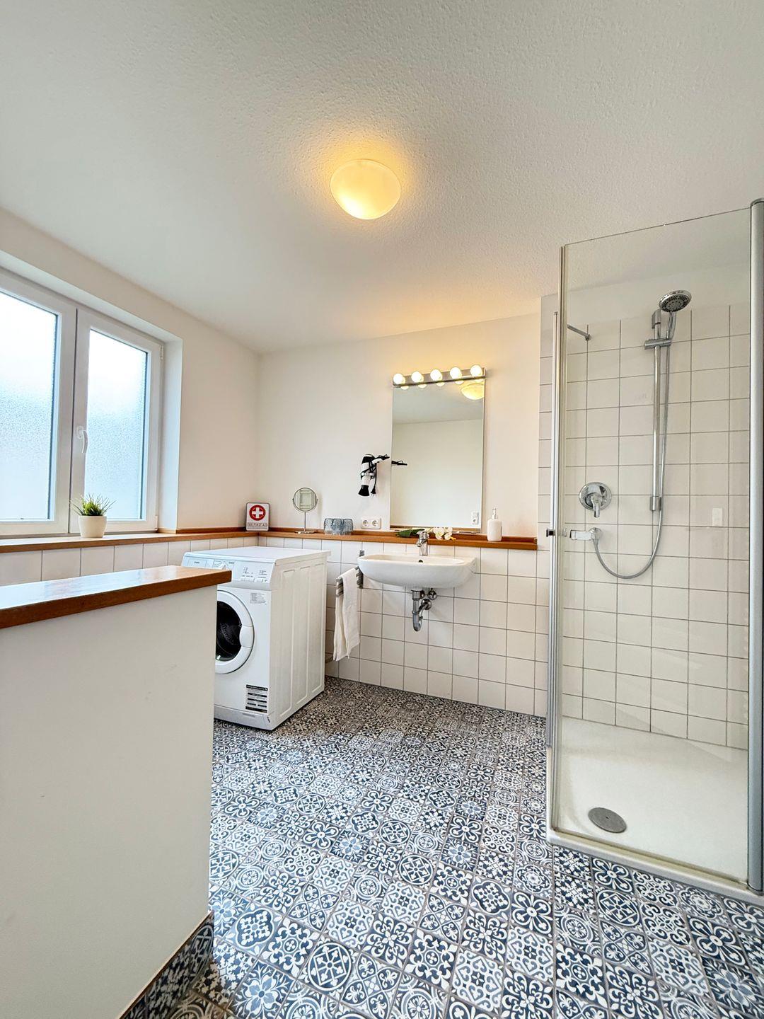 Das Badezimmer ist mit Dusche, WC, Waschbecken und Haartrockner ausgestattet. Zusätzlich stehen Ihnen eine Waschmaschine zur Eigennutzung, Wäscheständer und Bügeleisen zur Verfügung. Heizung und Rauchmelder tragen zu einem angenehmen und sicheren Aufenthalt bei.