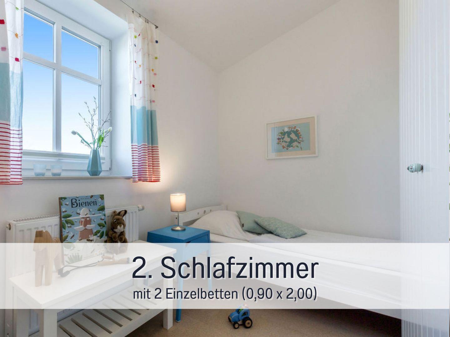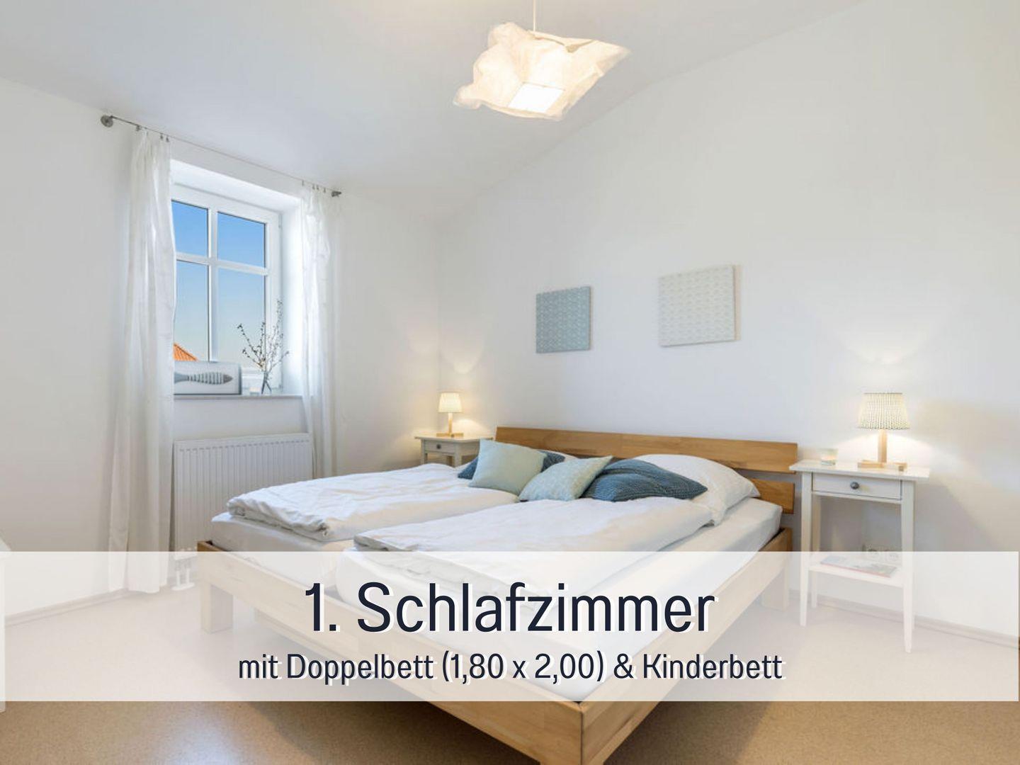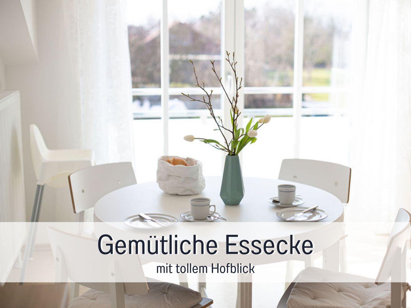 Vom Wohnbereich aus habt ihr einen schönen Ausblick direkt auf das Hofgelände – so könnt ihr entspannt zusehen, was draußen los ist. Zum Schlafen warten zwei separate Räume auf euch: Ein Elternschlafzimmer und ein gemütliches Kinderzimmer mit zwei Einzelbetten (kein Etagenbett). Ein Duschbad macht die Ausstattung komplett.