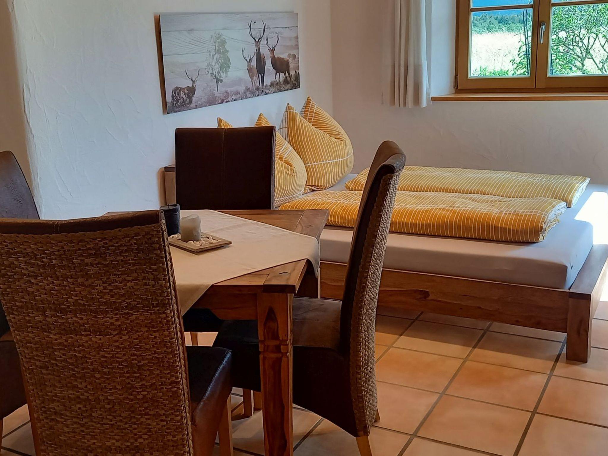 Neue Ferienwohnung in gepflegtem Landhaus in Ortsrandlage, wunderschöner Blick auf die Berge, max. 5 Gehminuten zur Zugverbindung Aschau - Prien. Herrliche Rad- und Wandertouren ab Haus möglich.Gemütlich ausgestattete Ferienwohnung mit großem Wohn-/Schlafraum mit Doppelbett, Kachelofen, 1 Schlafcouch mit hochwertiger Matratze, gut ausgestattete Küche mit Geschirrspüler, Bad mit WC und Dusche, Kinderbett- stuhl, Kabel-TV, W-LAN, Stellplatz vor dem Haus.Nichtraucher Wohnung, Garten mit großer Terrasse und 2 Markisen, Grillmöglichkeit, Fahrradunterstellplatz , keine Haustiere.Die Ferienwohnung ist ein idealer Ausgangspunkt für Ausflüge. Wandern Sie auf die Berge direkt vor der Haustüre oder fahren Sie mit einer der nahen Bergbahnen auf Kampenwand, Hochries oder Wendelstein. Herrliche Aussichten auf das Voralpenland und auf viele Berggipfel bis zum Großglockner sind bei gutem Wetter garantiert. Der nahe Chiemsee mit Schloss Herrenchiemsee und der idyllischen Fraueninsel, aber auch München, Salzburg, Rosenheim, Kufstein und Berchtesgaden mit Königsee laden zum Erkunden ein und sind von Frasdorf aus bestens erreichbar.Zahlreiche sportliche Aktivitäten und kulturelle Angebote wie Baden, Kajakfahren, Surfen, Segeln, Golf, Paragliding, Klettern (Hochseilgarten), Minigolf, sowie Museen, Konzerte, Dorf- und Seefeste bietet die nahe Region.