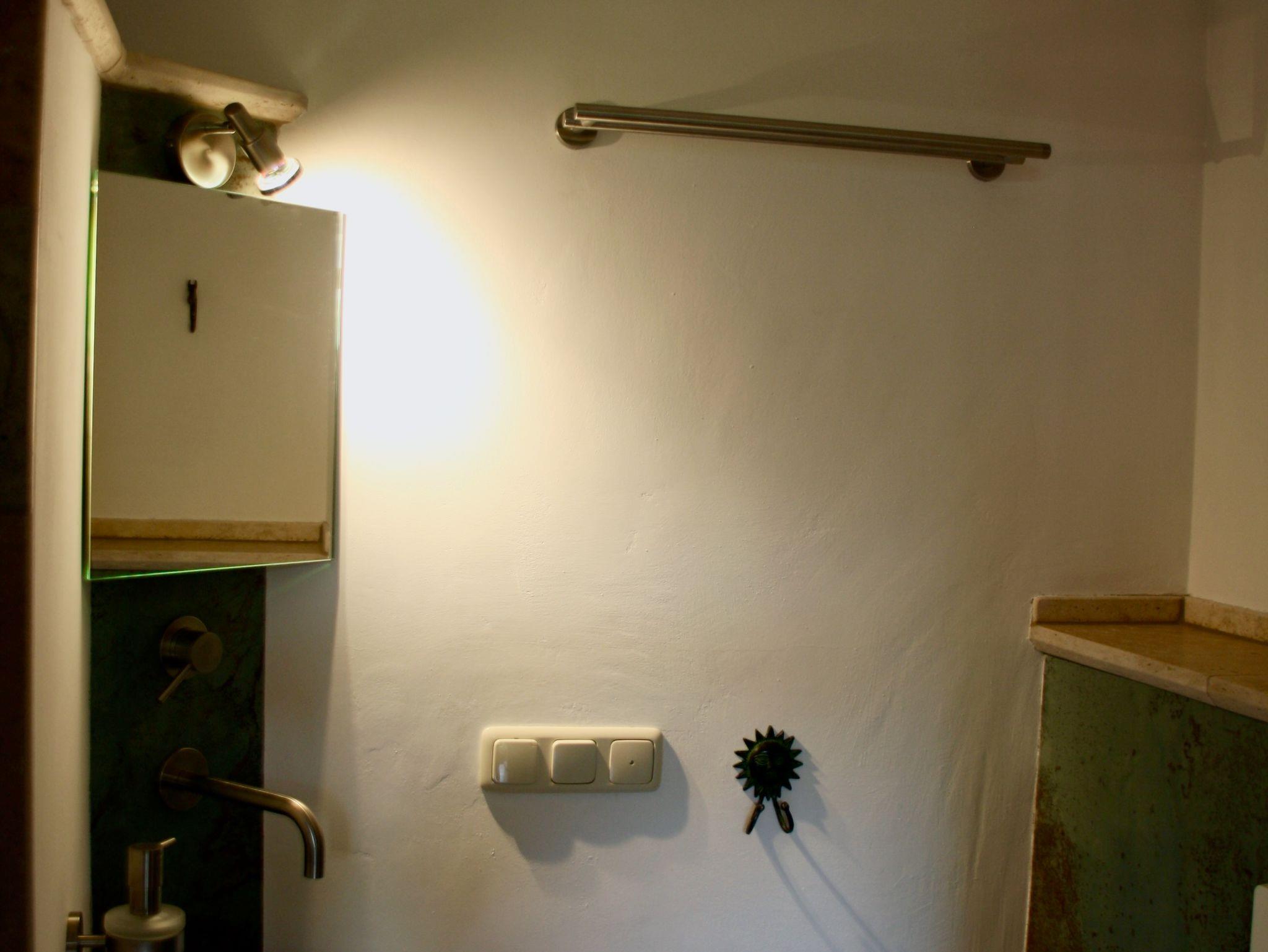 Der Naßbereich (Badezimmer) wurde mit einer begehbaren Dusche, Taharet Dusch WC und Steinwaschbecken ausgestattet. Es wurde eine Fußbodenheizung sowie eine Wandheizung installiert, welches für ein angenehmes Duscherlebnis mit Blick in den Wohnbereich sorgt.