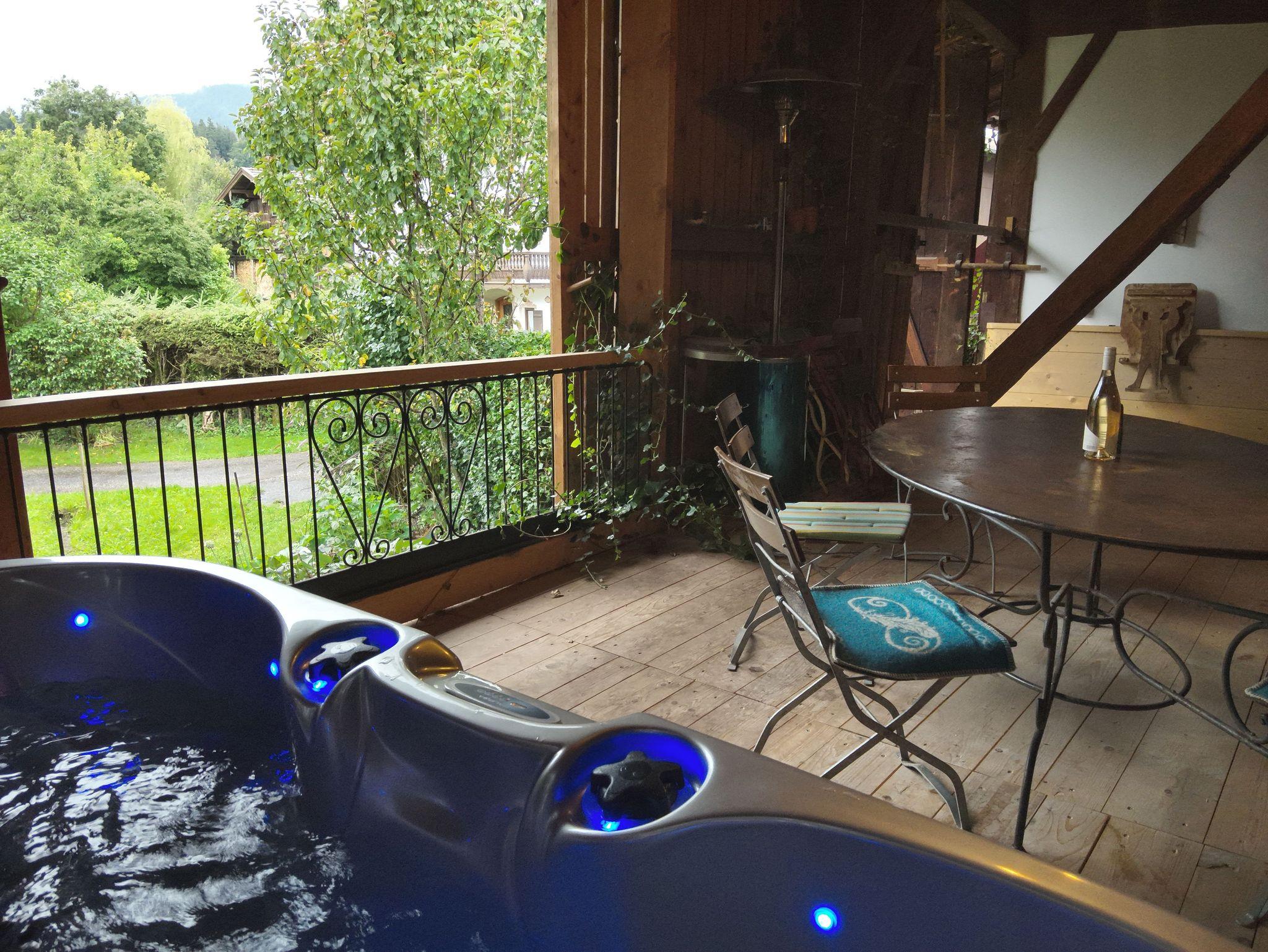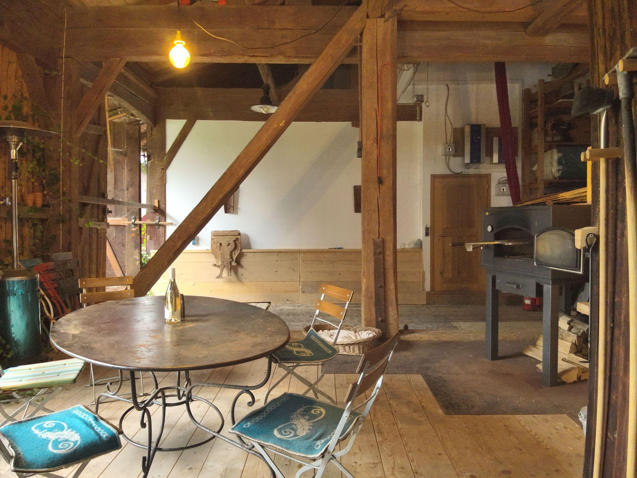 Außenlounge: Balkon und Terrasse mit zusätzlichem überdachten Sitzbereich in historischer Tenne. Hier besteht die Möglichkeit den Tag nach einer Wanderung oder Biketour am Grill und Whirlpool ausklingen zu lassen.