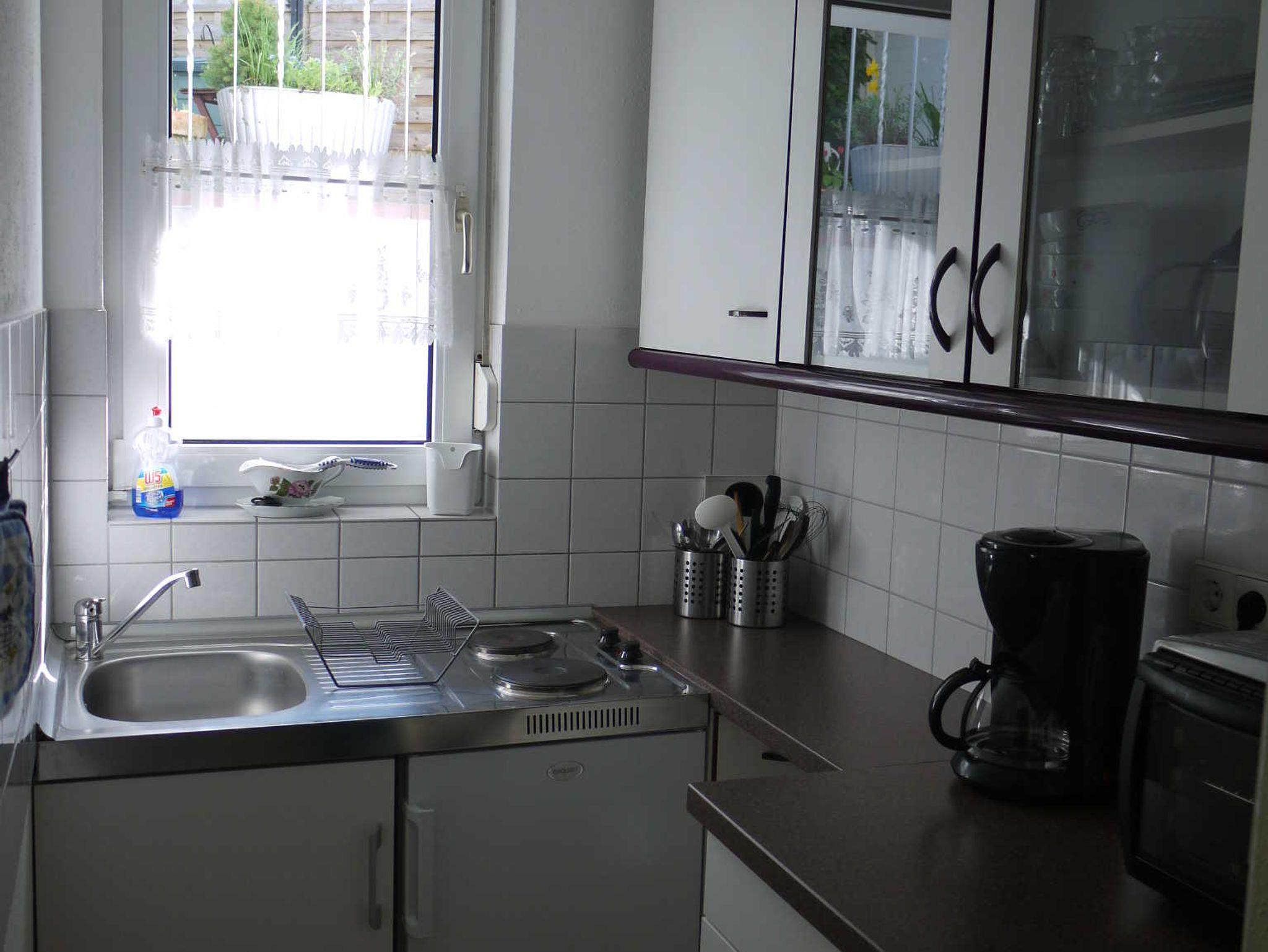 Die Souterrain-Ferienwohnung mit 38qm bietet Platz für bis zu 3 Personen. Sie verfügt über einen separaten Schlafraum mit Doppelbett (160x200) und Kleiderschrank, einen Wohnraum mit einer ausziehbarer Schlafcouch (140x200),TV, Radio, Internetanschluss und Es-/Schreibtisch, eine separate Küche (Kaffeemachine, Wasserkocher, Toaster, kleiner Backofen, Kühlschrank mit kleinem Gefrierfach und 2Platten Herd.
