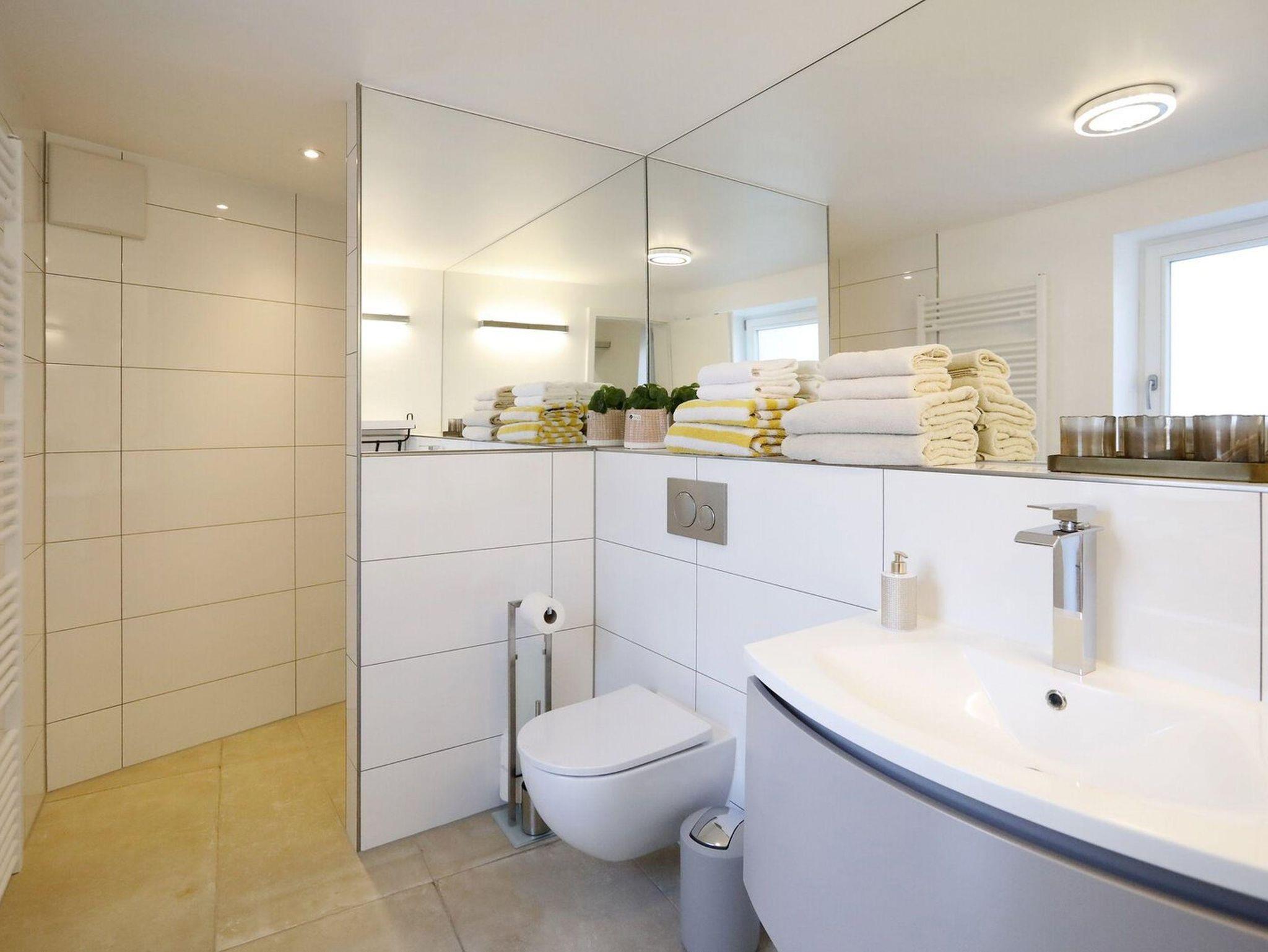 Das große Badezimmer mit einer begehbaren Dusche und großem Fenster, verfügt über ausreichende Ablagemöglichkeiten, duftende Badetücher, Haartrockner und alles, was sonst als Grundausstattung benötigt wird. Die Wände sind mit großen Spiegelflächen versehen. Nebenan befindet sich eine Waschmaschine mit integriertem Trockner.