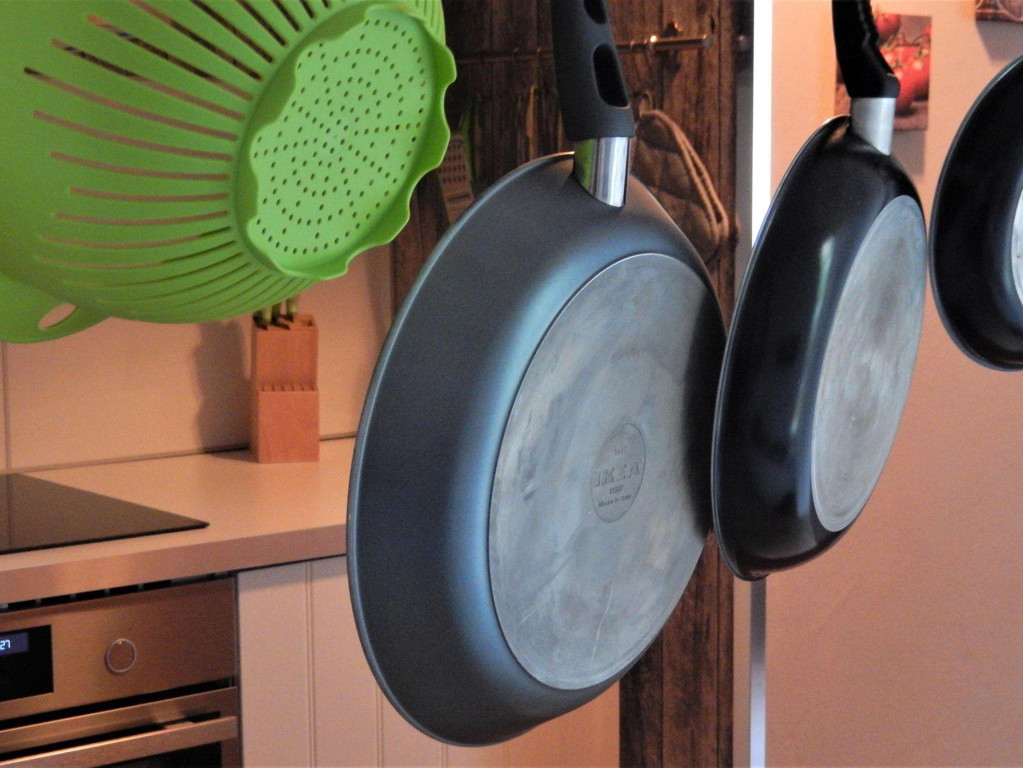 Herd, Glaskeramik-Kochfeld, Spülmaschine, Backofen, Kühlschrank mit Gefrierfach, Mikrowelle, Toaster, Kaffeemaschine, Kaffeepadmaschine, Wasserkocher, Eierkocher, Esstisch mit 4 Stühlen.