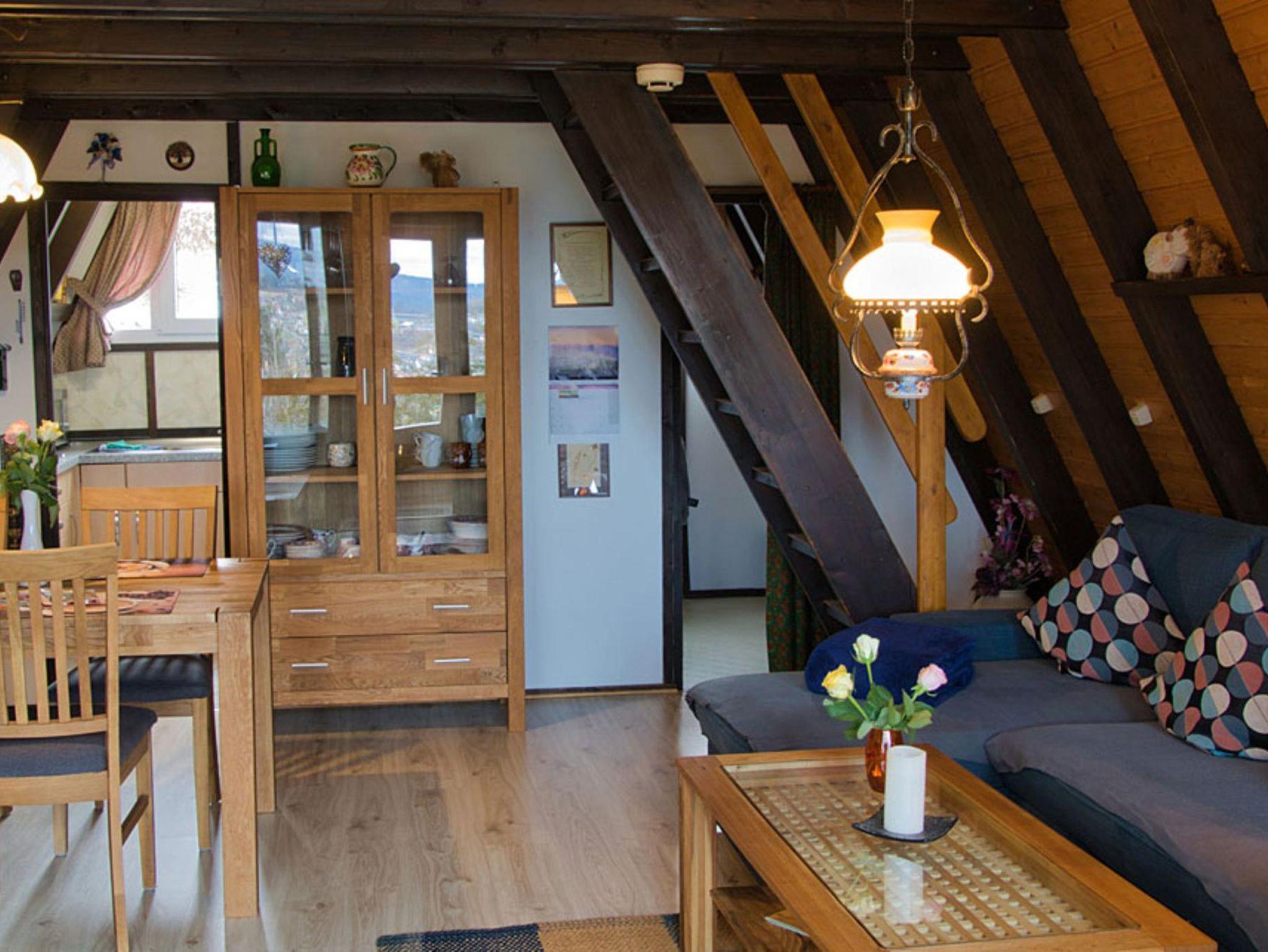 Unser Nurdachhaus betreten Sie über drei Stufen in eine abgeschlossene Eingangsdiele, wo sich Wäscheständer und Gartenmöbel befinden. Hier besteht die Möglichkeit zum Abstellen und Trocknen von Wanderbekleidung, Schuhen und Ski etc. Von dort aus gelangen Sie in ein gemütliches großes Wohn-Esszimmer mit Sitzecke und Essgruppe mit Stühlen. Ein SAT-Flachbild TV sowie BlueRay Player und DAB Radio stehen ebenso zur Verfügung. Die Küche ist durch eine Tür vom Wohnzimmer erreichbar. Es sind vier Kochplatten mit Töpfen und Pfannen vorhanden, ebenso ein Kühlschrank mit Eisfach, Kombimikrowelle, Kaffeemaschine, Wasserkocher und Toaster. Besteck und Geschirr inklusive. Durch die Diele, mit Garderobe, Reinigungsutensilien (Staubsauger,Besen etc.) und Erste-Hilfe Set, gelangen Sie ins kleine Badezimmer mit Dusche, Waschbecken, WC und Zusatzheizlüfter. Ein Fön ist ebenso dabei. Die beiden getrennten Schlafzimmer mit jeweils zwei Betten (190x80cm) sind durch eine schmale Raumspartreppe im oberen Geschoß erreichbar. Kinderreisebett wird auf Anfrage bereitgestellt. An sehr kalten Tagen kann dort mit integrierten Heizlüftern zugeheizt werden. In der Diele zwischen den Schlafräumen befindet sich ein Einbaukleiderschrank und ein Regal mit viel Patz für Koffer und Kleidung. Der Außenbereich besteht aus einer 25qm großen Terasse und zusätzlicher Grünfläche. Gartenmöbel sowie Liegestühle sind ebenfalls vorhanden.
