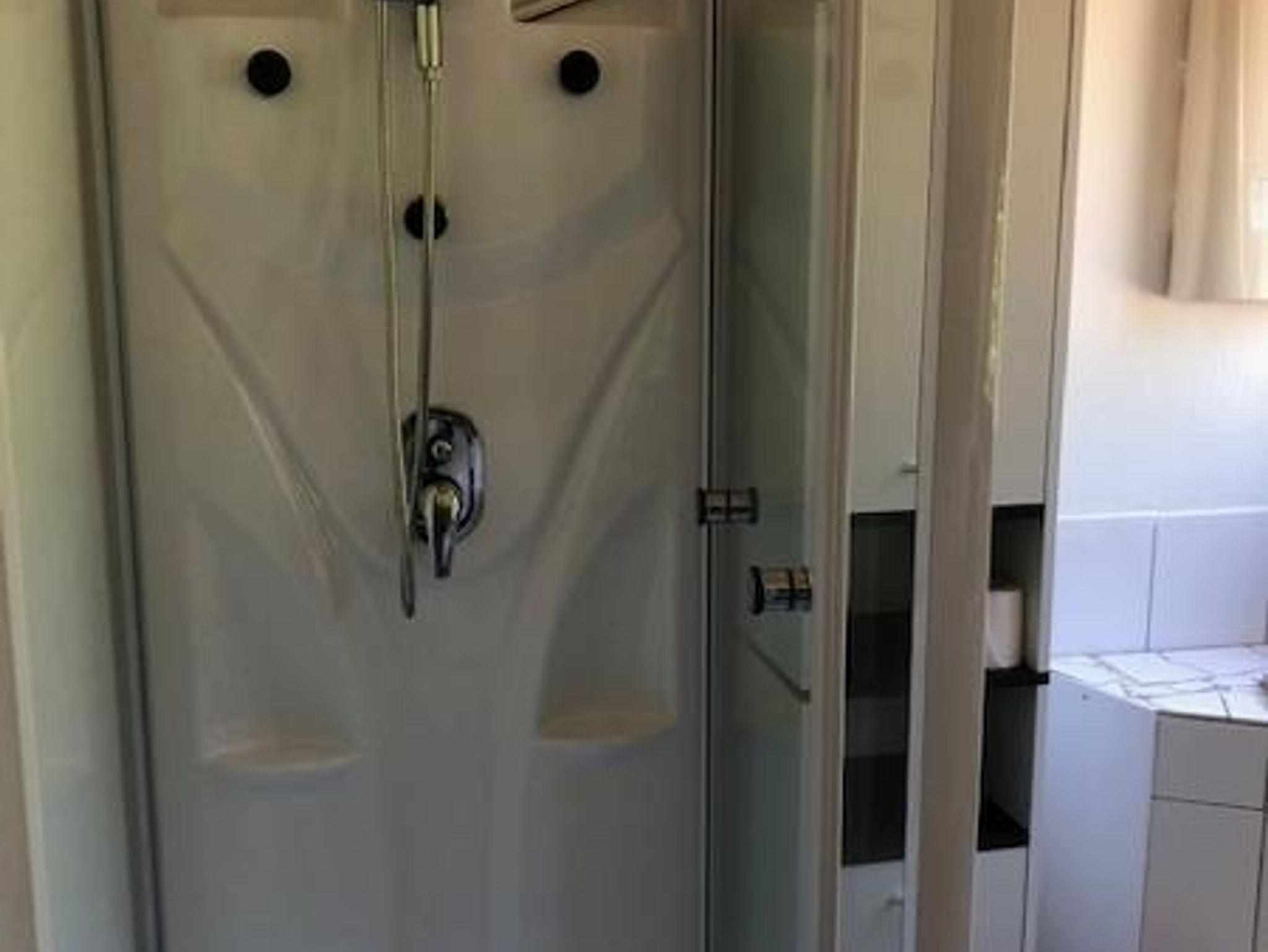 Wellness-Dusche, WC, Waschbecken, großer Spiegel, elektronischer Durchlauferhitzer, Haartrockner, Handtuchheizkörper, Waschmaschine