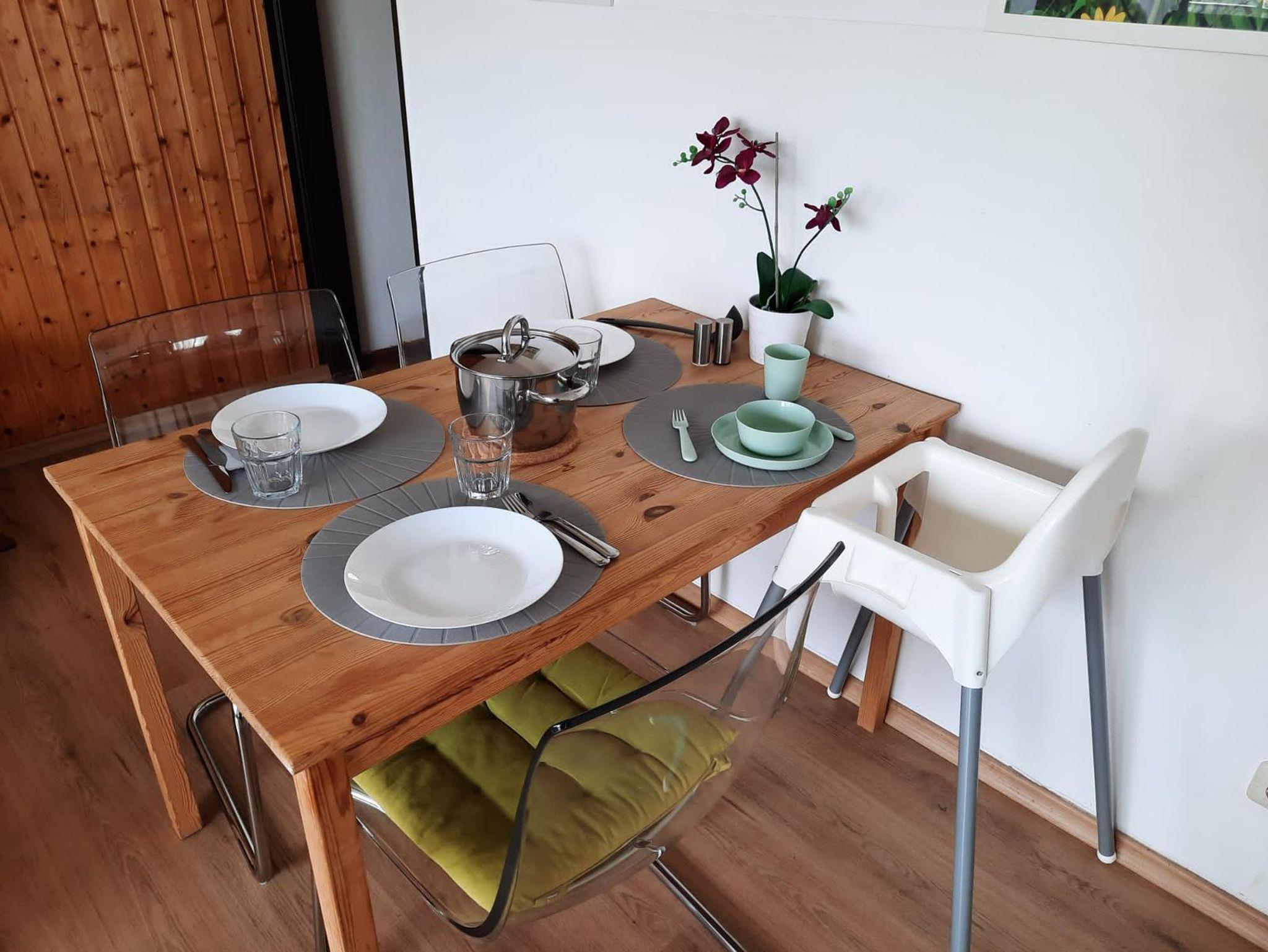 Das geräumige 2,5-Zimmer-Familien Apartment hat einen großen Balkon mit traumhaftem Fernblick. In dem hellen, behaglichen Wohnzimmer befindet sich eine Ledercouch (kann zum Schlafsofa für die 5. Person umgebaut werden), zwei Sessel, der TV (mit Magenta-TV Premium) sowie der Esstisch. Schneller WLAN Anschluss ist ebenfalls vorhanden.