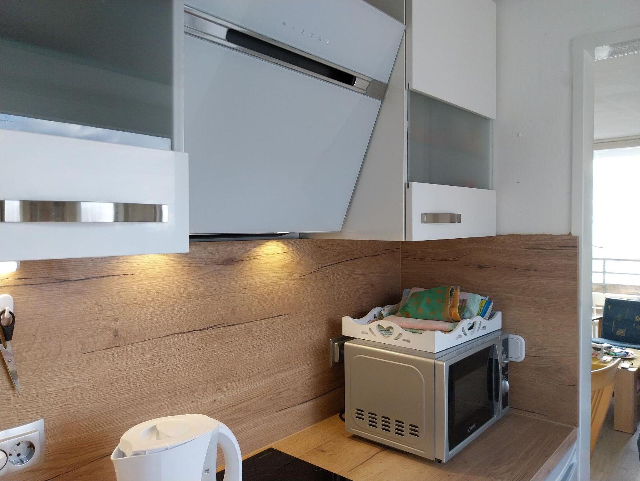 Vom Wohnzimmer aus gelangen Sie auf den Balkon, von dem Sie einen herrlichen Blick auf die umliegenden Berge und Alpen genießen können. In der Küche finden wir eine Elektroherd, Wasserkocher und Toaster. Mit einem Wellcome-Korb mit Kaffee, Teefilter, und Süßigkeiten möchten wir Sie begrüssen.