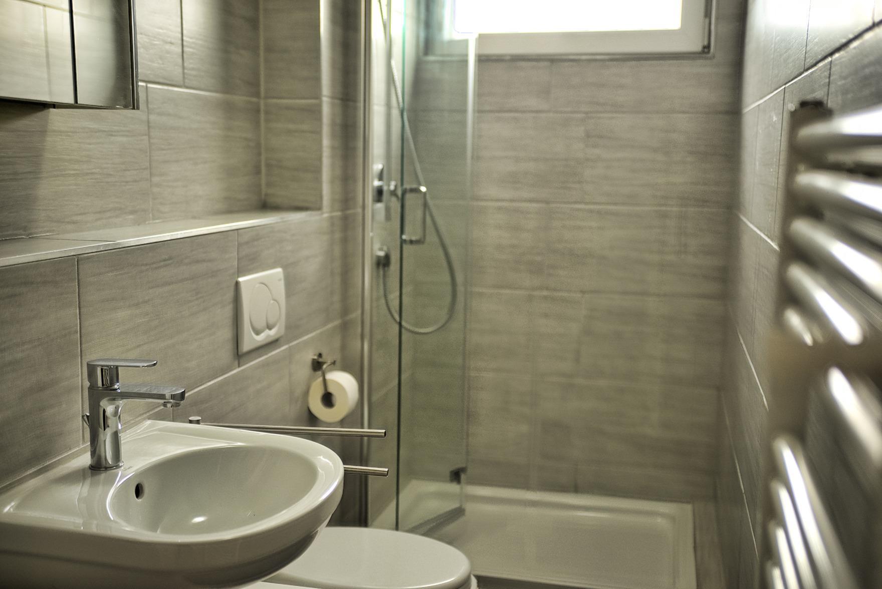 das Tageslicht-Bad mit Dusche, Waschbecken und Toilette. Handtücher, Föhn, Seife und Shampoo Kleenex, Q-Tip sind vorhanden.