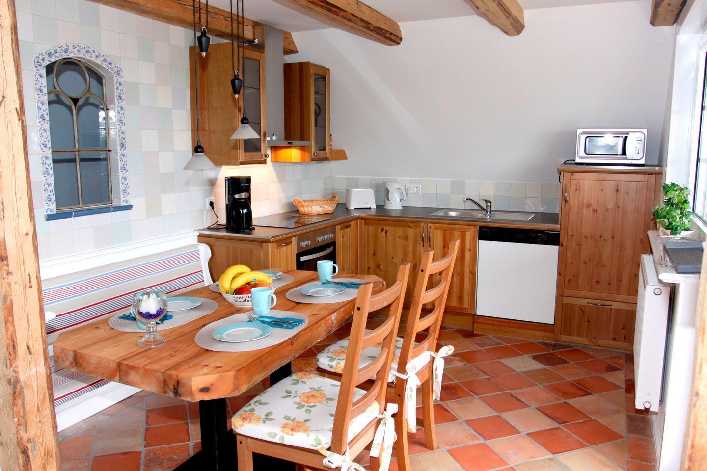 Die moderne Küche ist mit hochwertigen Geräten ausgestattet. Hier stehen Ihnen unter anderem ein Kochfeld, ein Backofen, eine Spülmaschine und ein Kühlschrank zur Verfügung. In der Wäschestation befindet sich ein Gefrierschrank. Dank der geschlossenen Bauweise der Küche mit integriertem Esstisch ist diese Küche nicht nur funktional, sondern lädt auch zum gemeinsamen Kochen ein. Für Ihren zusätzlichen Komfort sind viele Küchenutensilien sowie Geschirr und Besteck vorhanden. Ein Wasserkocher, eine Kaffeemaschine und eine Mikrowelle runden das Angebot ab.