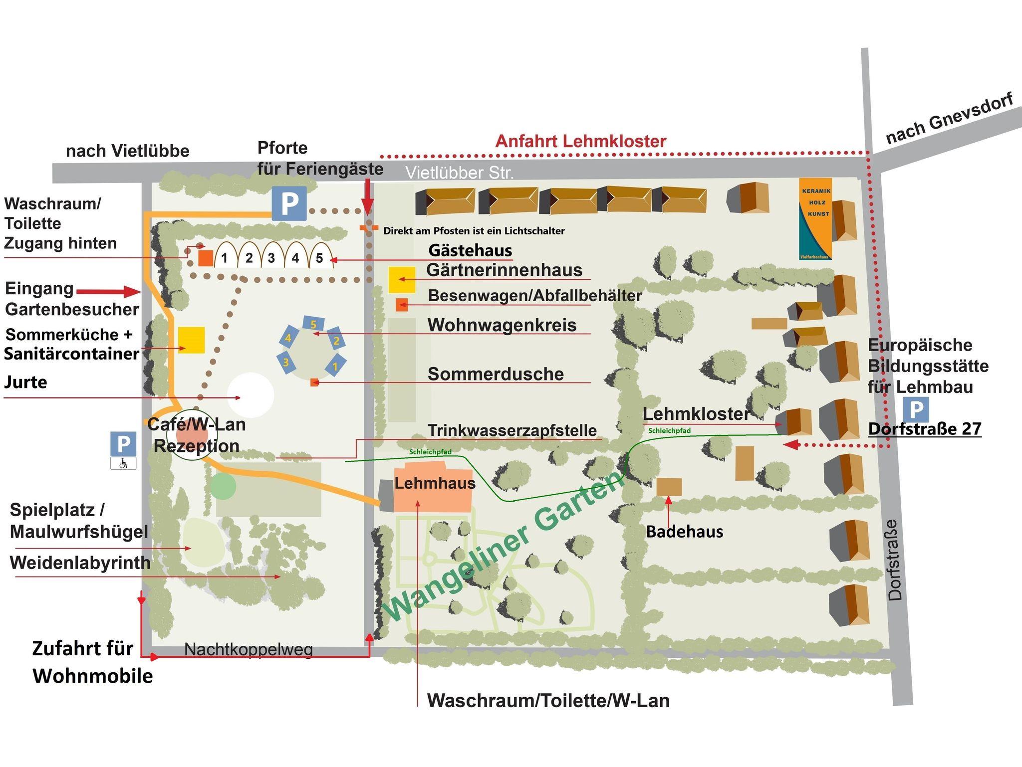 Die gemeinschaftlich benutzten Sanitäranlagen (Toilette + Waschraum) befinden sich auf der Rückseite der Ferienzimmer 1-5, weiterhin im Sanitärcontainer hinter der Sommerküche und bei Bedarf zusätzlich im Lehmhaus des Wangeliner Gartens.