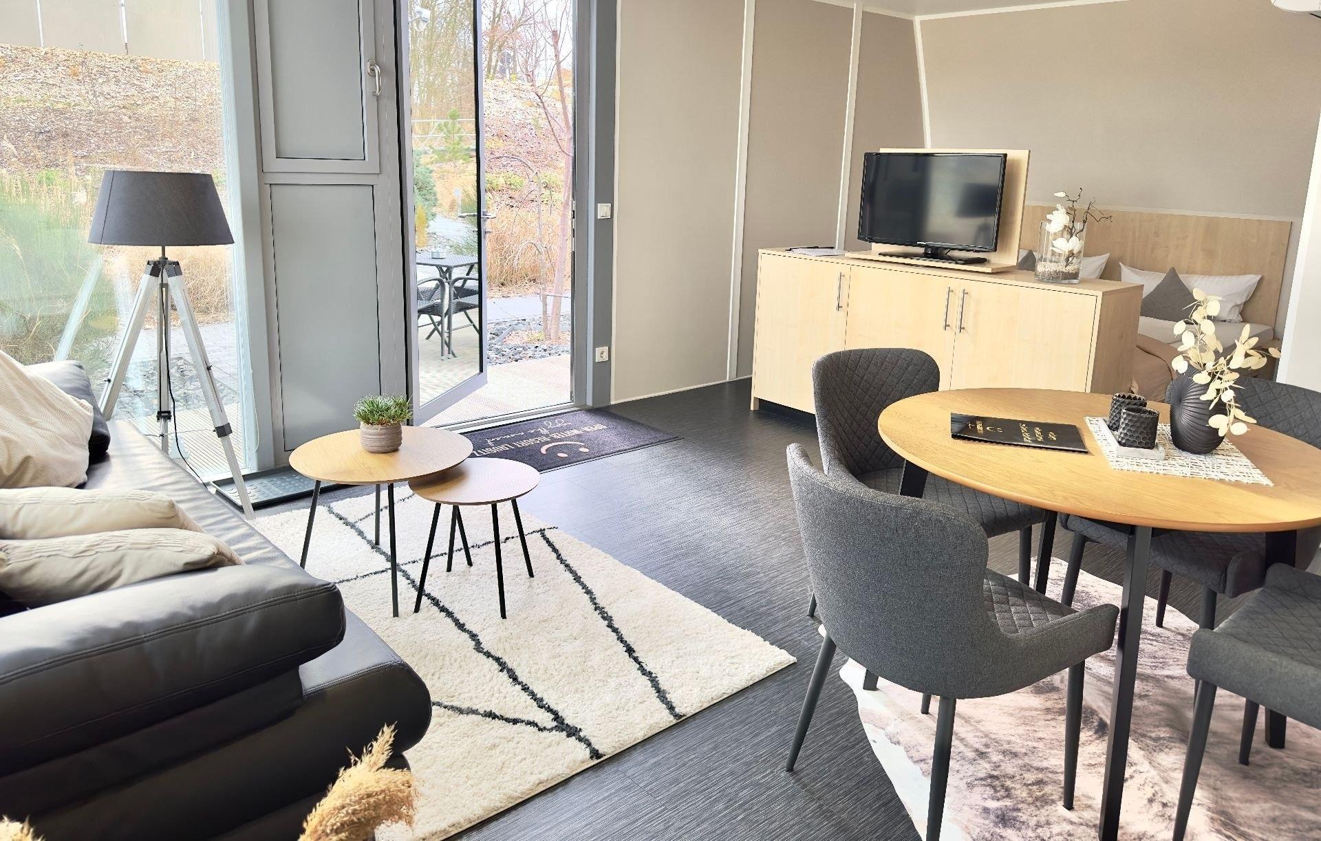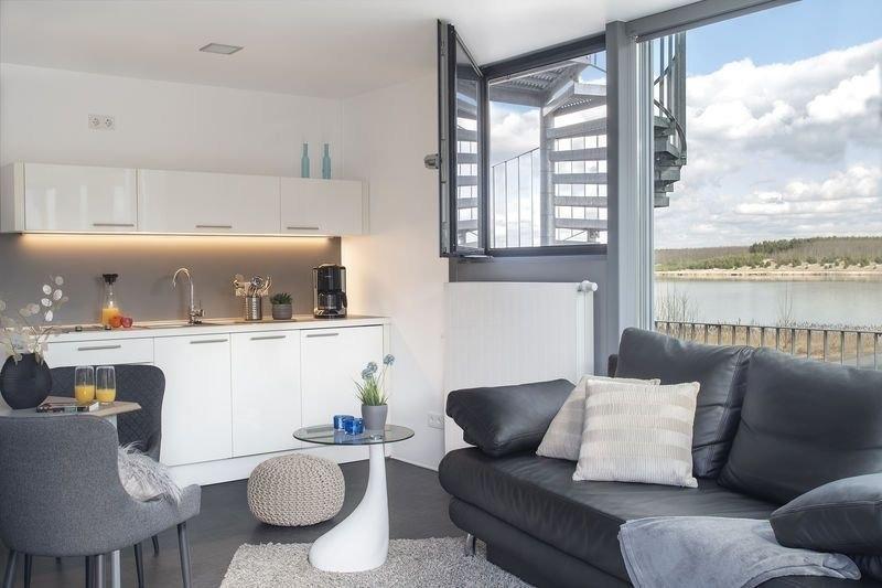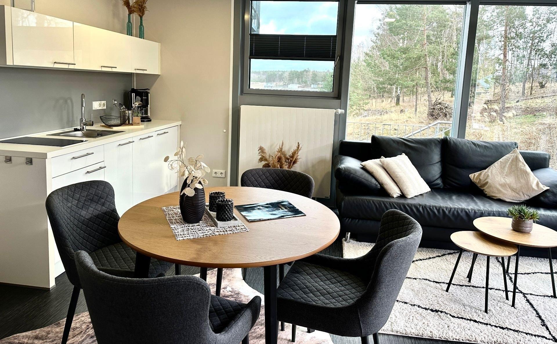Genießen Sie in unseren komfortablen, geschmackvoll eingerichteten und lichtdurchfluteten Appartements Düne Ihren Aufenthalt im Lausitz Resort. Diese Appartements befinden sich im 1. Obergeschoss des Strandhauses und bieten auf ca. 35 m² Platz für 2 Personen. Ausstattungsmerkmale:Wohn-/Schlafbereich voll klimatisiertDoppelbett im abgegrenzten WohnbereichWohnsofaTV Flachbildschirm mit Radiooffene, voll ausgestattete Küche (Geschirrspüler mit Startpaket, Kühlschrank, 2 Ceran - Kochfelder, Bistroofen, Kaffeemaschine, Wasserkocher), diverse KüchenutensilienBadezimmer mit Dusche/WC, Schminkspiegel und Föhnausgestattet mit Bettwäsche und Handtücher Sonnenterrasse mit Sonnenliegen und EssbereichWLAN inklusiveein kostenfreier PKW-StellplatzHundemitnahme nur unter Voranmeldung möglich