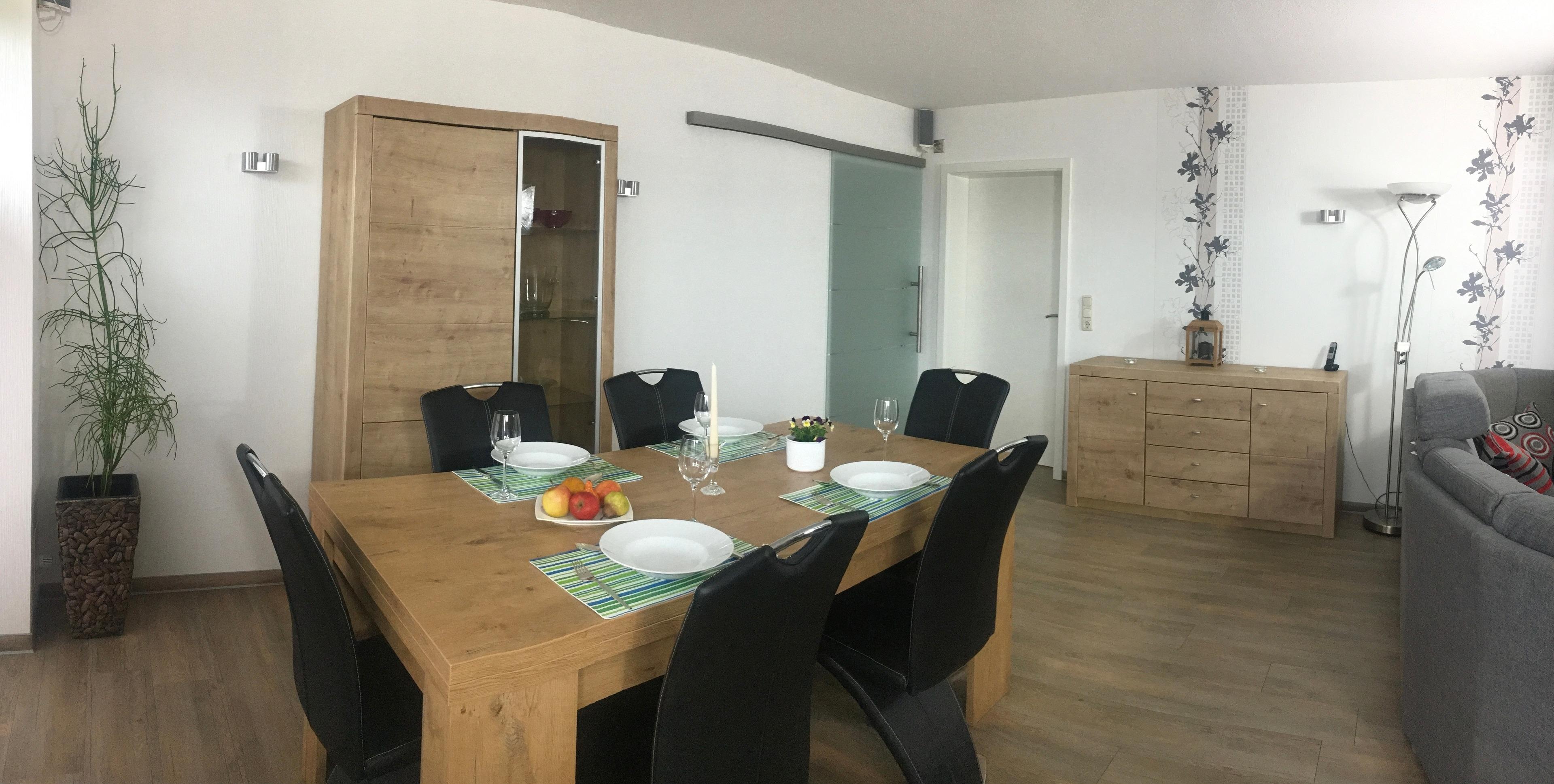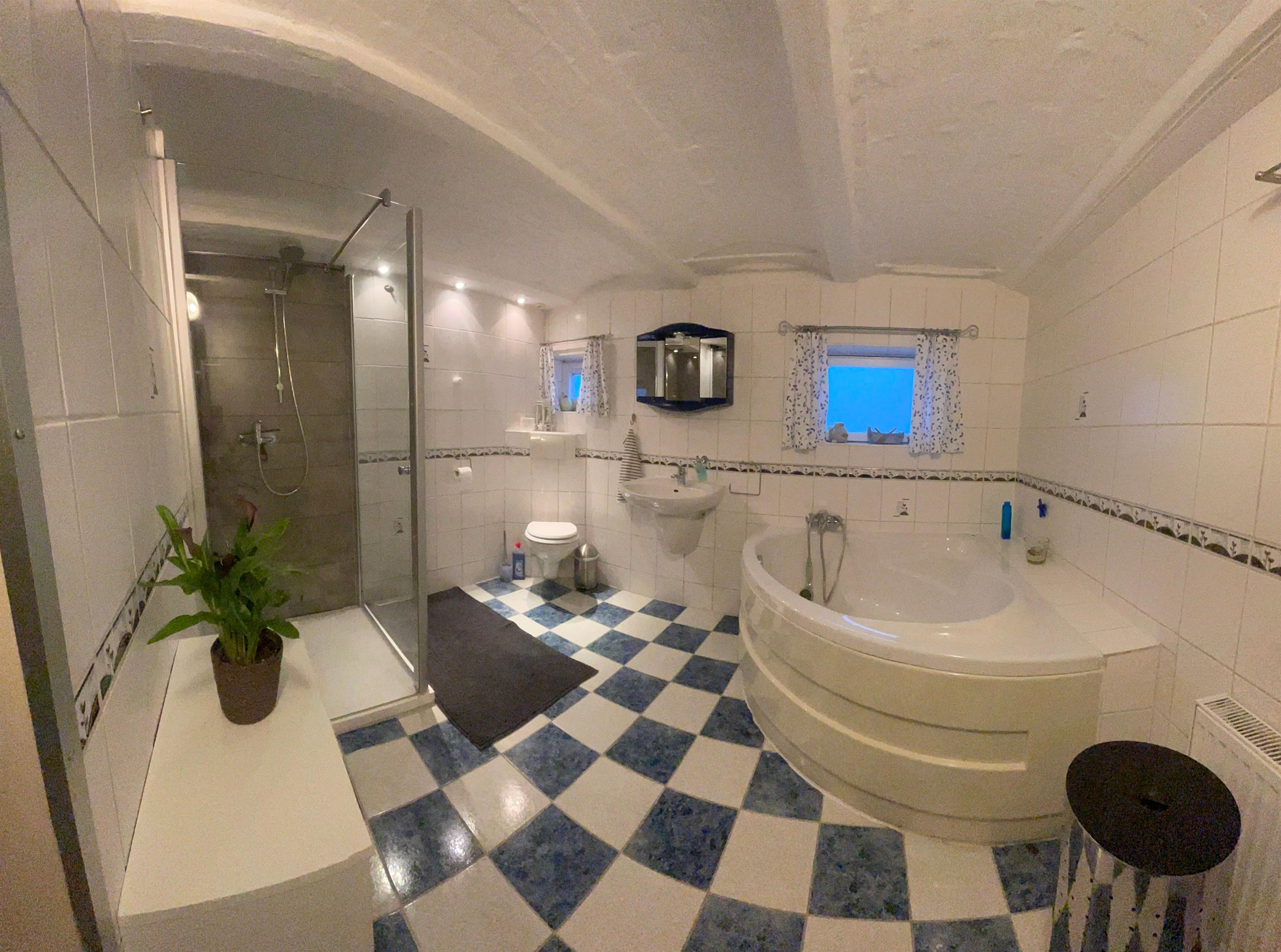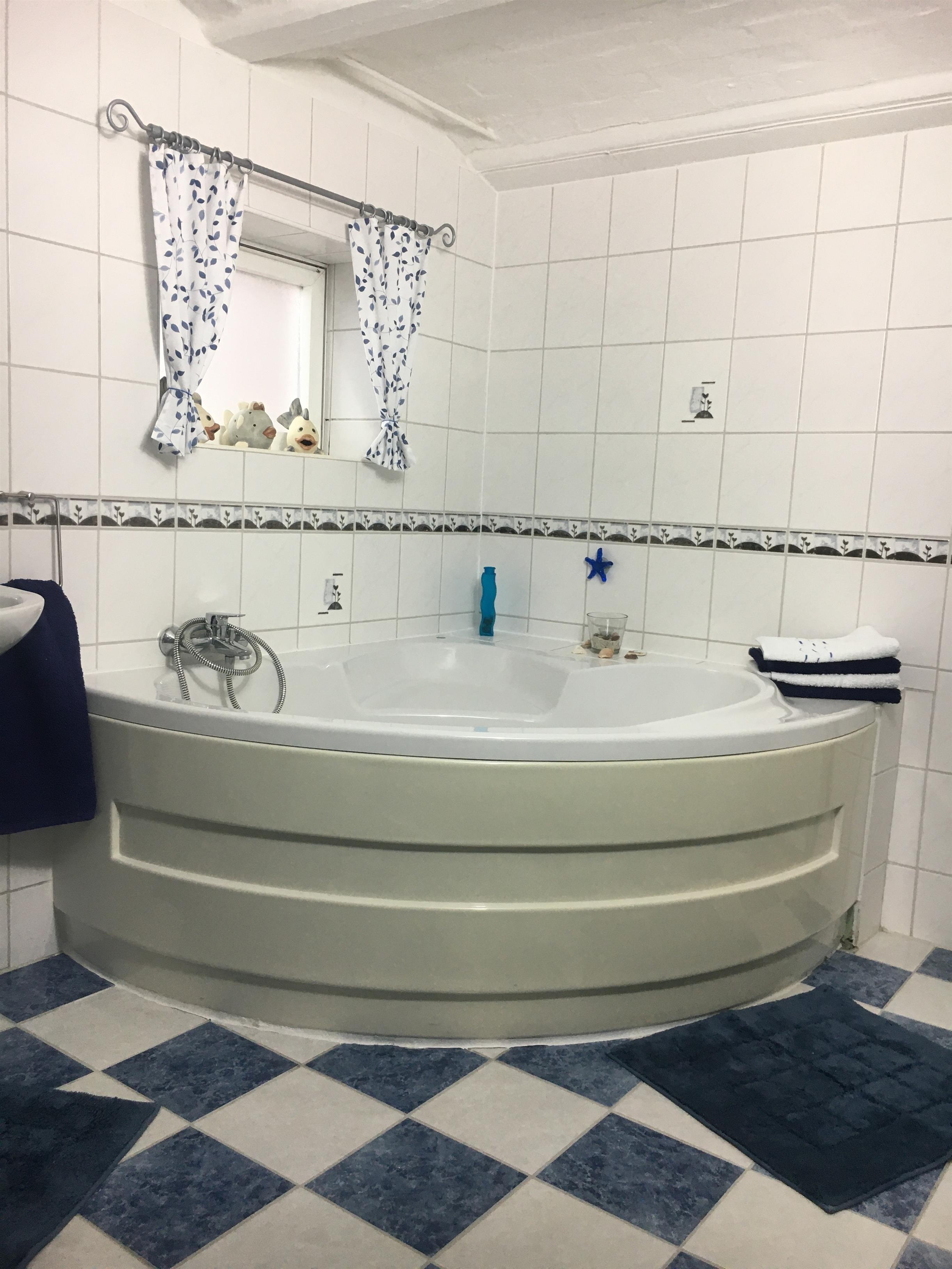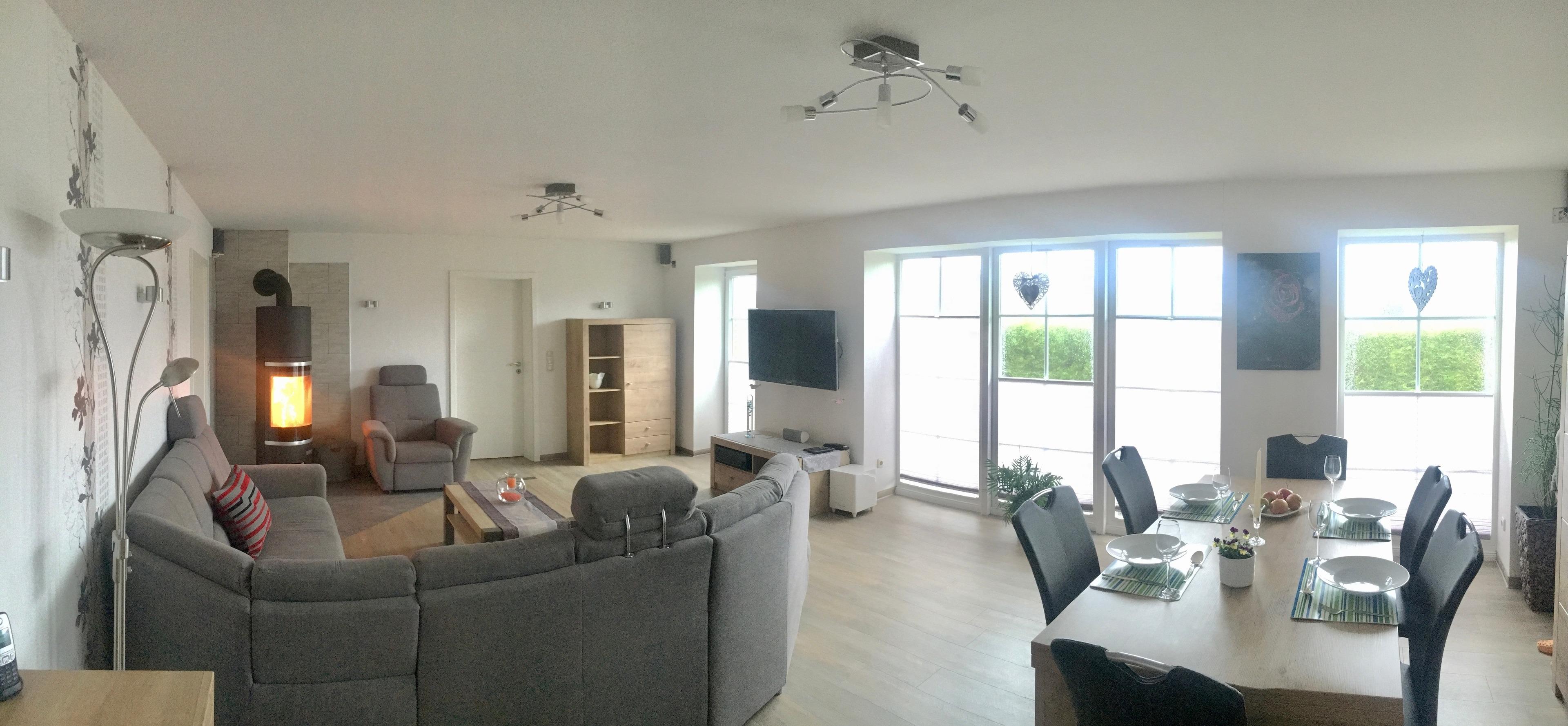 Das Badezimmer ist mit einer Dusche und einer Eckbadewanne ausgestattet. In der hochwertigen Einbauküche finden Sie alles, was Sie zum Kochen und Backen benötigen, sowie eine Sitzgelegenheit. Das Wohnzimmer verfügt über einen großzügigen Esstisch mit 6 Stühlen sowie eine bequeme Sitzgruppe vor dem Kaminofen. Holz für den Ofen kann vor Ort erworben werden.