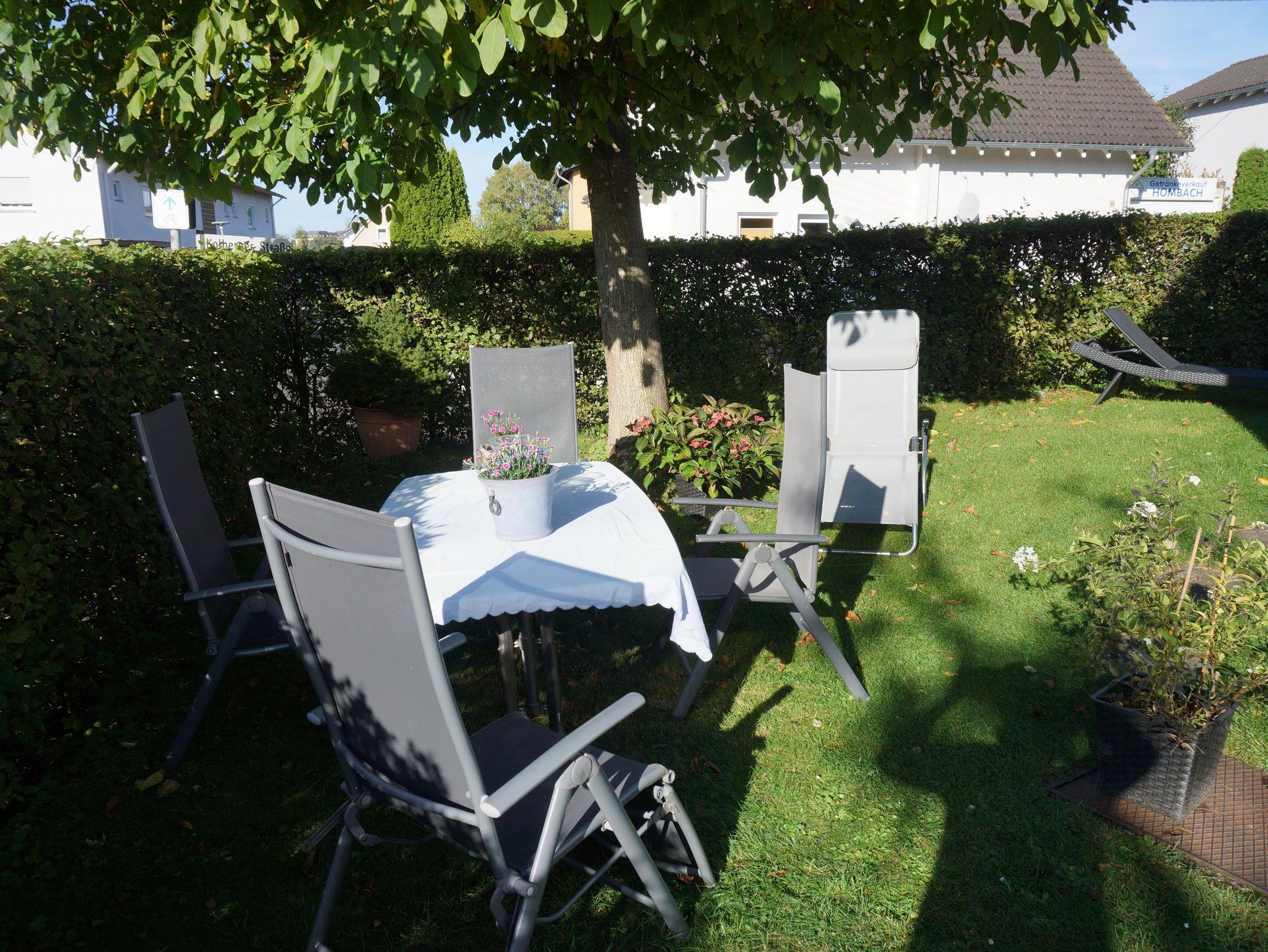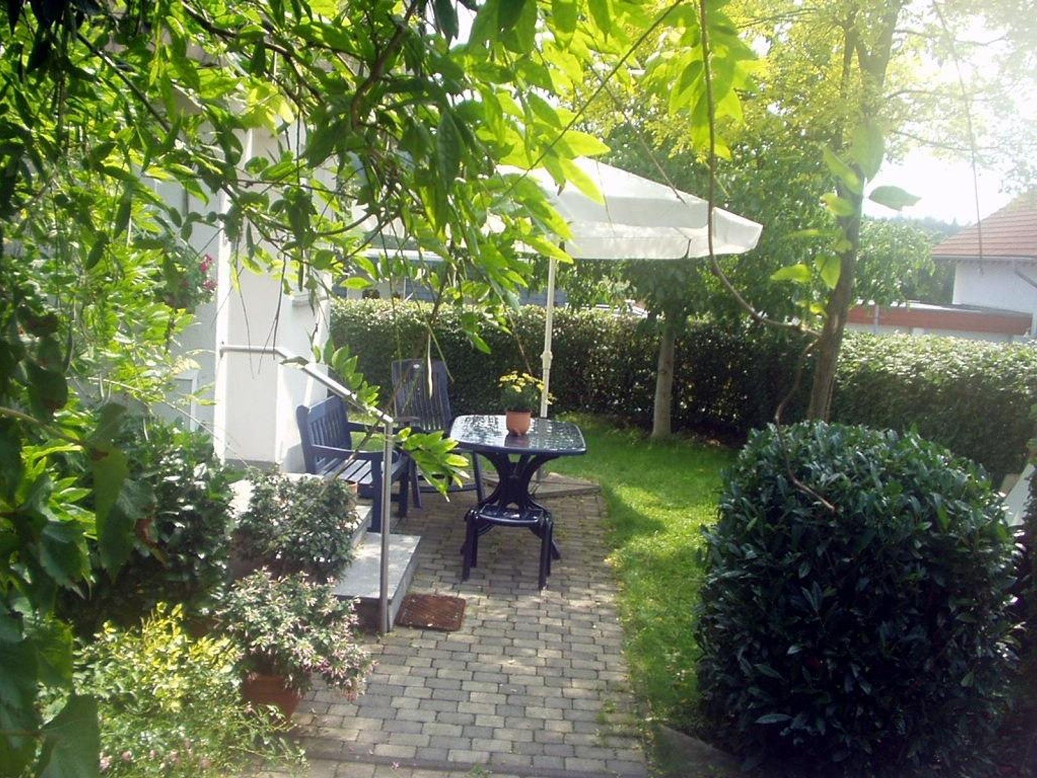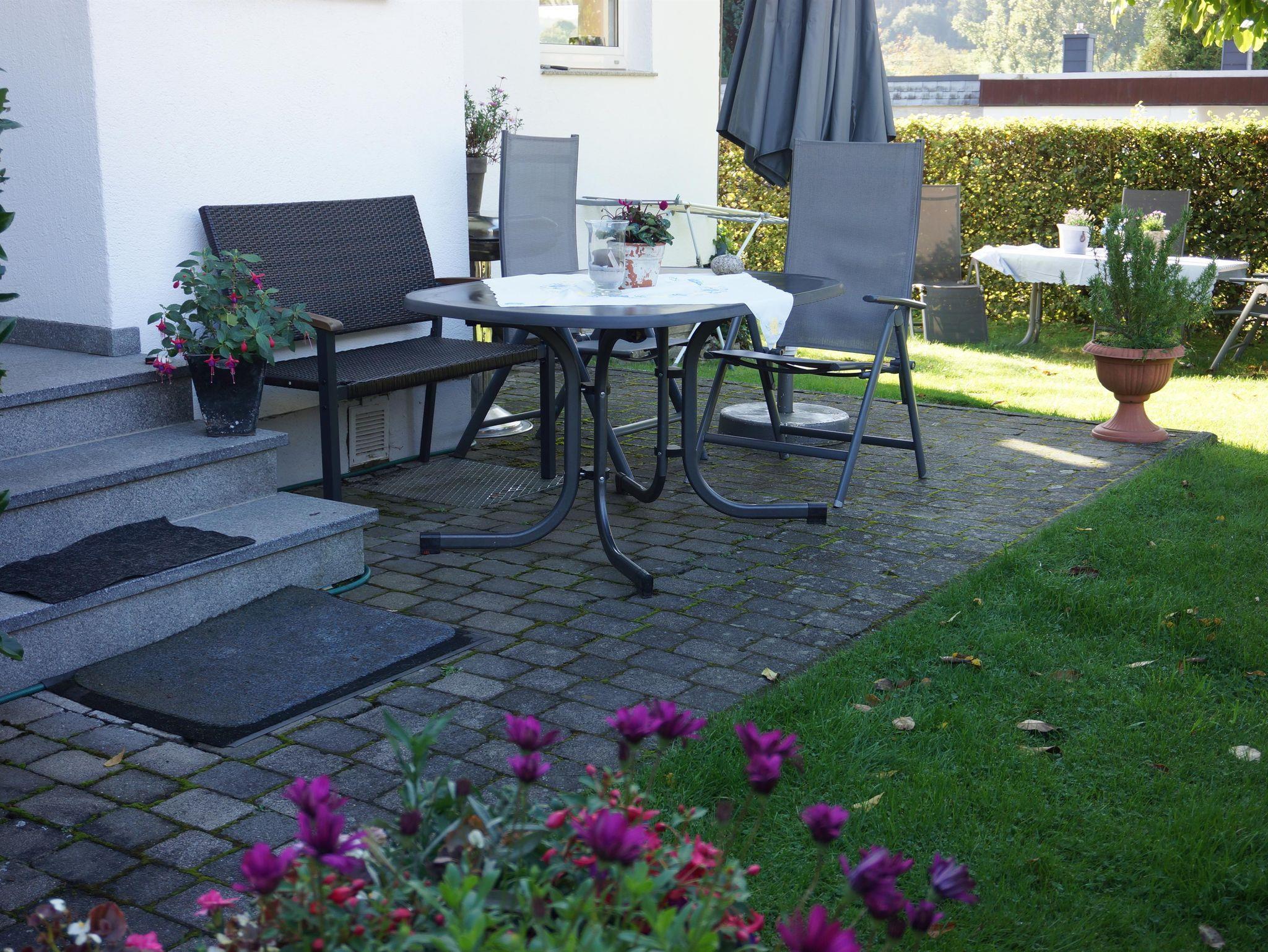 Terrasse und Garten mit Sitzplätzen und Grill.