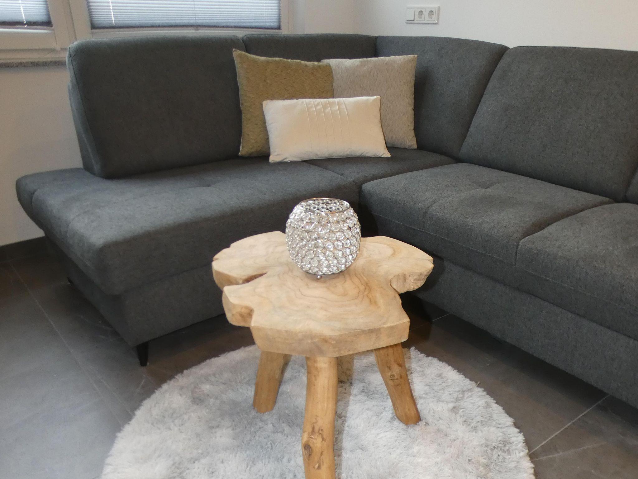 Wenn man in der Küche links abbiegt kommt man in den Wohn- und Esszimmerbereich. In diesem befindet sich ein großer Tisch, an dem mindestens 8 Personen Platz finden. Auch ein schönes Ecksofa ist vorhanden, auf welchen man es sich vor dem hängenden Fernseher gemütlich machen kann. Falls doch mal mehr Kinder mitfahren sollten, kann man das bequeme Sofa auch ausziehen und hat somit nochmals Platz für 2 weitere Kinder.