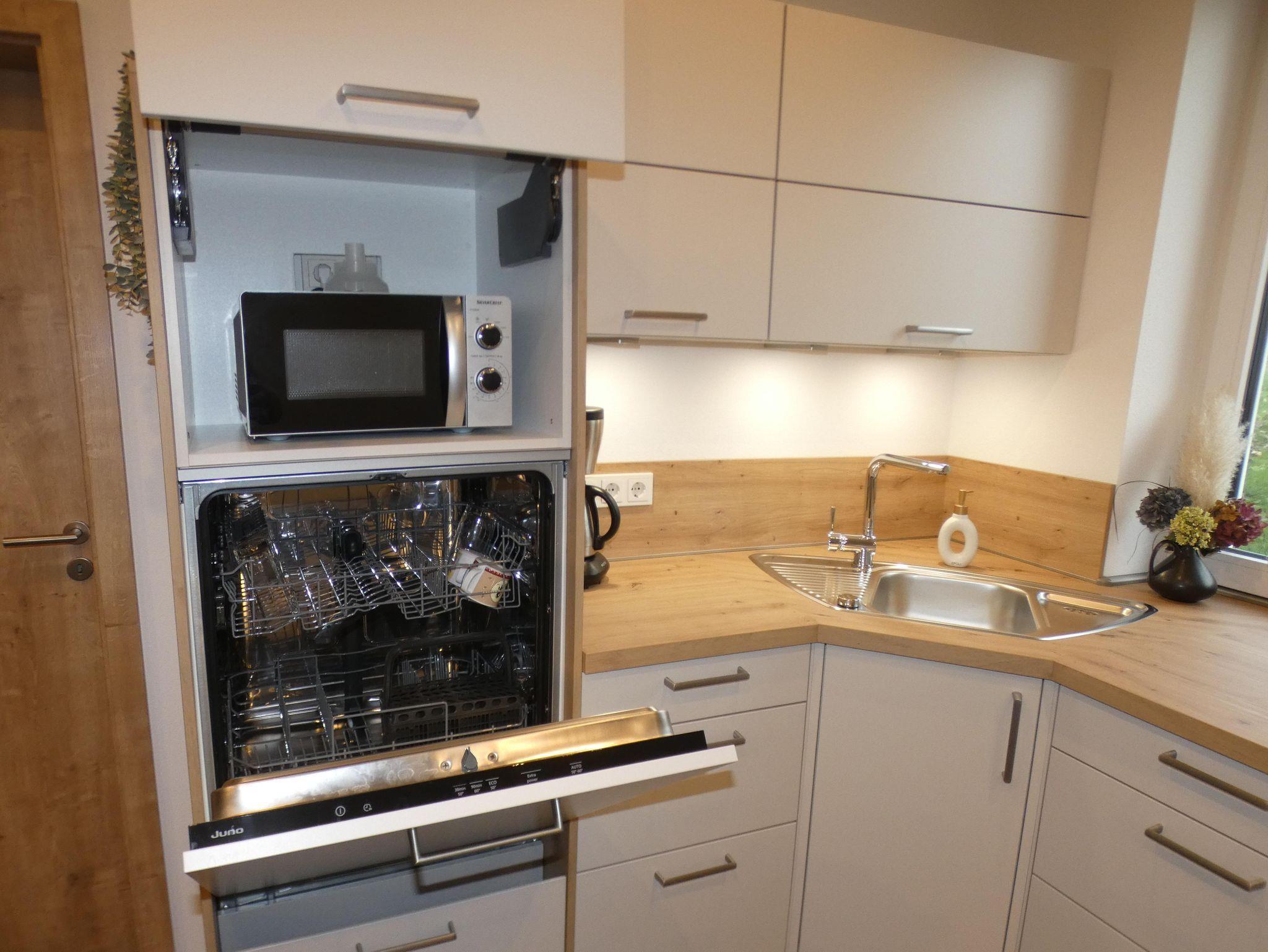 Die Küche ist mit einem 4 Platten-Herd mit Backofen, Spüler, einer Mikrowelle, einem Wasserkocher, einer Kaffeemaschine, einem Toster und den notwendigen Küchenutensilien uvm. ausgestattet.