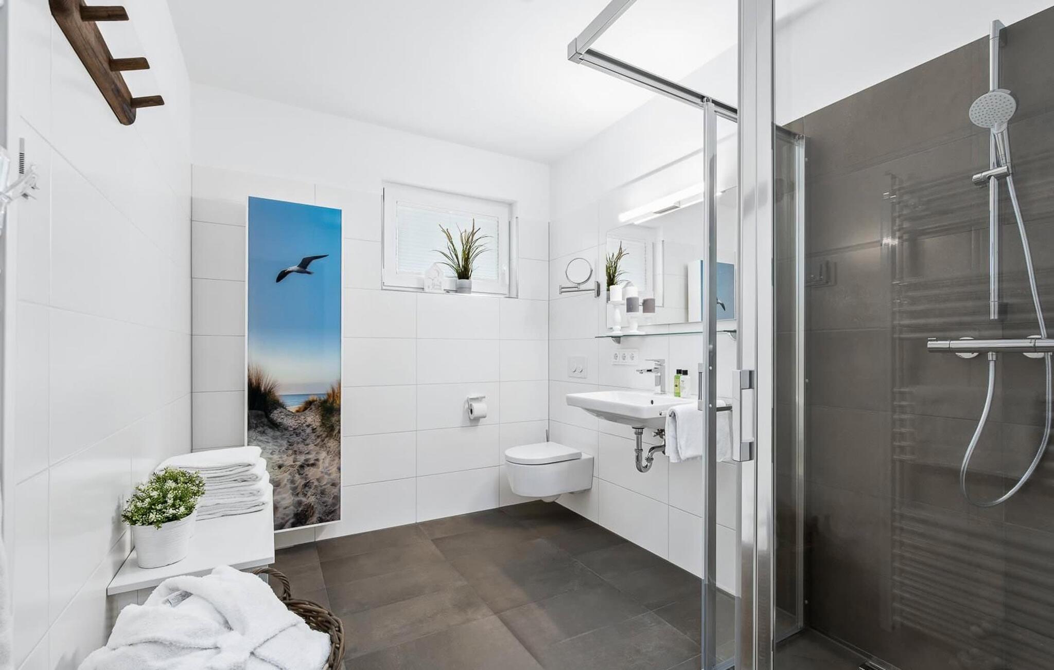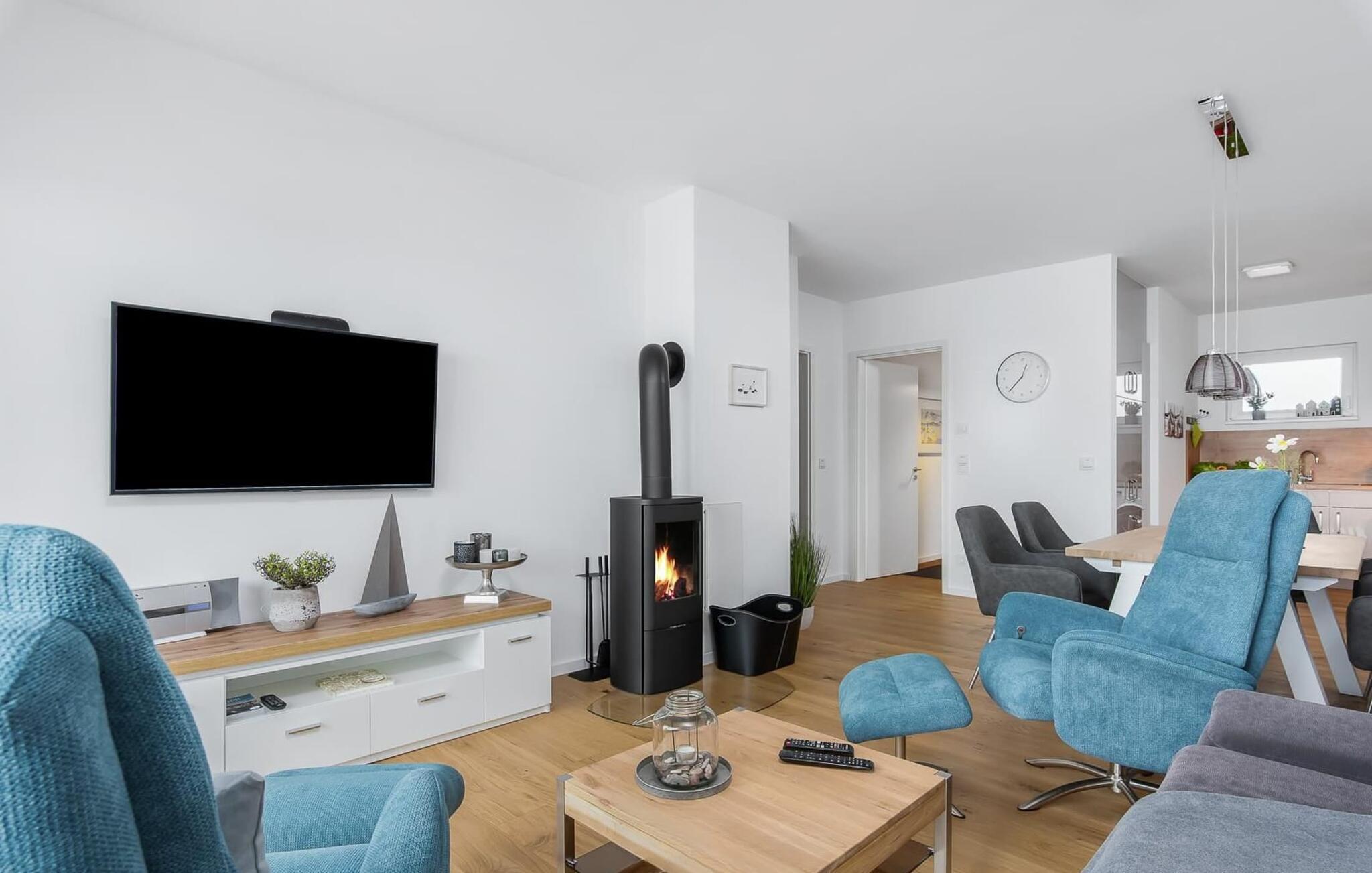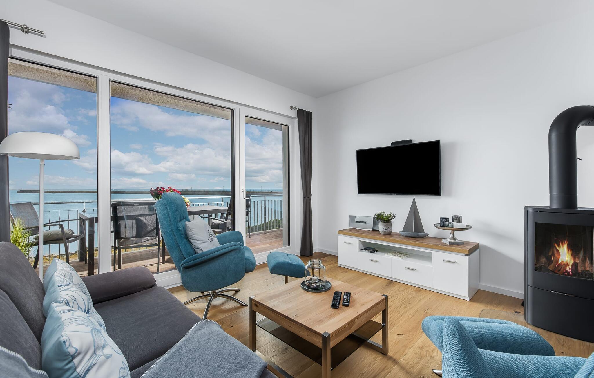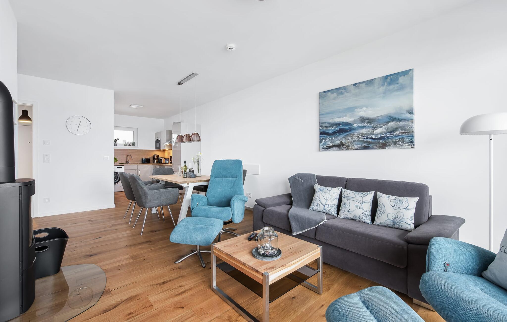 Das Duschbad steht euch hilfreich zur Seite um morgens frisch in den Tag zu starten. Und wenn ihr dann den Wohn-Essraum betretet, glaubt ihr, ihr träumt immer noch: die aufgehende Morgensonne begrüßt euch und die Ostsee liegt euch zu Füßen. Eine Weite ohne Ende steht euch gegenüber. Dieser morgendliche Empfang ist auch außerhalb der warmen Jahreszeit durch die bodentiefen, großen Fensterelemente garantiert. Zusätzlich verwöhnt euch dann auch der Kaminofen mit prasselndem Feuer, um es richtig wohlig zu machen. Außerdem bietet das Wohnzimmer neben einem zweiten Fernseher auch ein gemütliches Schlafsofa für eine weitere Person.