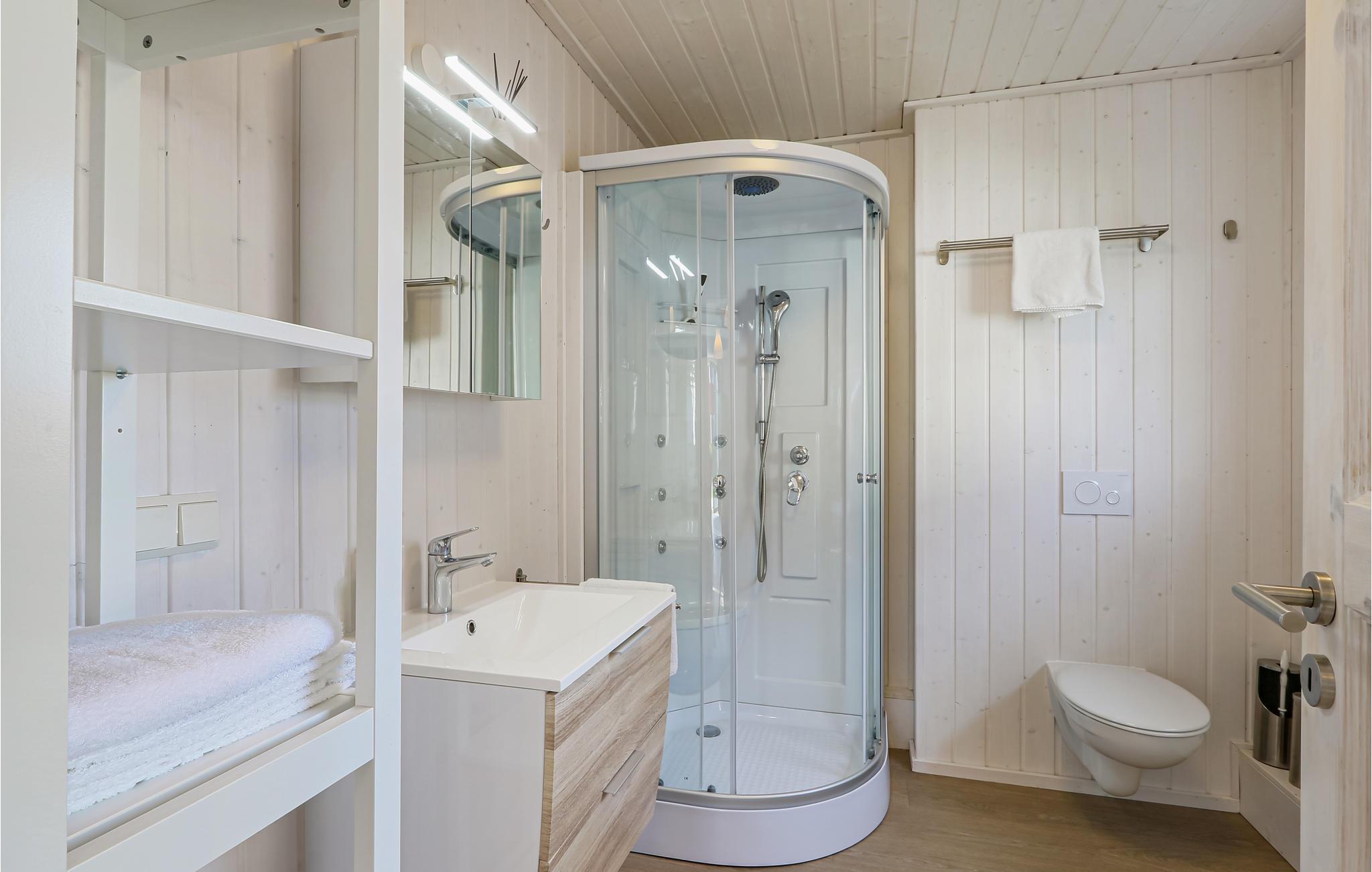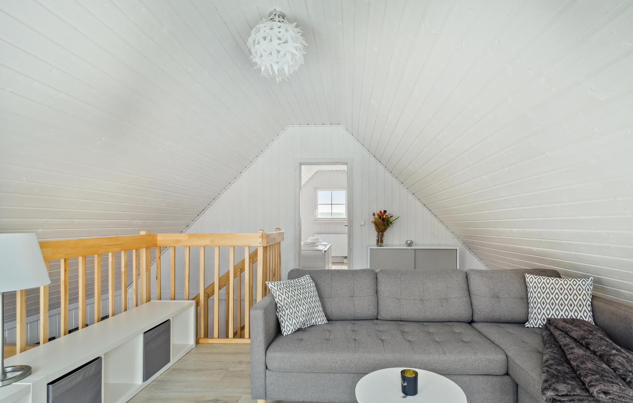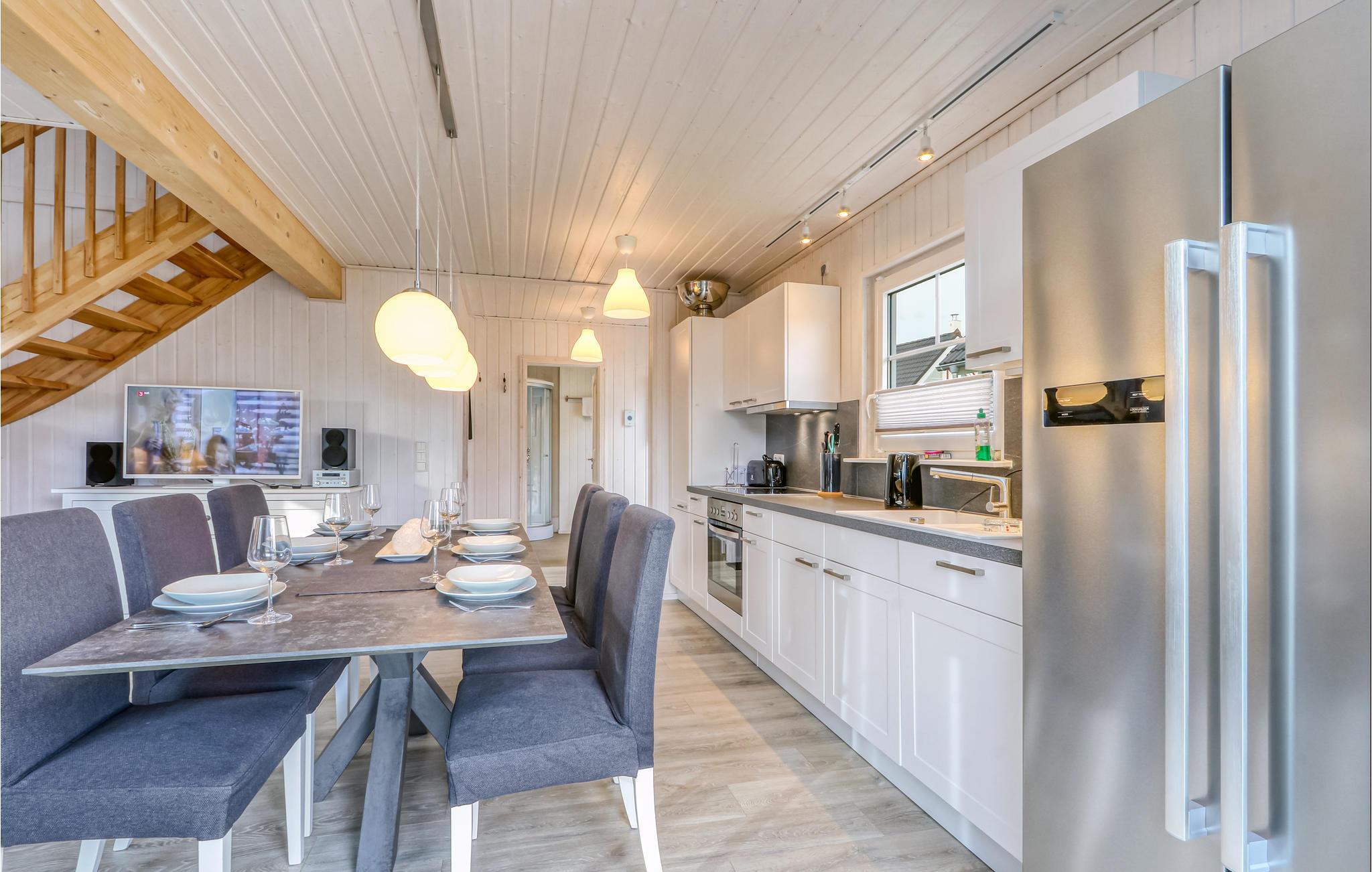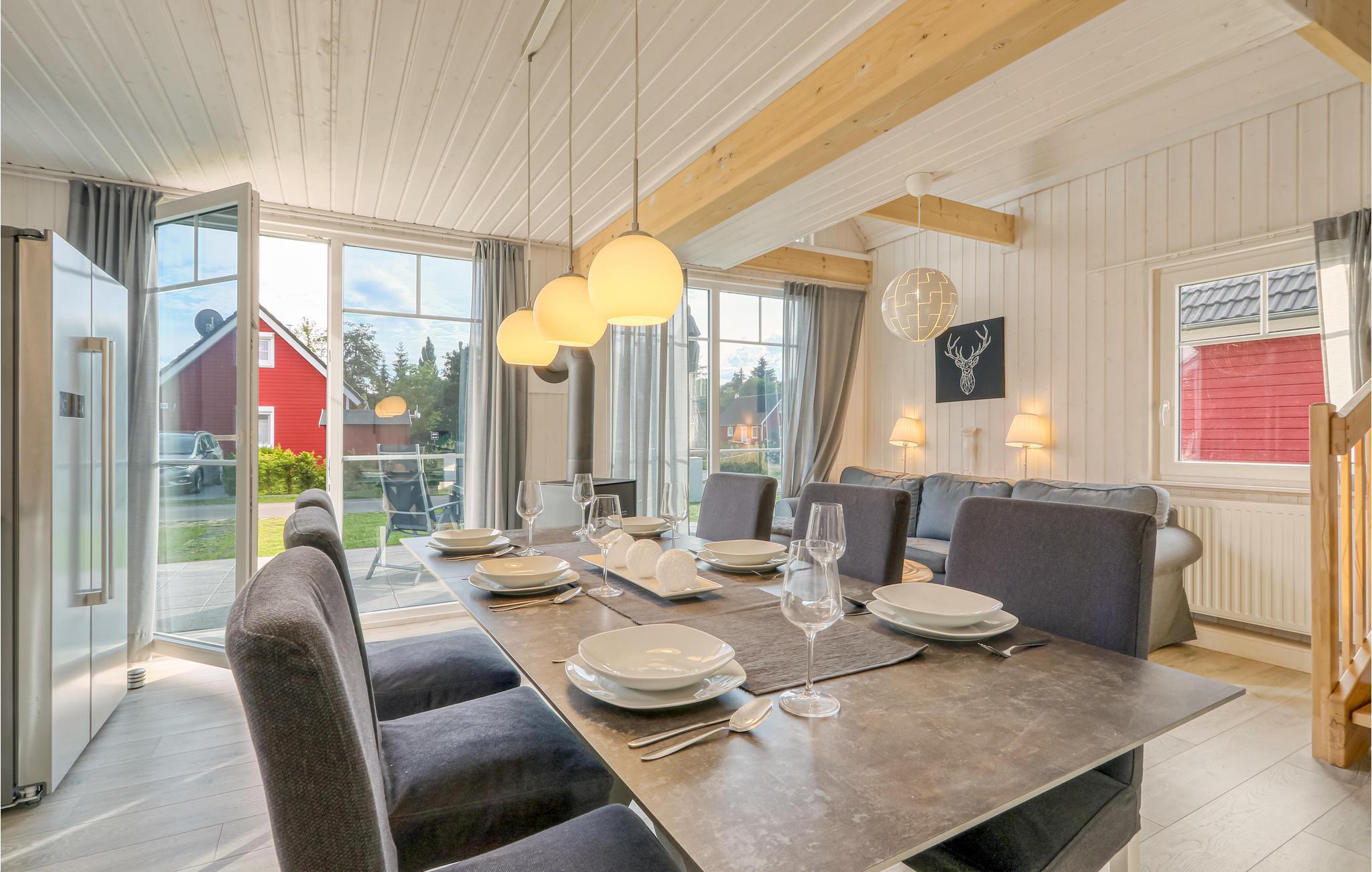 Das Ferienhaus verfügt über eine moderne Einbauküche mit angrenzendem Ess- und Wohnbereich. Dieser lädt zu einem gemeinsamen Essen und angenehmen Gesprächen ein. Auf der Galerie im ersten Obergeschoss können Sie durch die bodentiefe Panoramaverglasung einen einzigartigen Blick über das Grundstück und in die Natur genießen. Das Ferienhaus verfügt über zwei helle Schlafzimmer. Im ersten Schlafzimmer befindet sich ein großzügiges Doppelbett, im Obergeschoss nächtigen Sie in drei Einzelbetten. Das Duschbad mit Tageslicht und hochwertiger Wellnessdusche rundet Ihren gelungenen Urlaubstag ab.