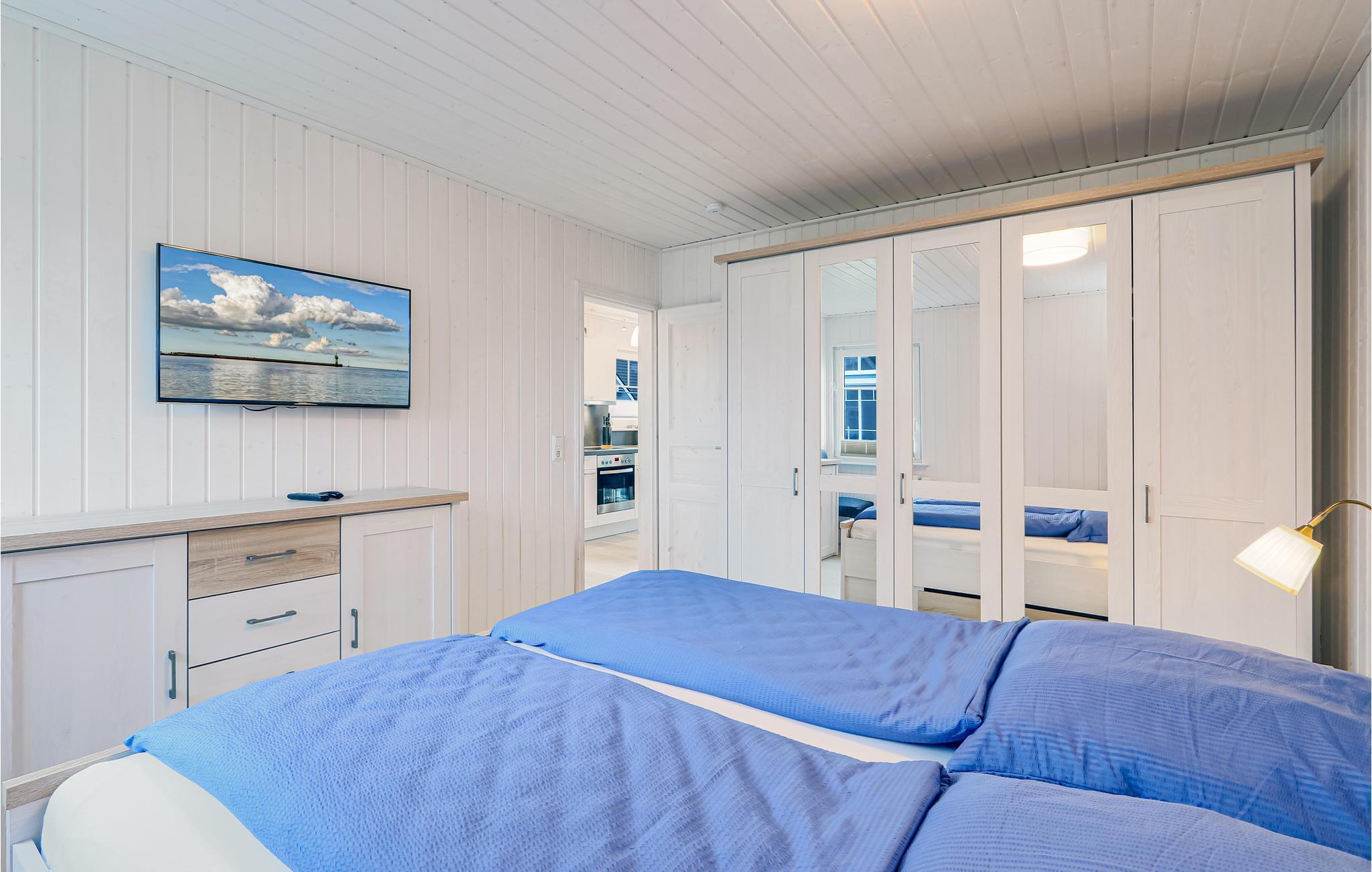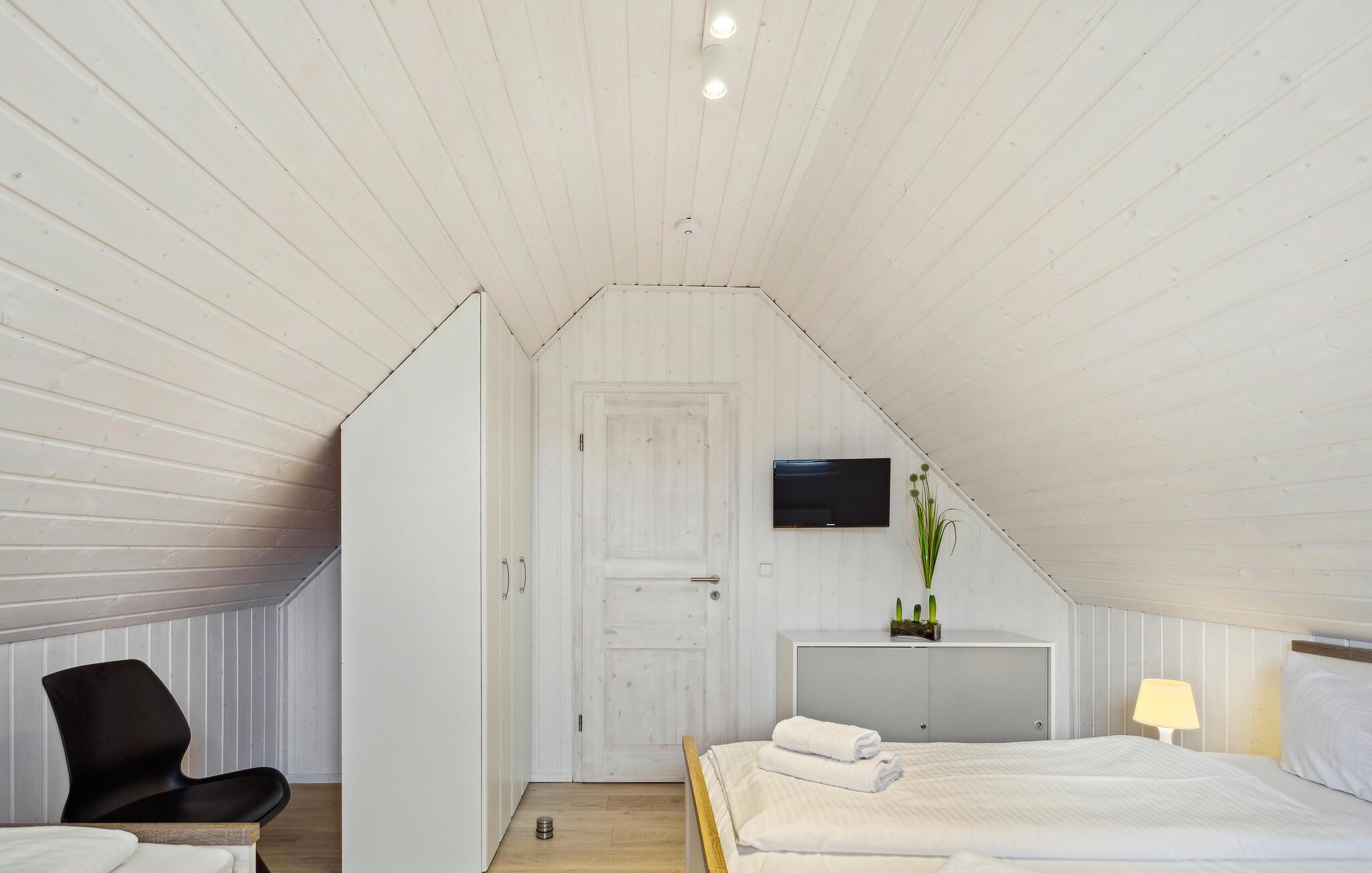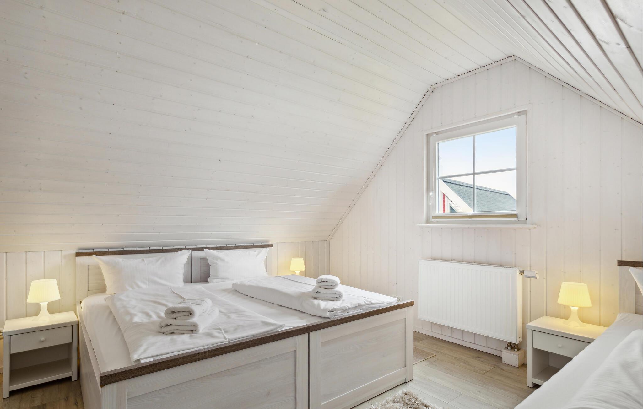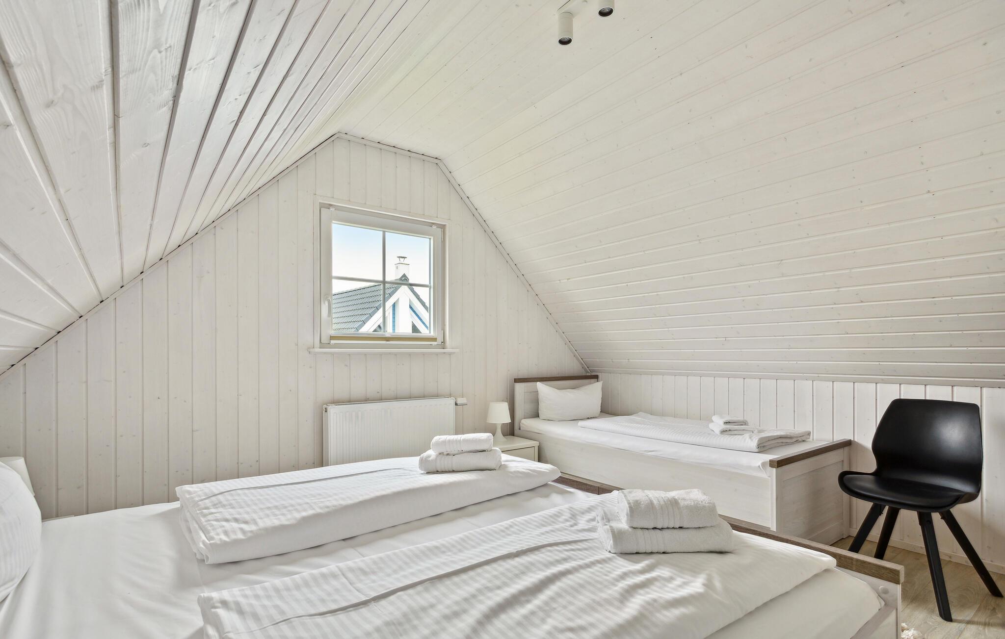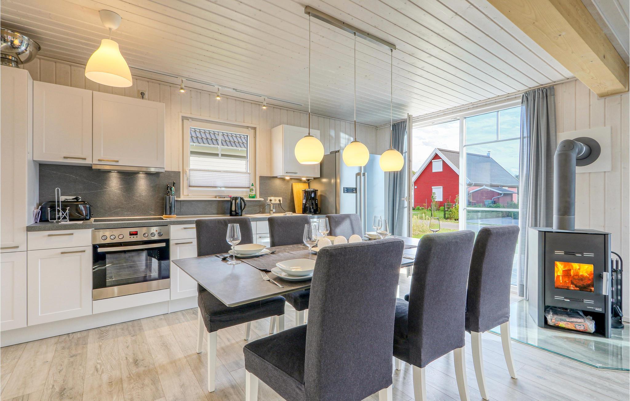 Das Ferienhaus verfügt über eine moderne Einbauküche mit angrenzendem Ess- und Wohnbereich. Dieser lädt zu einem gemeinsamen Essen und angenehmen Gesprächen ein. Auf der Galerie im ersten Obergeschoss können Sie durch die bodentiefe Panoramaverglasung einen einzigartigen Blick über das Grundstück und in die Natur genießen. Das Ferienhaus verfügt über zwei helle Schlafzimmer. Im ersten Schlafzimmer befindet sich ein großzügiges Doppelbett, im Obergeschoss nächtigen Sie in drei Einzelbetten. Das Duschbad mit Tageslicht und hochwertiger Wellnessdusche rundet Ihren gelungenen Urlaubstag ab.