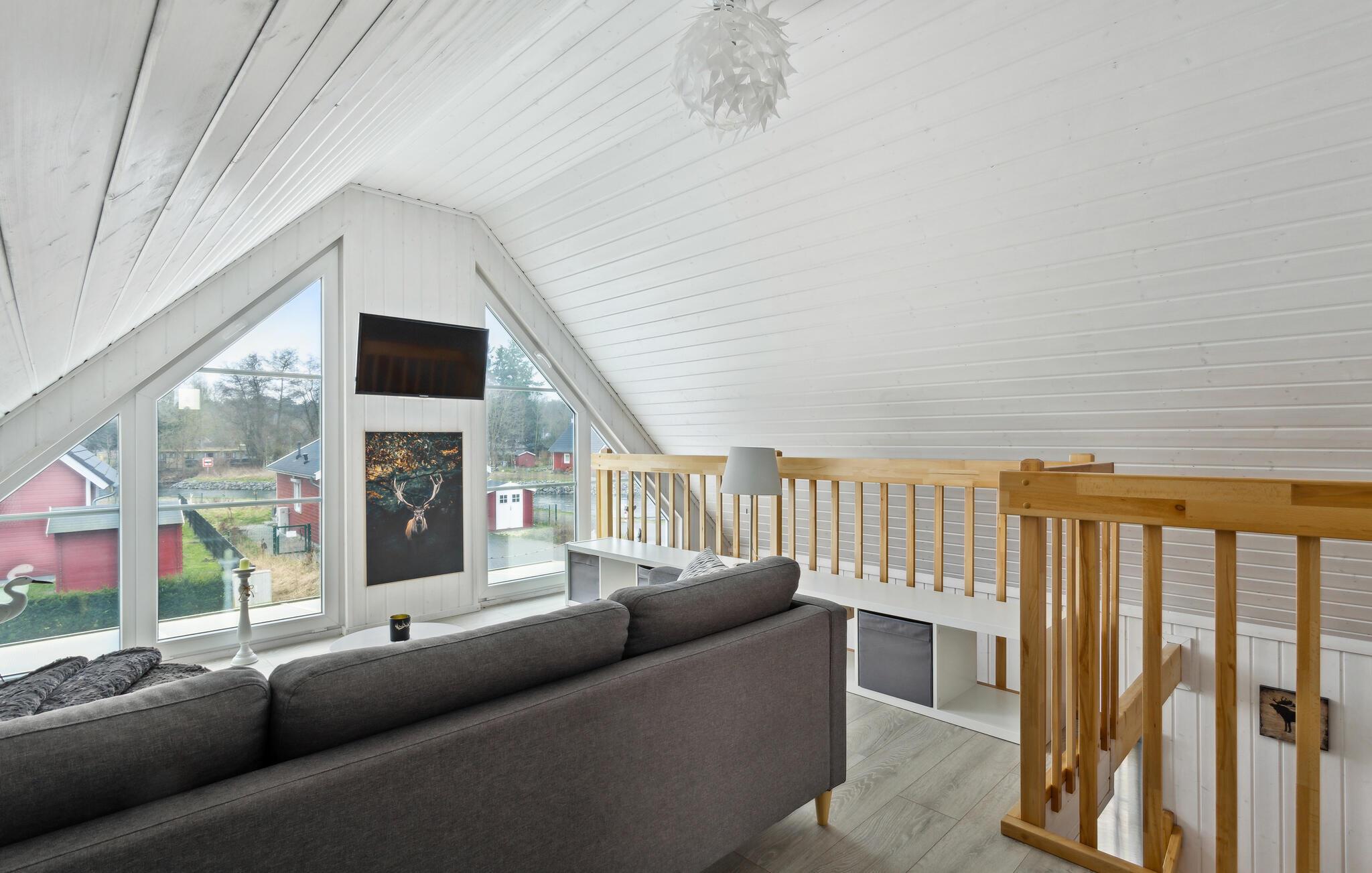 Dieses lichtdurchflutete Ferienhaus "Biber" liegt hat einen herrlichen Blick auf den See und den Hafen. Die Sonnenterrasse lädt zum Verweilen und entspannen ein, Gartenmöbel und Grill sind vorhanden, sodass Sie gemeinsame Grillabende genießen können. Ob auf der Terrasse für angenehme Sommerabende, vor dem Kamin am knisternden Feuer oder auf der offenen Galerie: Entspannung ist hier garantiert.
