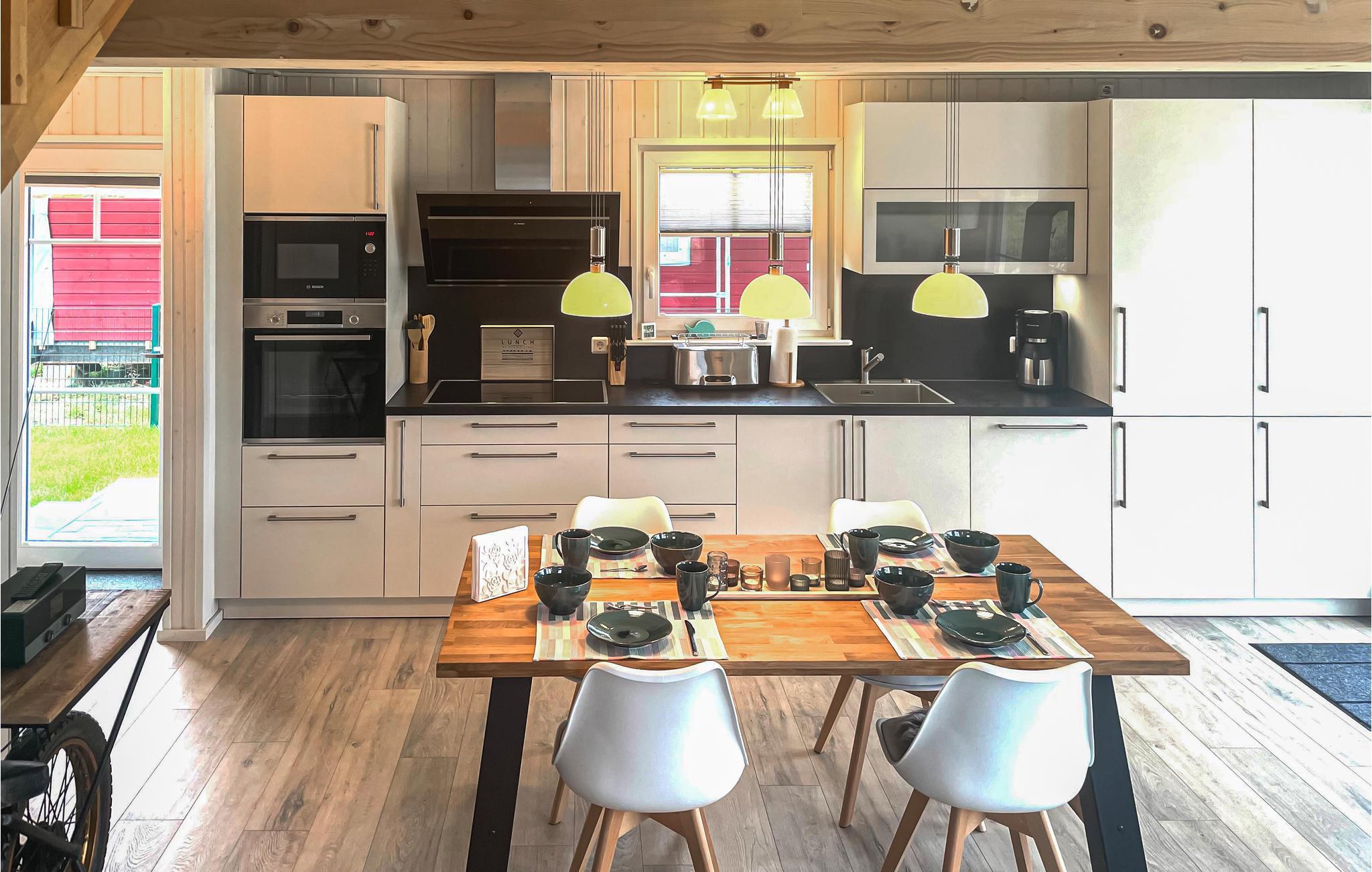 Das Hafendorf Zerpenschleuse liegt im Norden Brandenburgs, zwischen Wasser, Wiesen und Wäldern. Durch die großen Panoramafenster ist das Ferienhaus besonders hell und freundlich. Im Wohnzimmer im Erdgeschoss können Sie es sich vor dem Feuer des Kaminofens gemütlich machen. Eine Kaminholz Grundausstattung für den ersten Tag wartet bereits für Sie. Für Unterhaltung sorgen unbegrenztes WLAN, ein Smart TV und eine kleine Stereoanlage. Ein Bügelbrett und Bügeleisen sind ebenfalls für Sie vorhanden.
