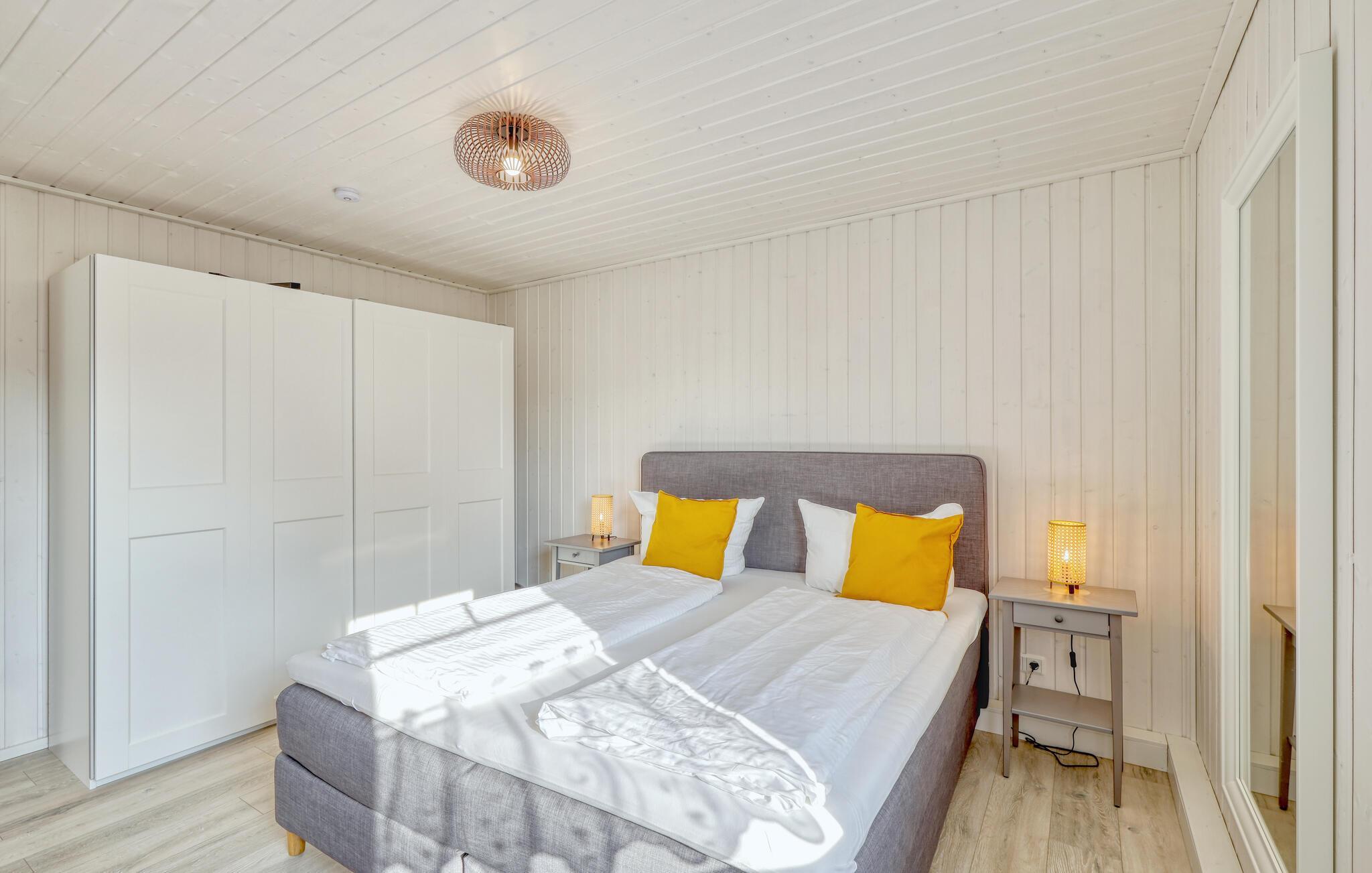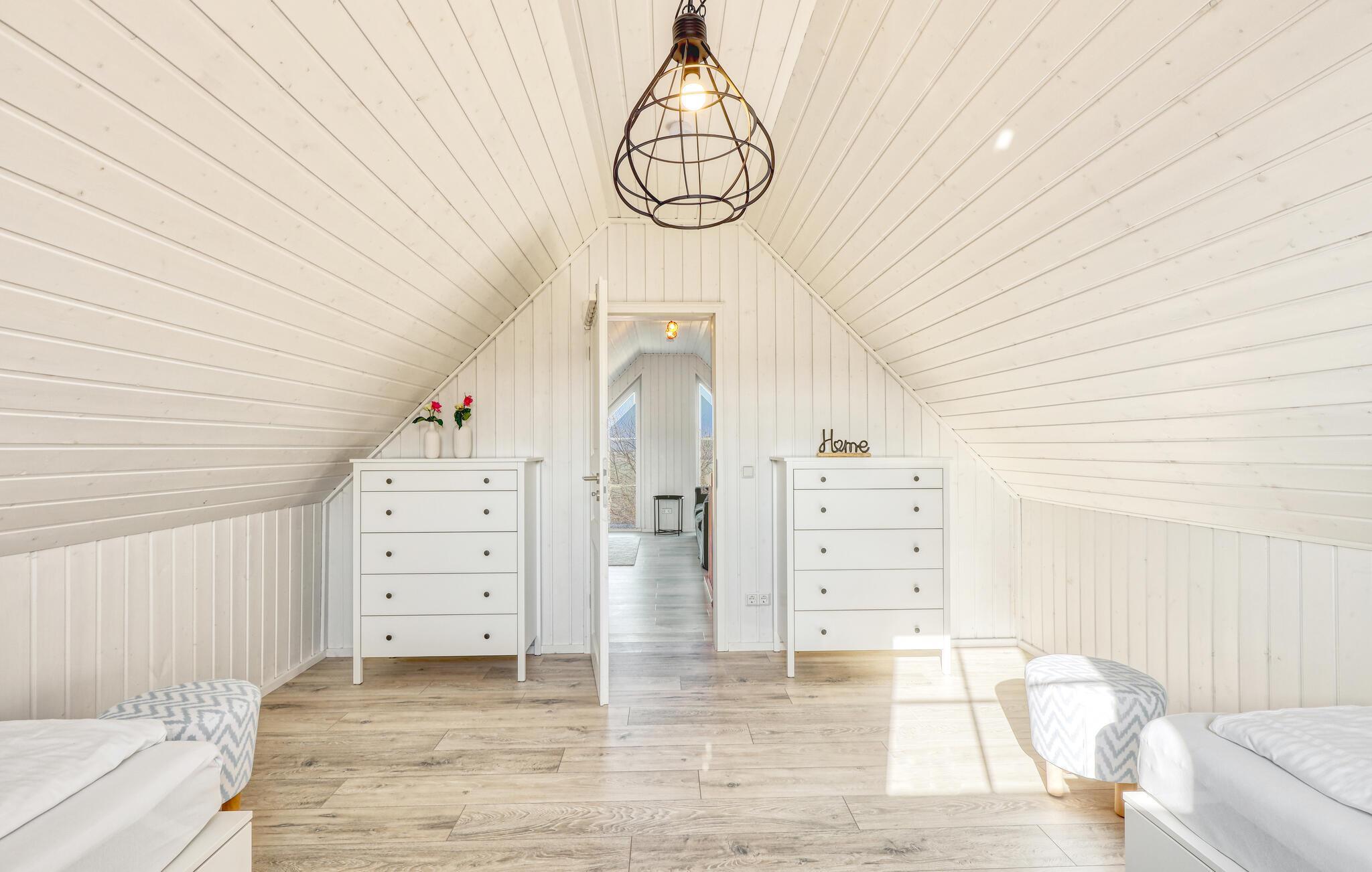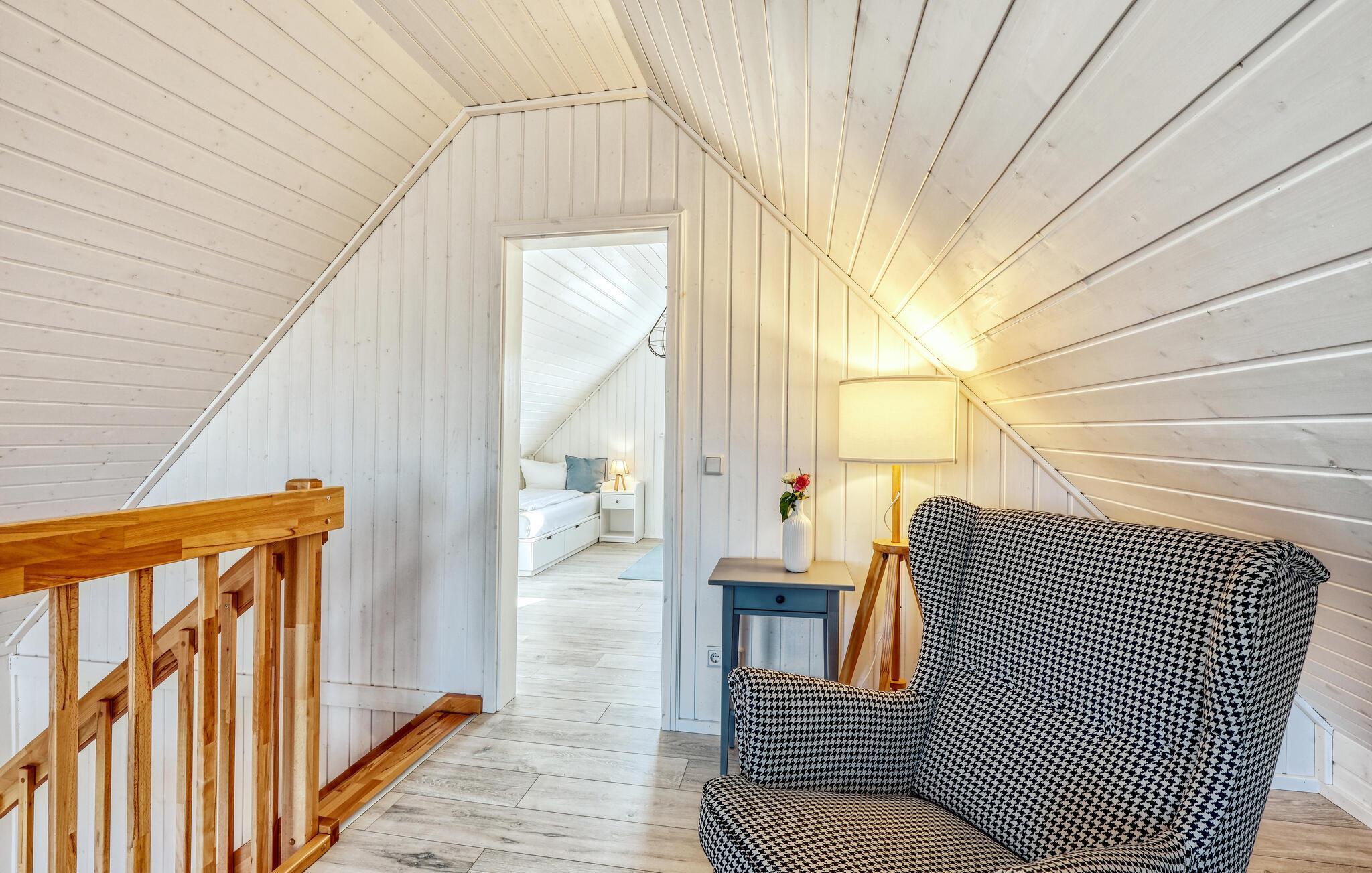 Das Ferienhaus verfügt über eine moderne Einbauküche mit angrenzendem Ess- und Wohnbereich. Dieser lädt zu einem gemeinsamen Essen und angenehmen Gesprächen ein. Auf der Galerie im ersten Obergeschoss können Sie durch die bodentiefe Panoramaverglasung einen einzigartigen Blick über das Grundstück und in die Natur genießen. Freuen Sie auf ruhige Nächte in den zwei hellen Schlafzimmern.