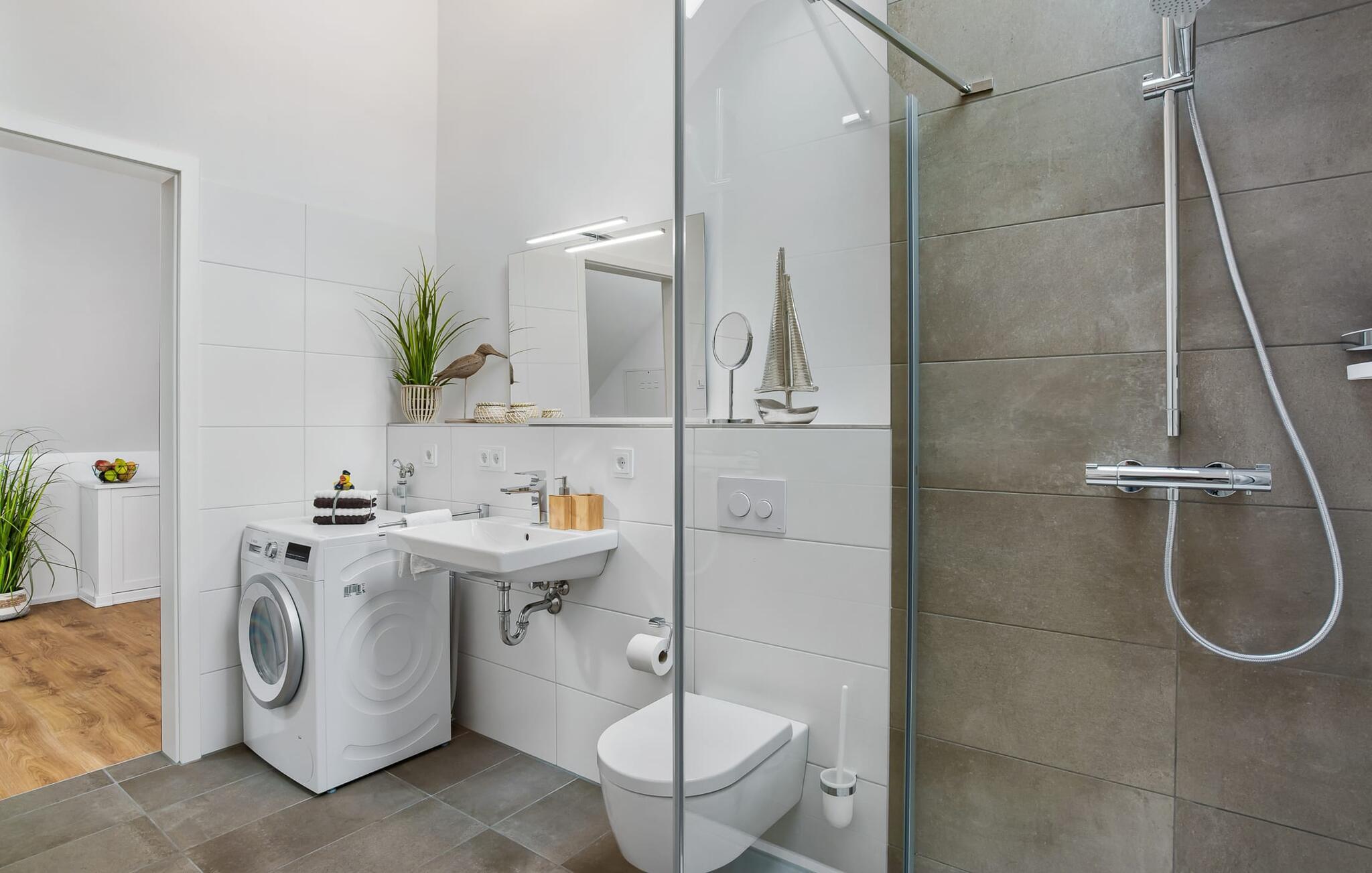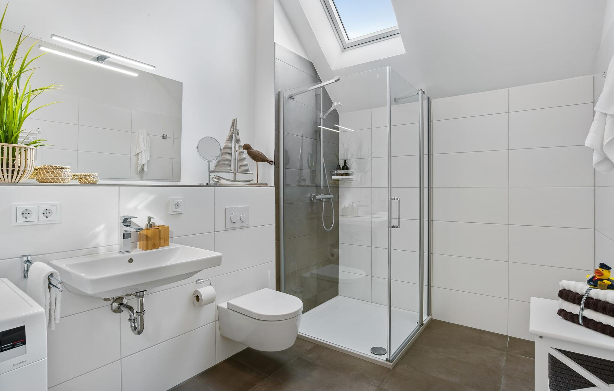 Im geräumigen Bad befindet sich neben allem Nützlichen eine bodengleiche Dusche für den gelungenen Start in einen neuen Urlaubstag.