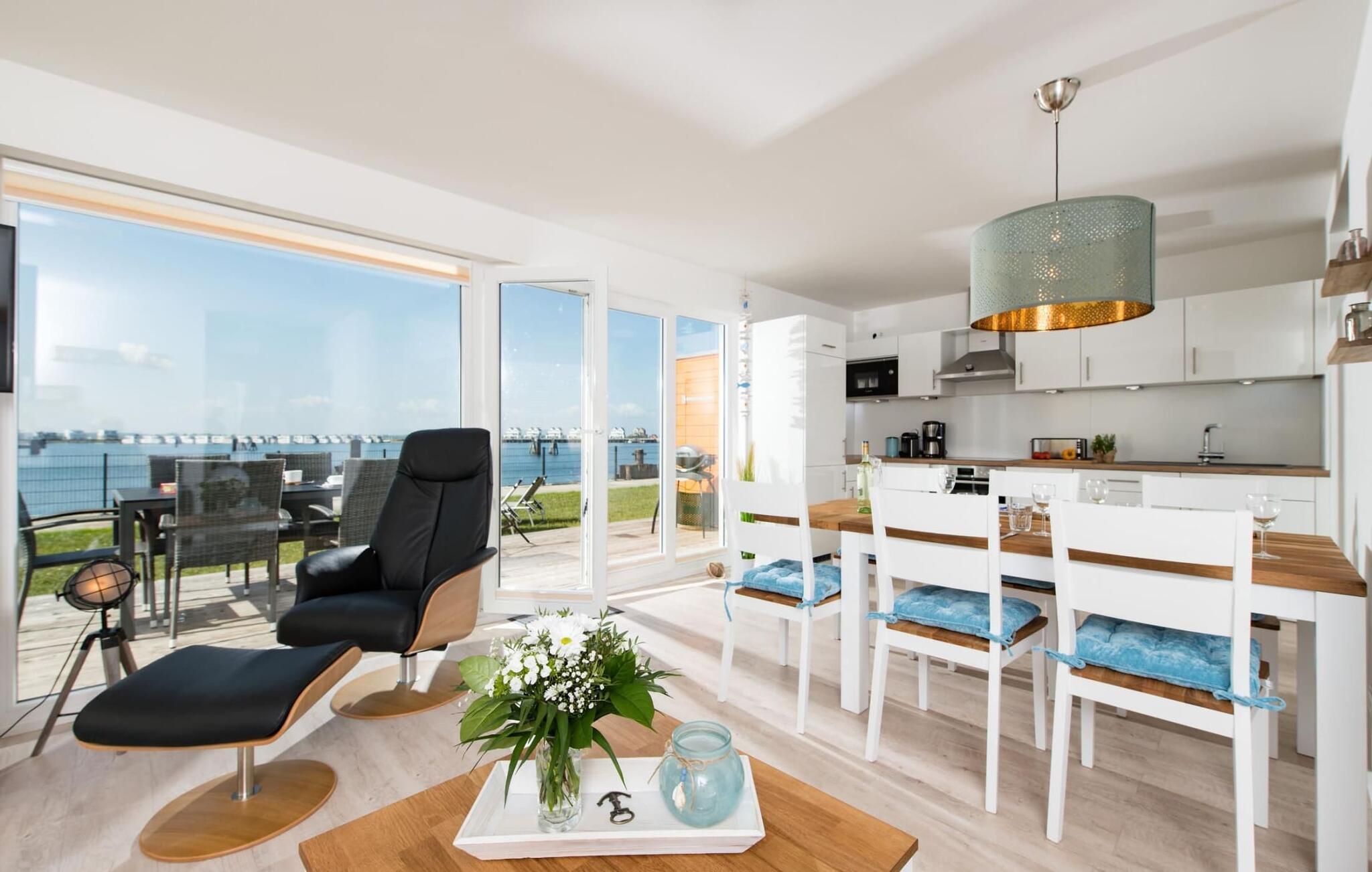 Traumhafte Aussichten eröffnen sich aus dem Wohnbereich und auf der angrenzenden Terrasse mit Blick über die Marina. Hafenkino sorgt hier für Unterhaltung während eines geselligen Grillabends mit Weber Elektrogrill oder romantischen Candle-Light-Dinners bei unvergesslichem Sonnenuntergang.