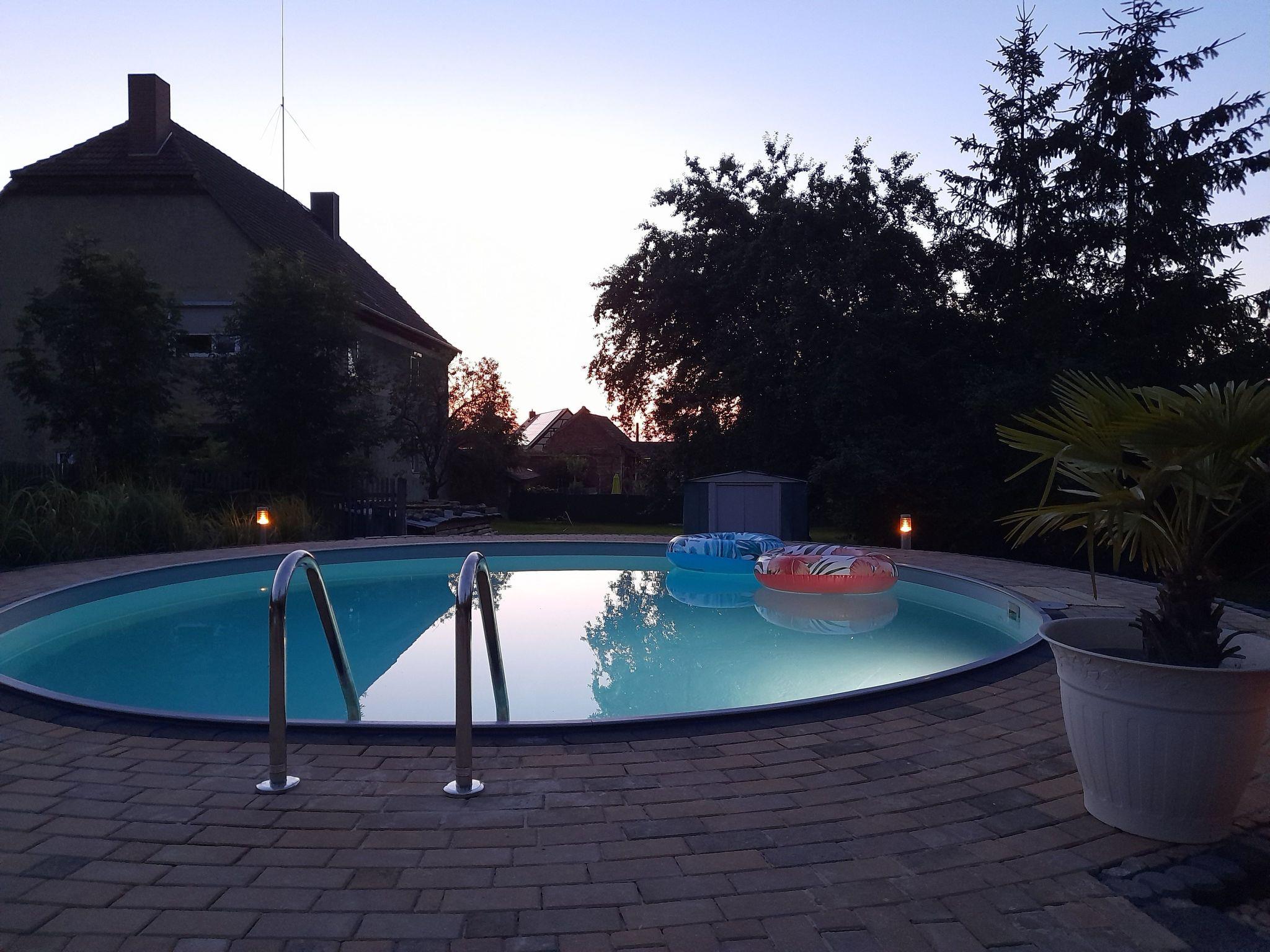 In the outdoor area, the approximately 6 metre diameter and 1.40 metre deep pool, which can be used from around mid-May until late autumn, invites you to relax. The garden, although not yet fully finished, is available for fun and games, and fruit trees and shrubs invite you to snack. Two terraces with sun loungers, garden furniture and barbecue, as well as a new, covered seating area offer plenty of space for outdoor activities and relaxation.