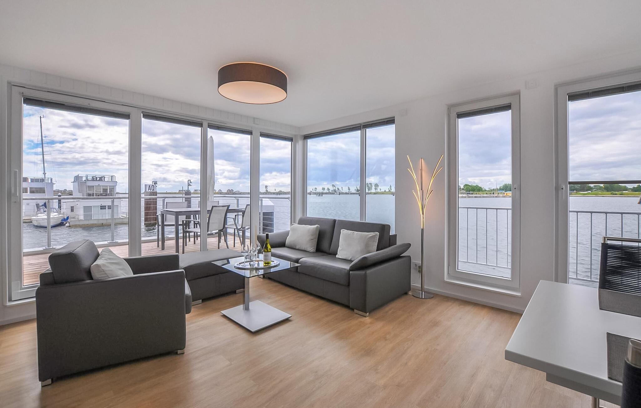 Ein Highlight des schwimmendes Ferienhauses Haithabu stellt die 30 m² Dachterrasse mit ganztags Sonne dar. Auf komfortablen Loungemöbeln lässt sich hier der Rundum-Wasserblick genießen. Eine weitere Terrasse befindet sich anliegend an das Wohnzimmer mit bodentiefen Fenstern und einem phänomenalen Blick auf den Segel- und Sportboothafen des Ostseeresorts.