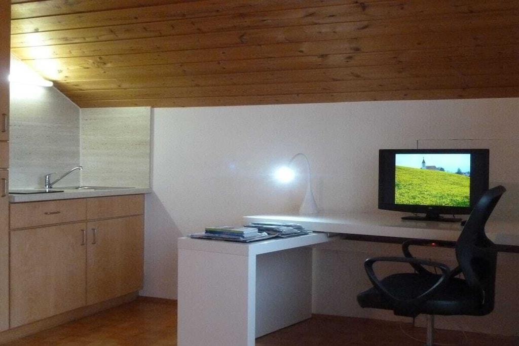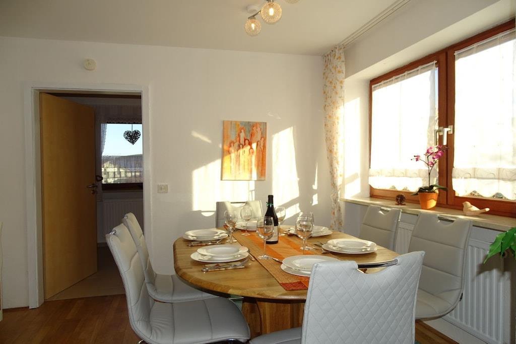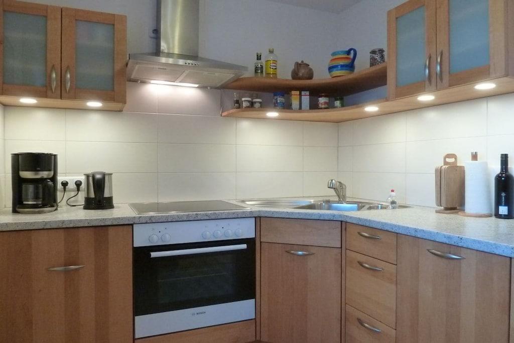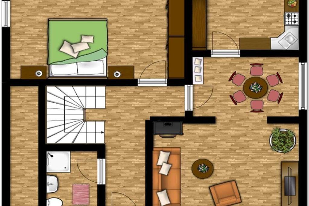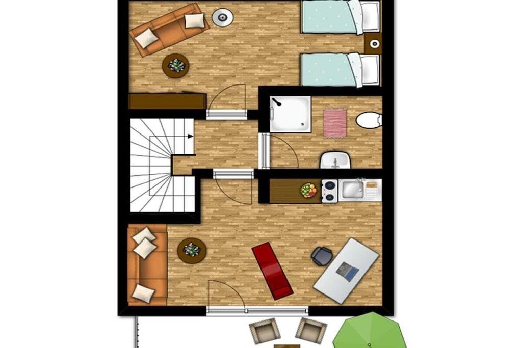 The house is certified 4-star for 4 people and sleeps 6 adults + 2 small children. It extends over 121m² over 2 floors and features a terrace and a large, mature garden with fruit trees and a herb garden – ideal for relaxation or for your children to play. The comfortably furnished living room is separated from the dining area by an archway. Next to it is the fully equipped solid wood kitchen. Two large bedrooms, two bathrooms, and a studio room with a kitchenette, pull-out sofa bed, and desk round out the high-quality furnishings. The basement features a games room and a laundry room.