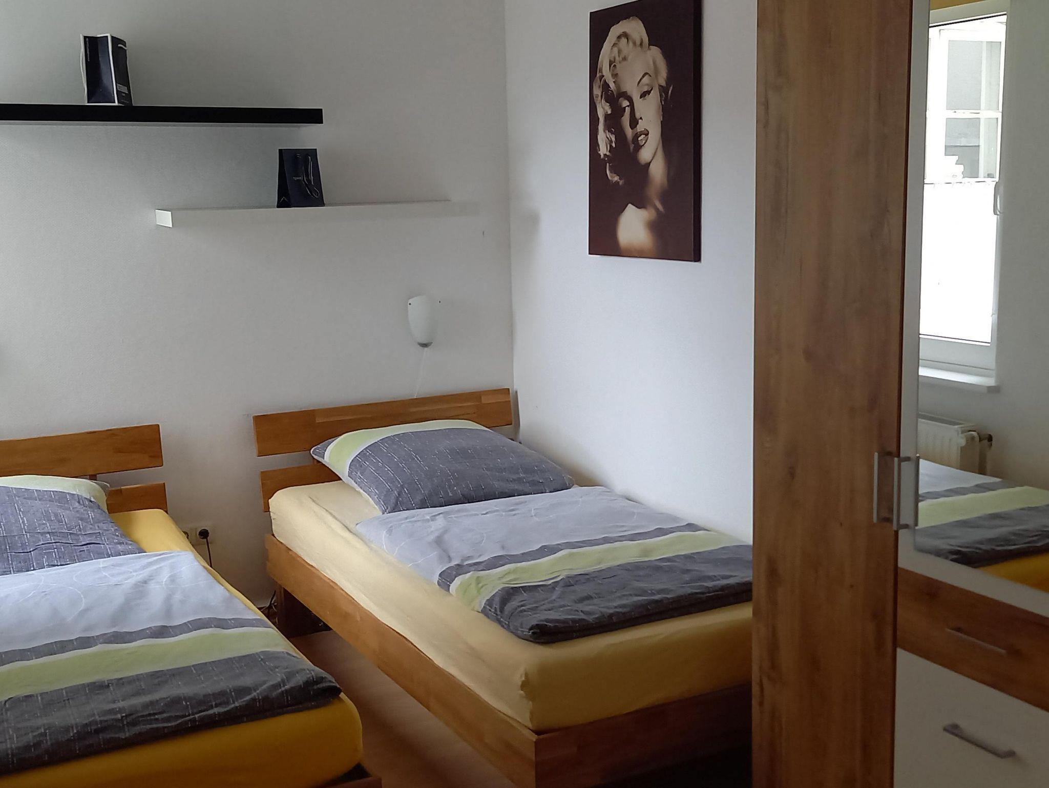 Wohnung 2 bietet mehr Raum (3 ZKBB, ca. 55 m²) und ist für 2 – 4 Personen optimal ausgestattet. Es erwartet Sie ein helles und freundliches Ambiente. Dazu zählen neben elektrischen Rollläden auch ein modern gestaltetes Bad, gemütliches Wohn- und Esszimmer und ein kleiner Balkon. Des Weiteren sind hier Internet (WLAN), ein Flachbildfernseher (Satellitenempfang) und eine gut ausgestattete Einbauküche vorhanden. Im ersten Schlafzimmer gibt es ein großes Doppelbett, im zweiten Schlafzimmer stehen 2 Einzelbetten.