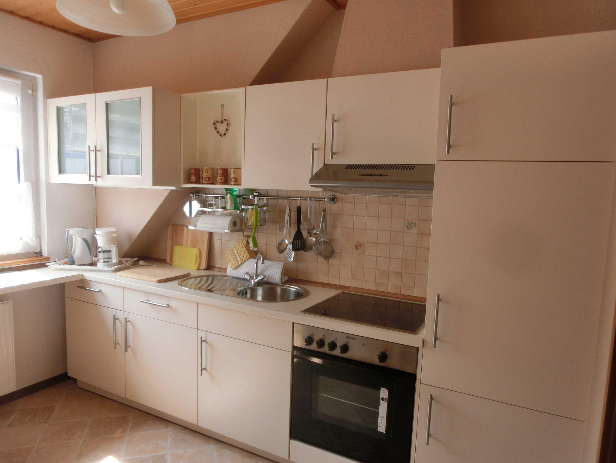 Die helle und freundliche Küche ist unter anderem mit Kaffeemaschine, Toaster, Wasserkocher, sowie Koch- und Essgeschirr vollständig eingerichtet.