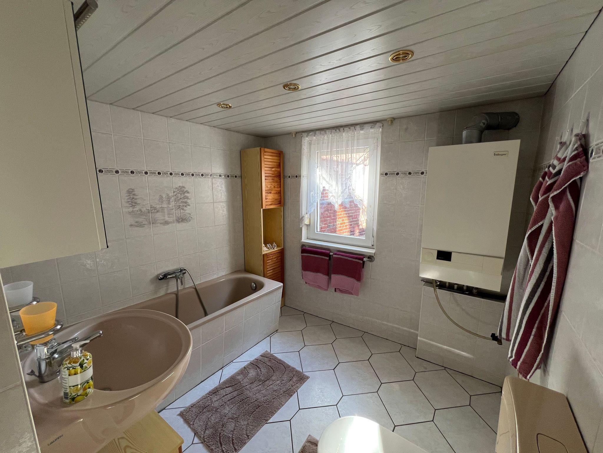 Das große, mit Badewanne und seperater Dusche versehene Badezimmer, schließt sich an der Küche an. Diese ist mit allem Wichtigen ausgestattet.