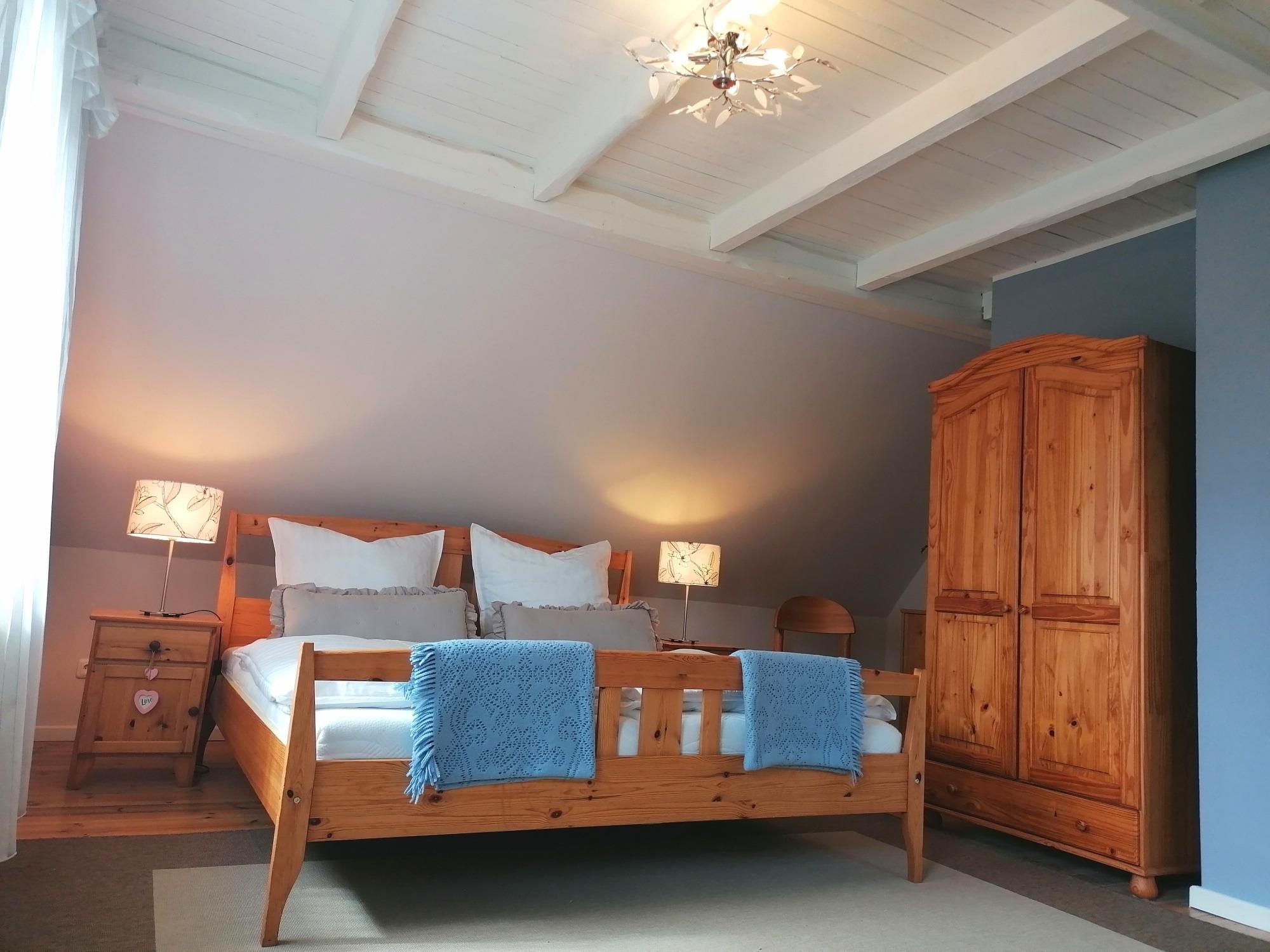 Ein geräumiges Schlafzimmer im Obergeschoss hält ein bequemes Doppelbett 1,80 x 2,00 m sowie ein Einzelbett 0,90 x 2,00 m für Sie bereit und wird ergänzt durch ein WC en Suite.