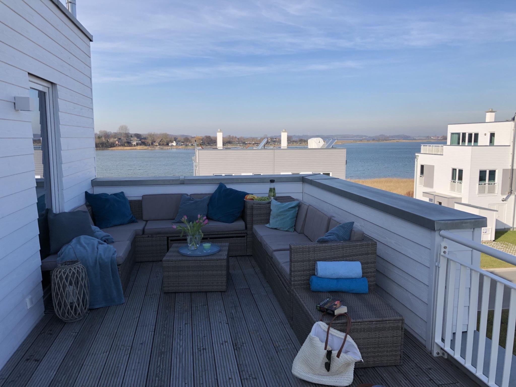 With a breathtaking view of the harbour cinema at the front and the Schlei at the back, you can enjoy the sight of the rising sun in the morning and the setting sun in the evening from our spacious terraces. Immerse yourself in the wonderful atmosphere and let yourself be enchanted by the beauty of nature.
