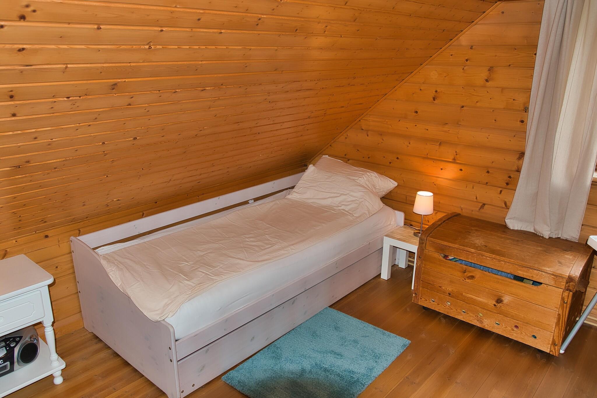 Ground floor: (open kitchen(hob(4 ring stoves, ceramic), electric kettle, toaster, hood, coffee machine(filter), oven, microwave, dishwasher, fridge), Living/diningroom(double sofa bed, TV(satellite), dining table, seating area, radio), toilet(washbasin, toilet), storage) Attic: (bedroom(single bed, single bed, single trundle bed, TV(satellite)), bedroom(double bed), bathroom(shower, washbasin, toilet)) tumble dryer(shared with other guests, paid), washing machine(shared with other guests, paid), heating(gas), terrace(roofed), garden(shared with other guests), garden furniture, parking, parking, baby crib(paid)