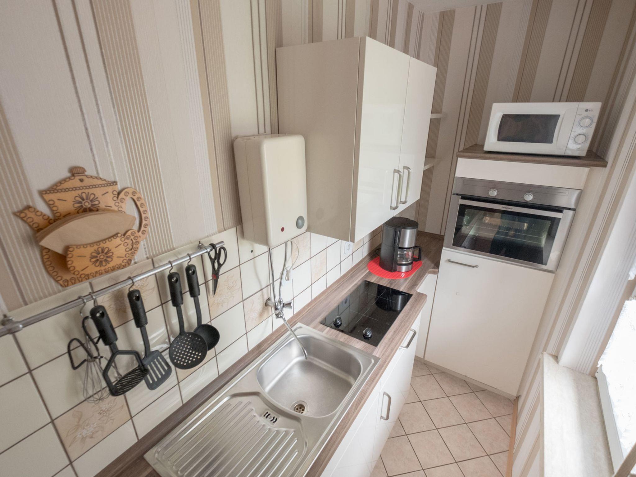 Küche mit Ceranfeld und Backofen, sowie Mikrowelle