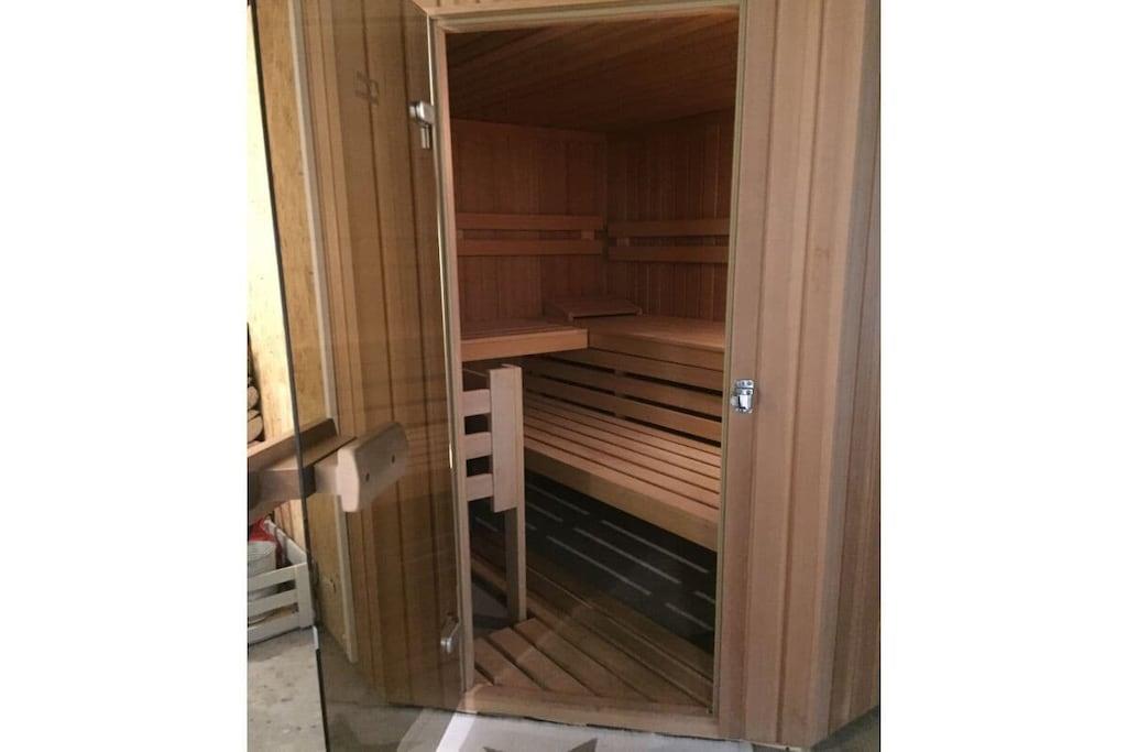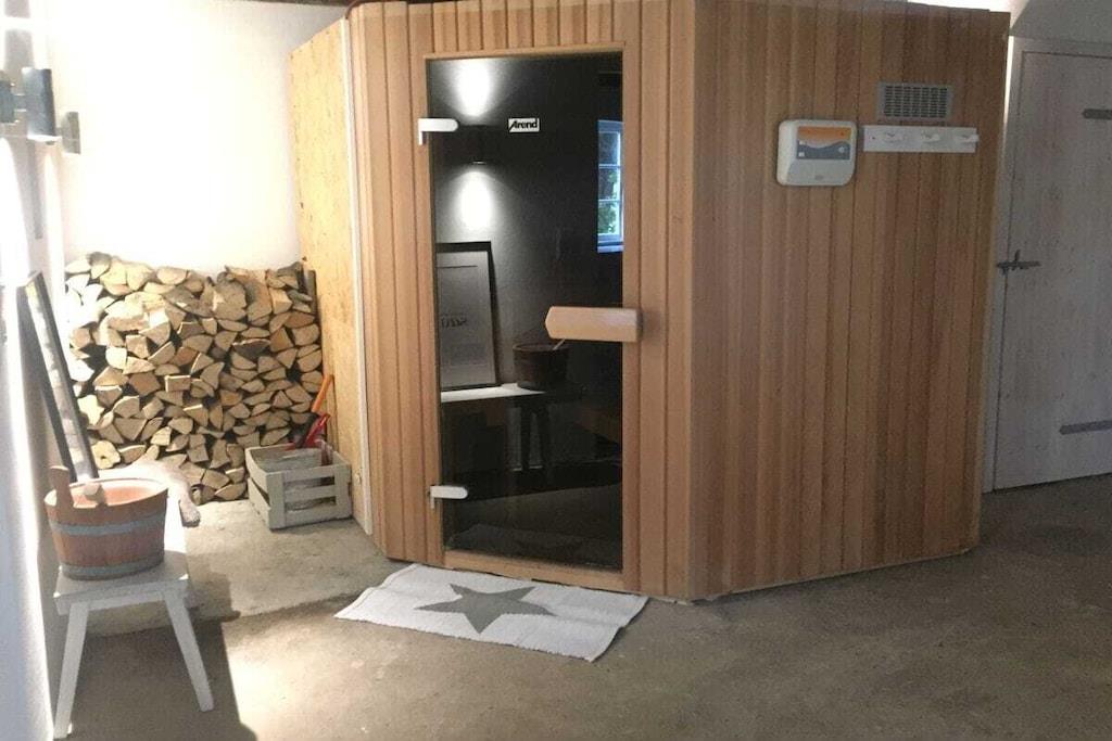 Ground floor: (Living room(Games, Sofa, TV, stove, radio, CD player), storage(Vacuum Cleaner, sauna, tumble dryer, washing machine, high chair, ironing board, iron, drying cabinet)) Fire Alarm, Hot Water, Vacuum Cleaner, Kitchen(Mixer, dining table, hob, electric kettle, toaster, coffee machine, oven, dishwasher, fridge, freezer), bedroom(Bed Linen, Wardrobe, single bed, single bed, double bed), bedroom(Bed Linen, Wardrobe, single bed, single bed, double bed), bathroom(Mirror, toilet, shower, washbasin, hairdryer), Internet access, Internet access, First Aid, tumble dryer, washing machine, terrace(Sun Umbrella, Beach, Lawn, grill, garden furniture, table football), parking, parking, ironing board, iron, drying cabinet